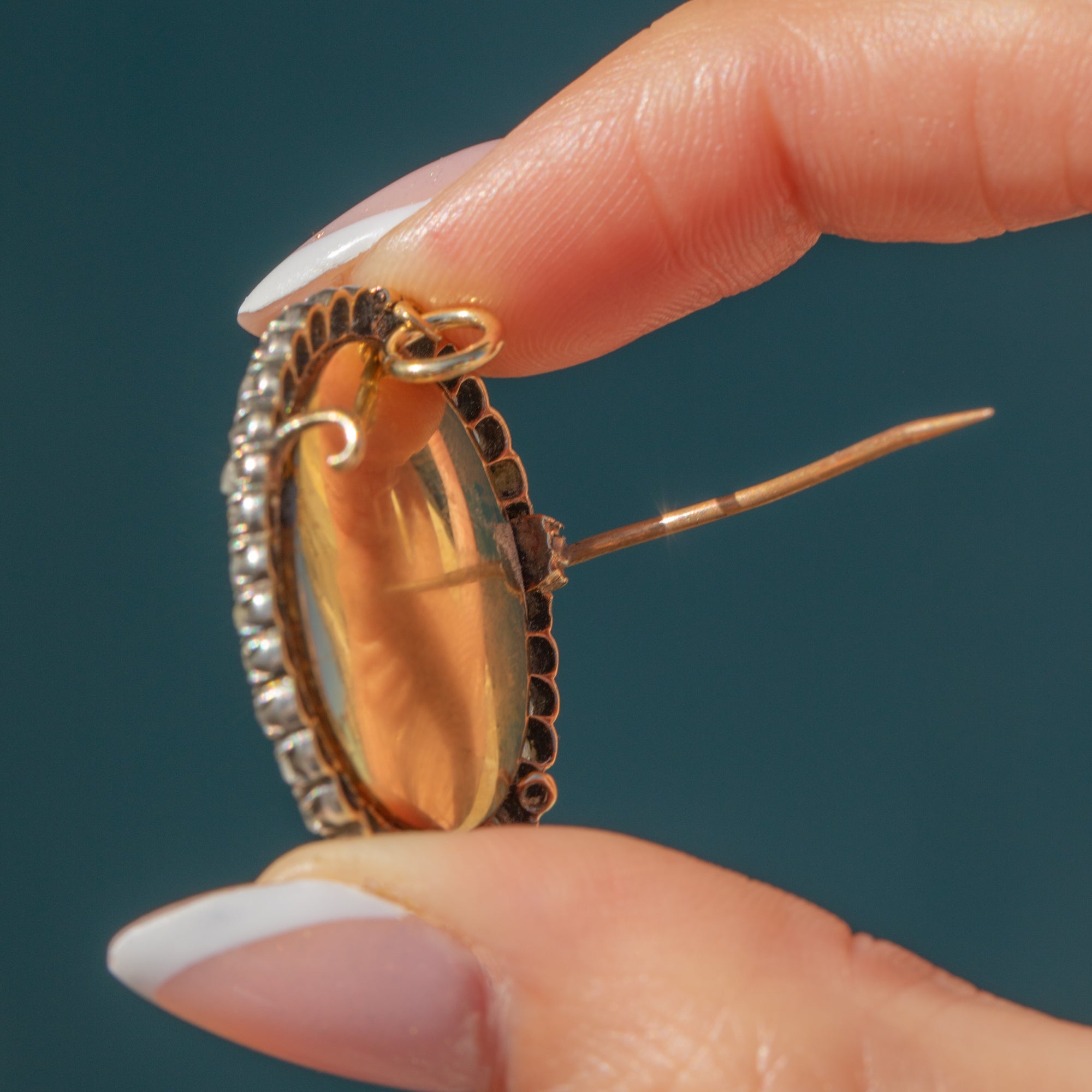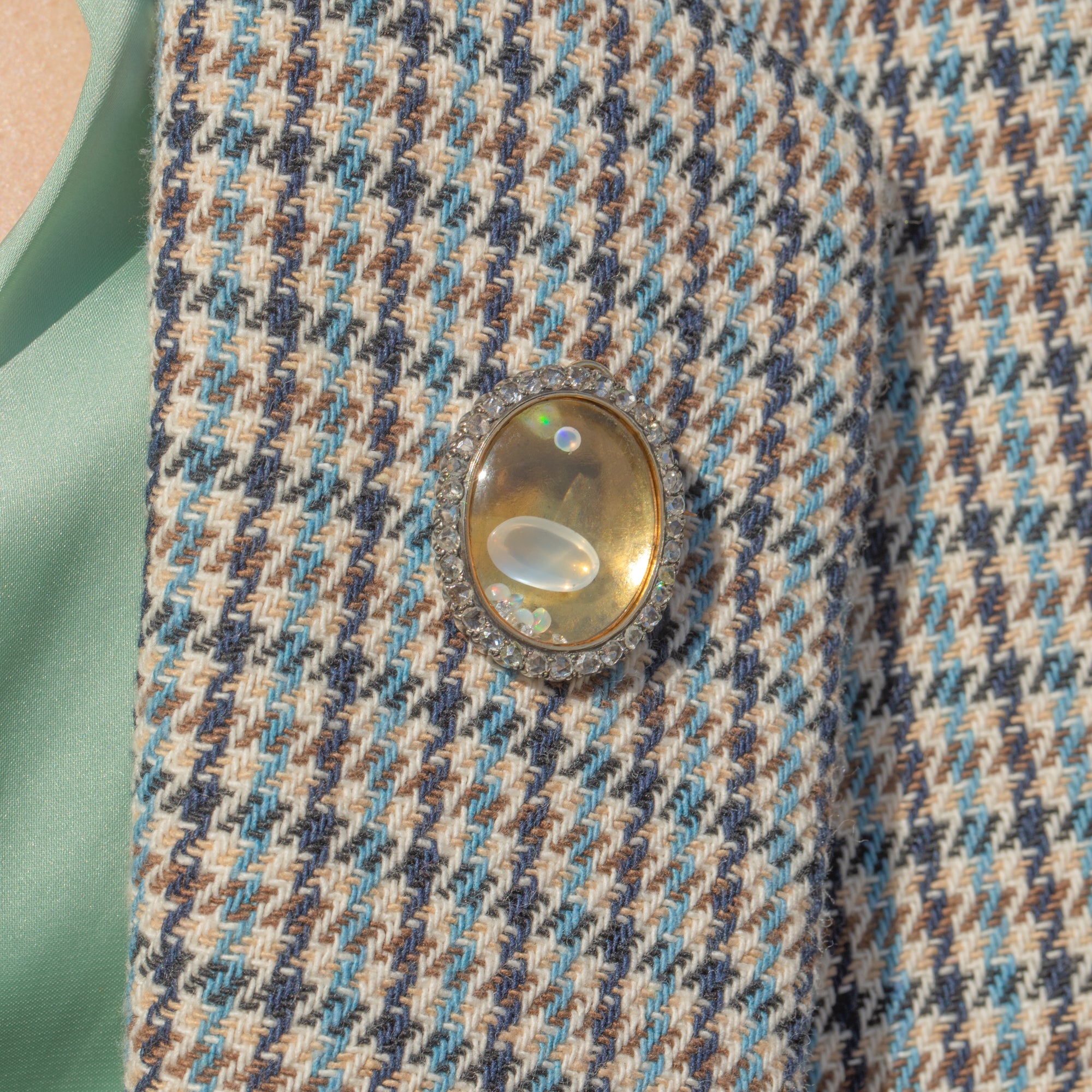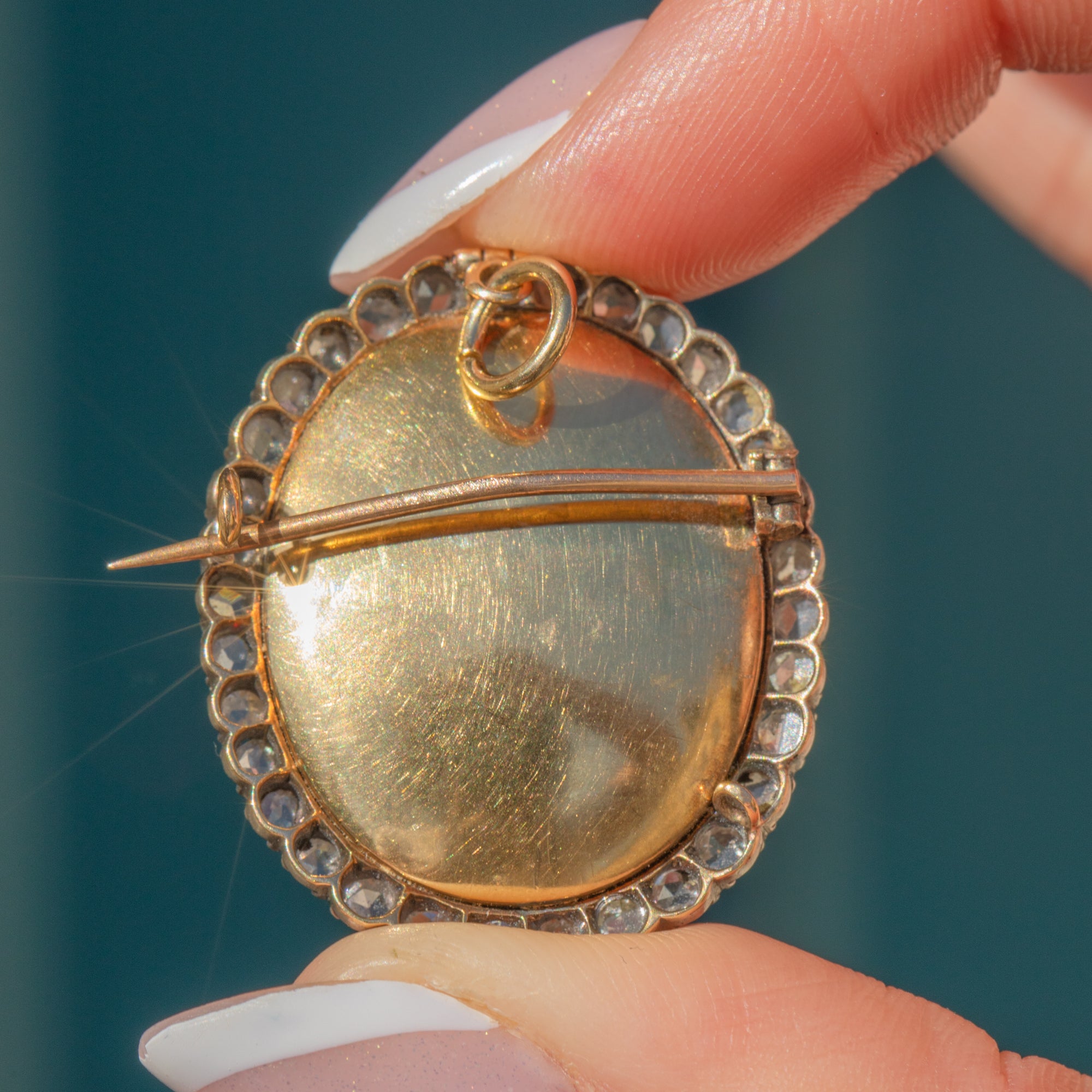 A generous sprinkling of rose-cut Diamonds wraps around the locket compartment, which is filled with loose Opals, Diamonds, and a large Moonstone cabochon, enhanced by the bright Golden backdrop. The locket can be opened and its contents added to or replaced, worn as either a pendant or a brooch- the styling possibilities are endless!