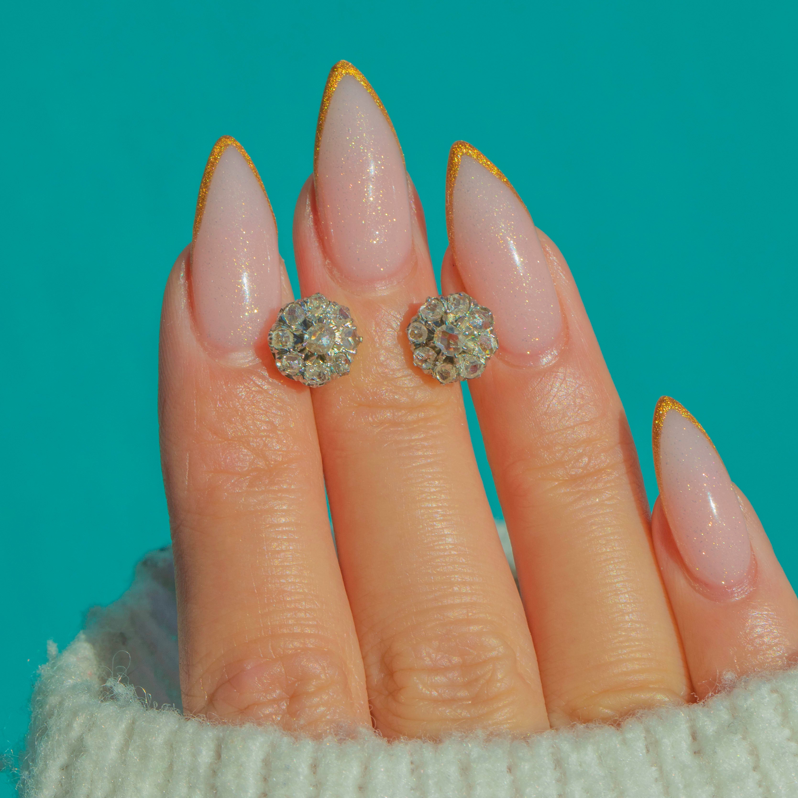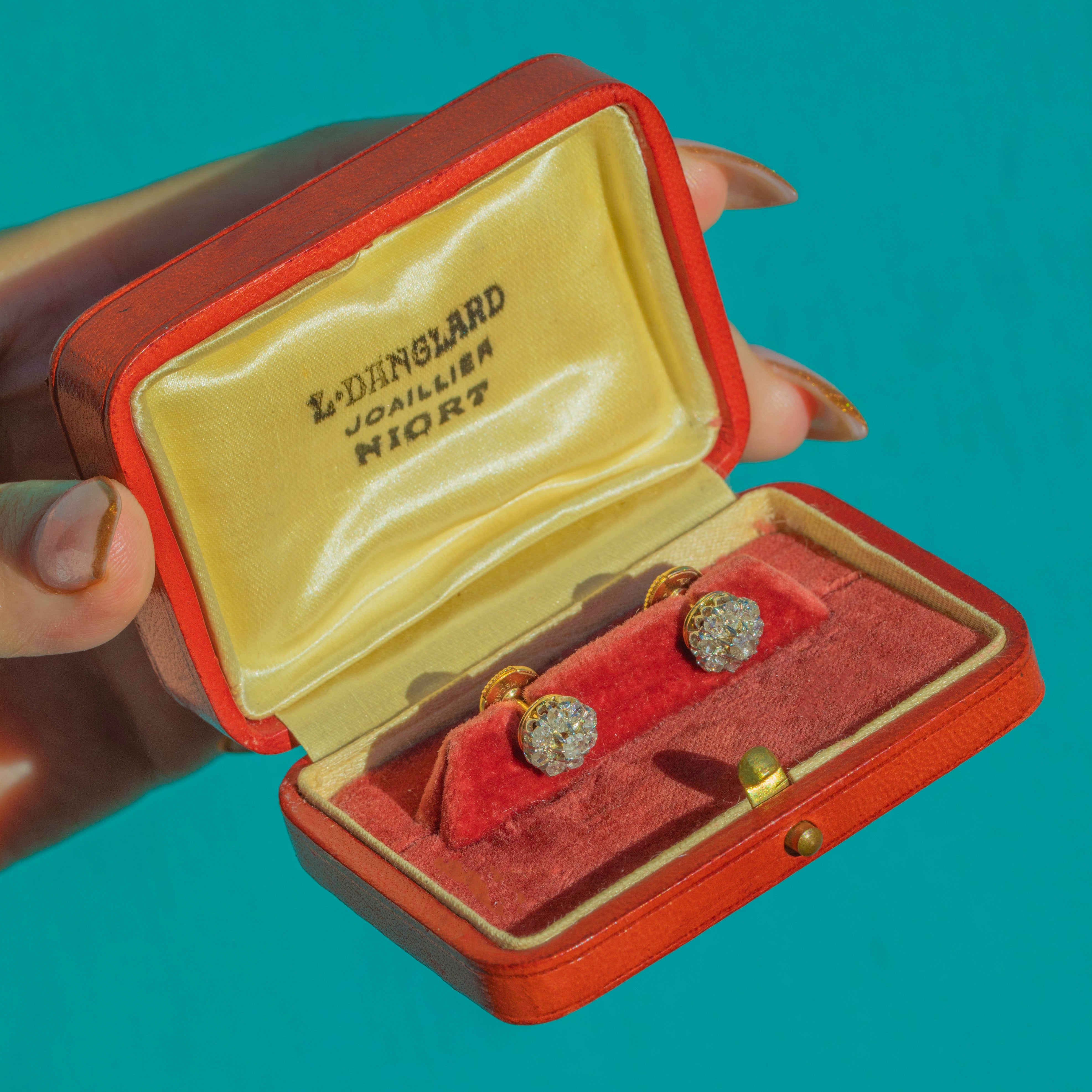 The rose-cut Diamonds have that romantic antique glow, with gently domed tops and glittering facets that catch the light beautifully. They are well-matched in colour and cut, giving a harmonious, balanced look on the ear. The studs come presented in an antique French leather earring box for that extra touch of old-world luxury.