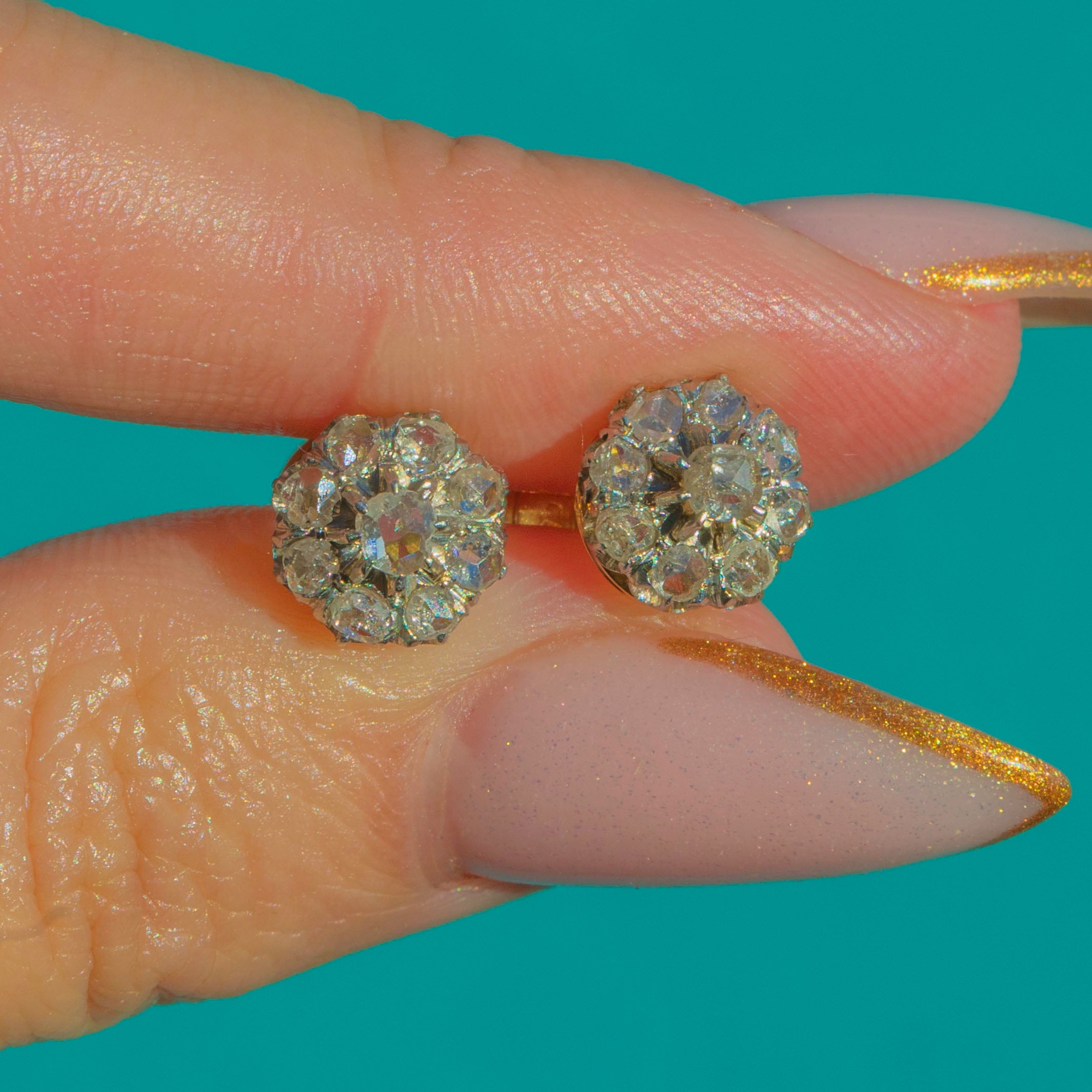 These charming Victorian cluster studs are everything we love about antique Diamonds in an easy, everyday silhouette. Each earring is formed as a pretty floral cluster, centring a slightly larger rose-cut Diamond in a halo of six smaller stones, all set in rich 18ct Gold. The result is a sparkling cushion of light that sits perfectly on the lobe.
