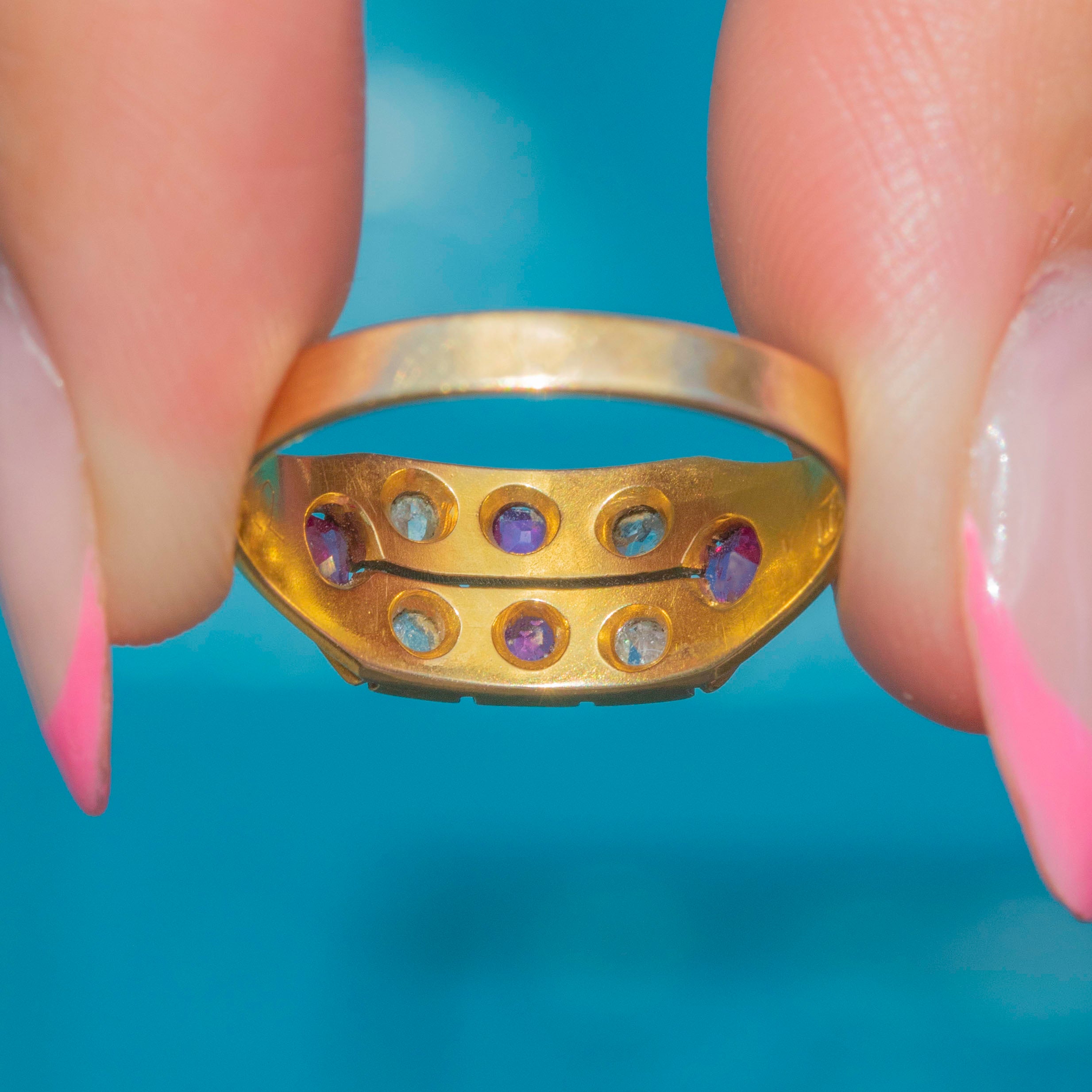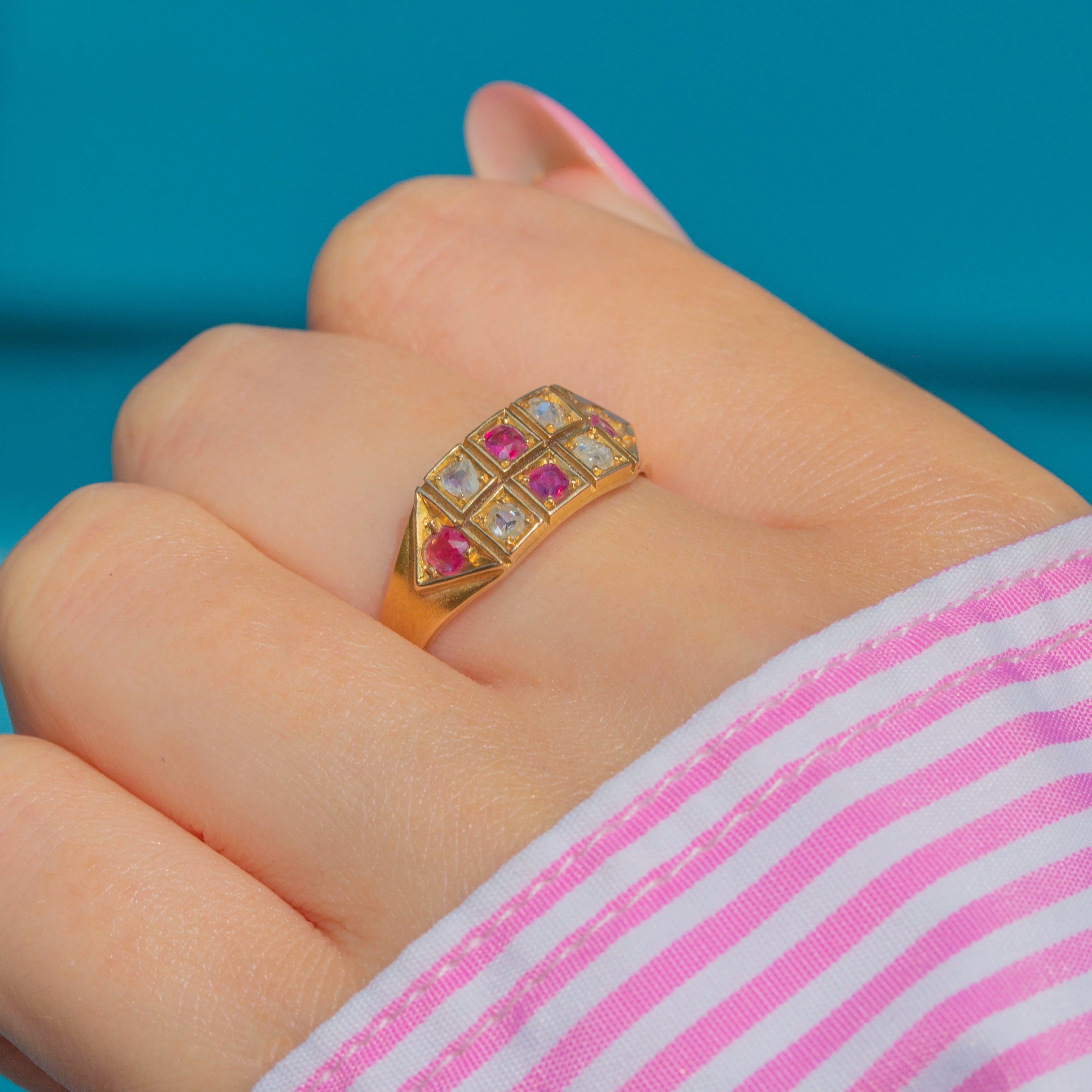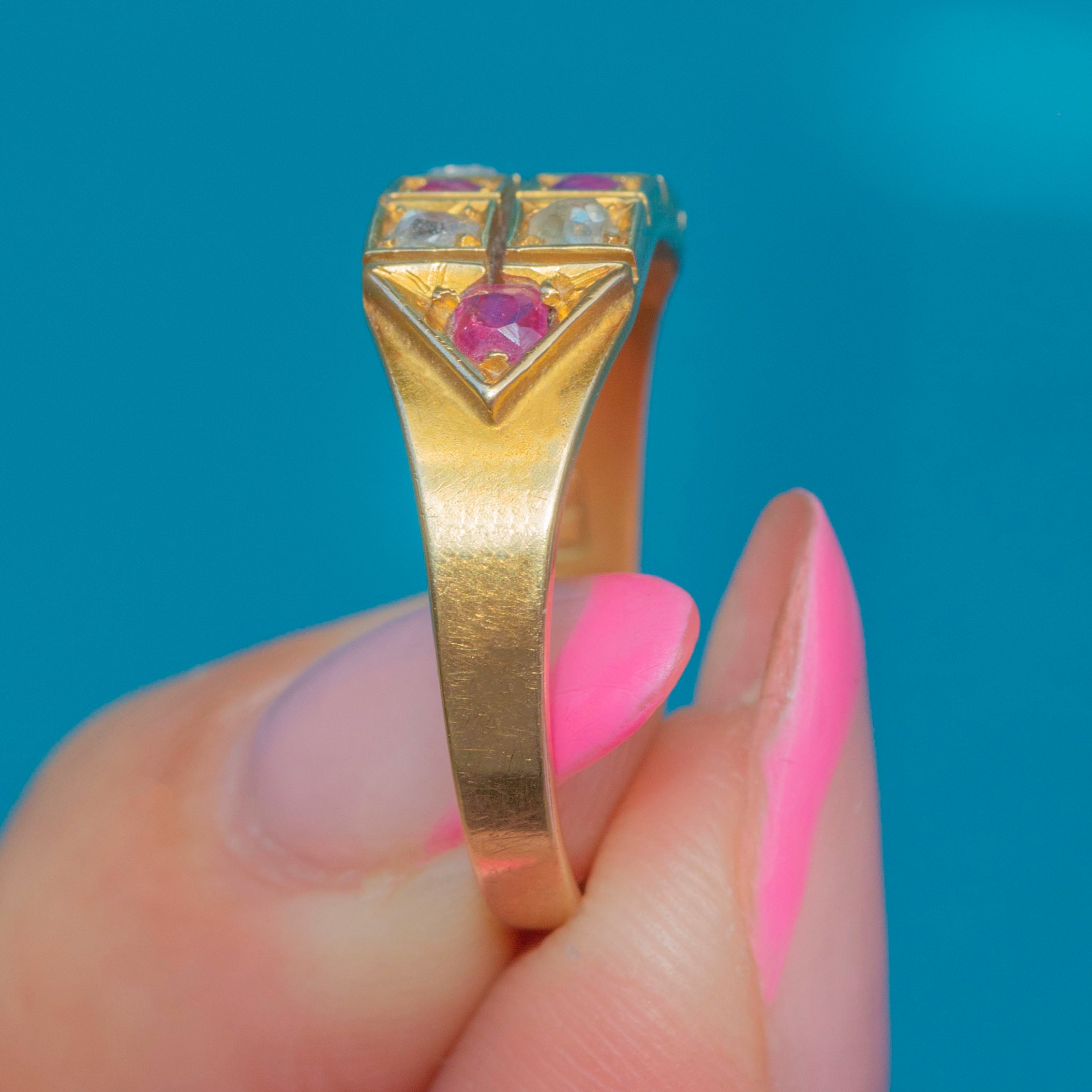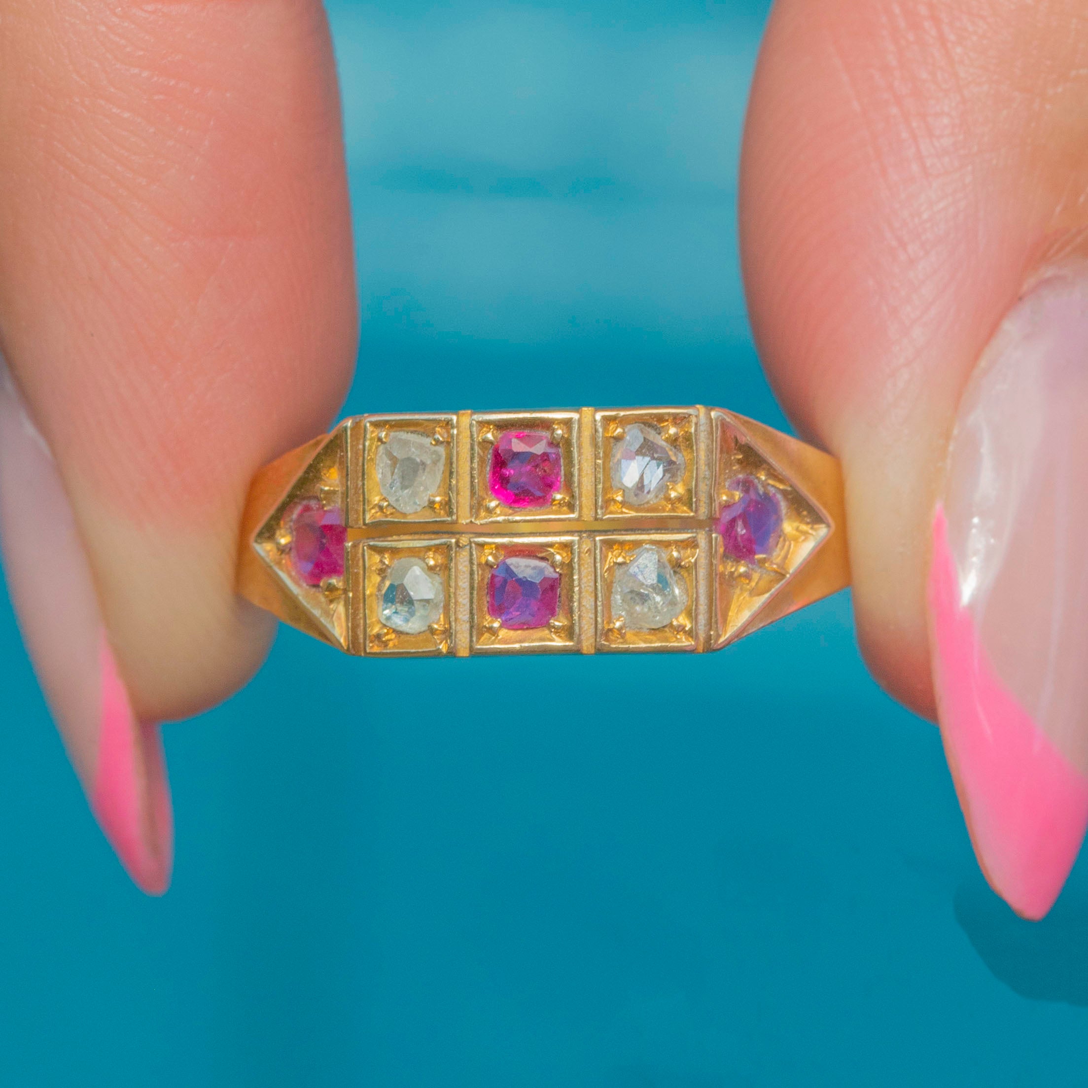 EXCELLENT: This antique 18ct Gold Ruby Diamond chequerboard ring is in excellent condition. The Gold has a bright saturation with a magnificent satin finish, and only mild age related wear visible under close inspection. The gemstones are crisply faceted and securely set, with no chips or abrasions. The chunky antique hallmarks are fully legible, allowing us to accurately date this Victorian treasure to 1876!