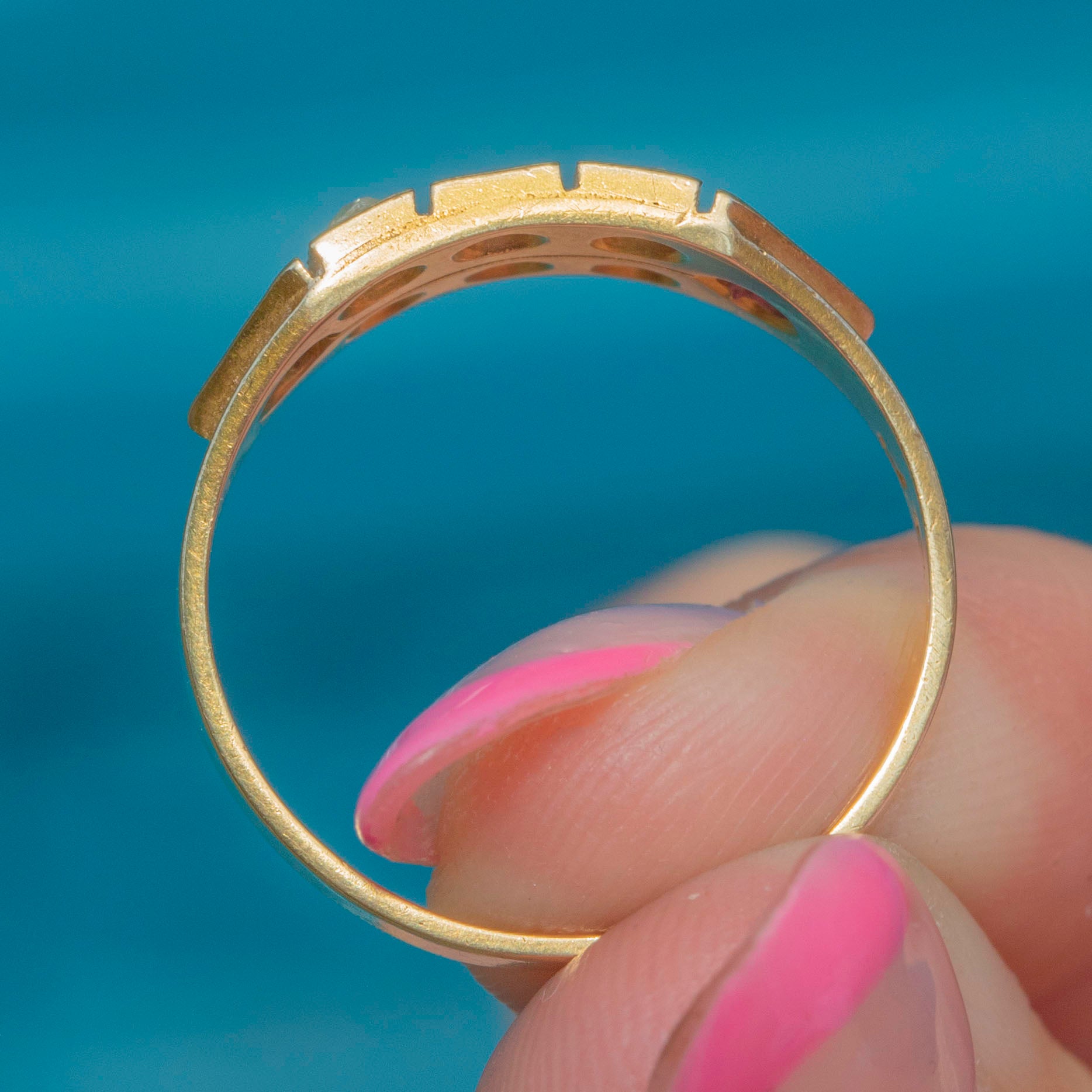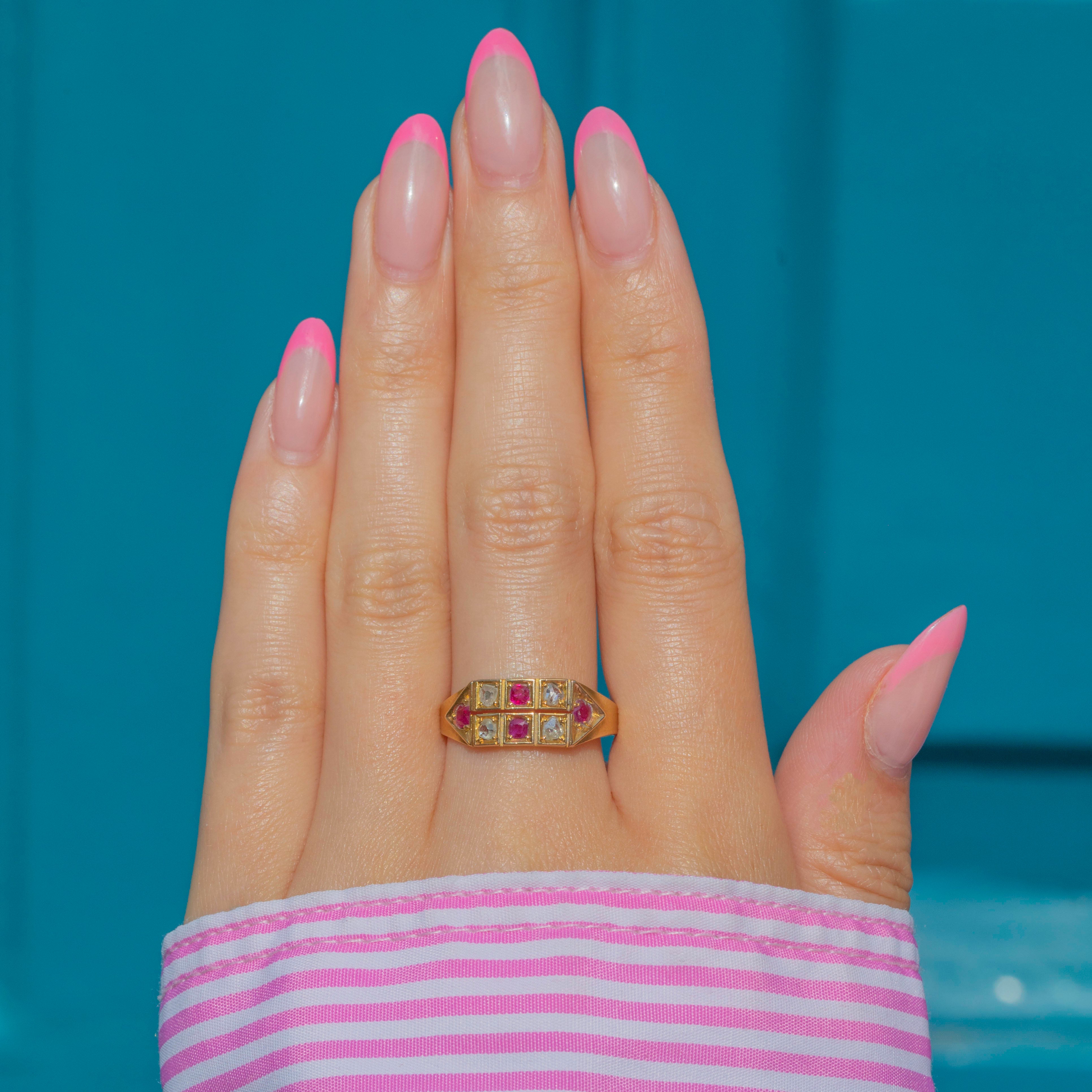 This antique 18ct Gold Ruby Diamond chequerboard ring is a delightful little treat! Crafted from radiant, solid 18ct Gold and inlaid with alternating hot pink Rubies and scintillating Diamonds in a distinct chequerboard pattern, this antique ring will make a striking adornment for your hand.