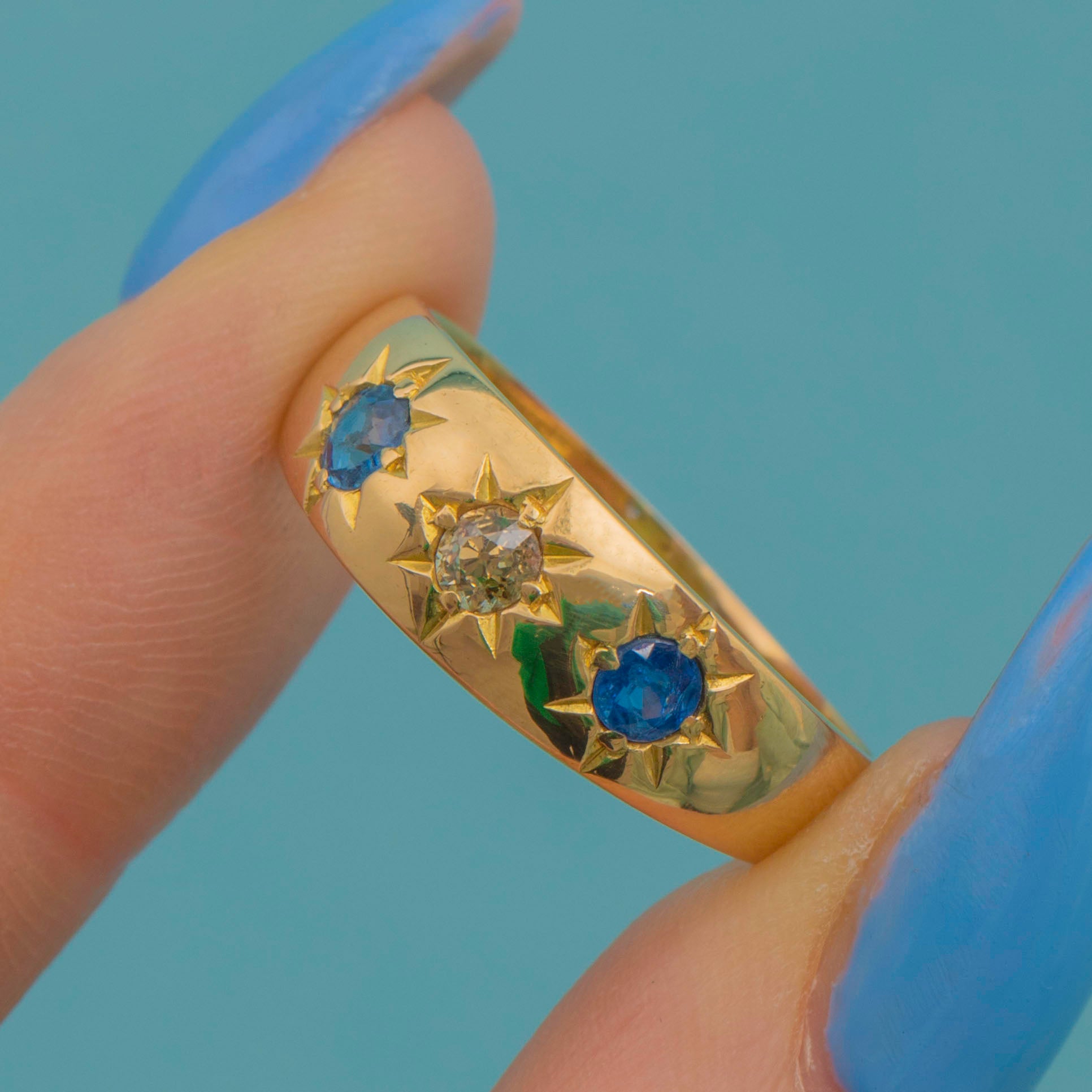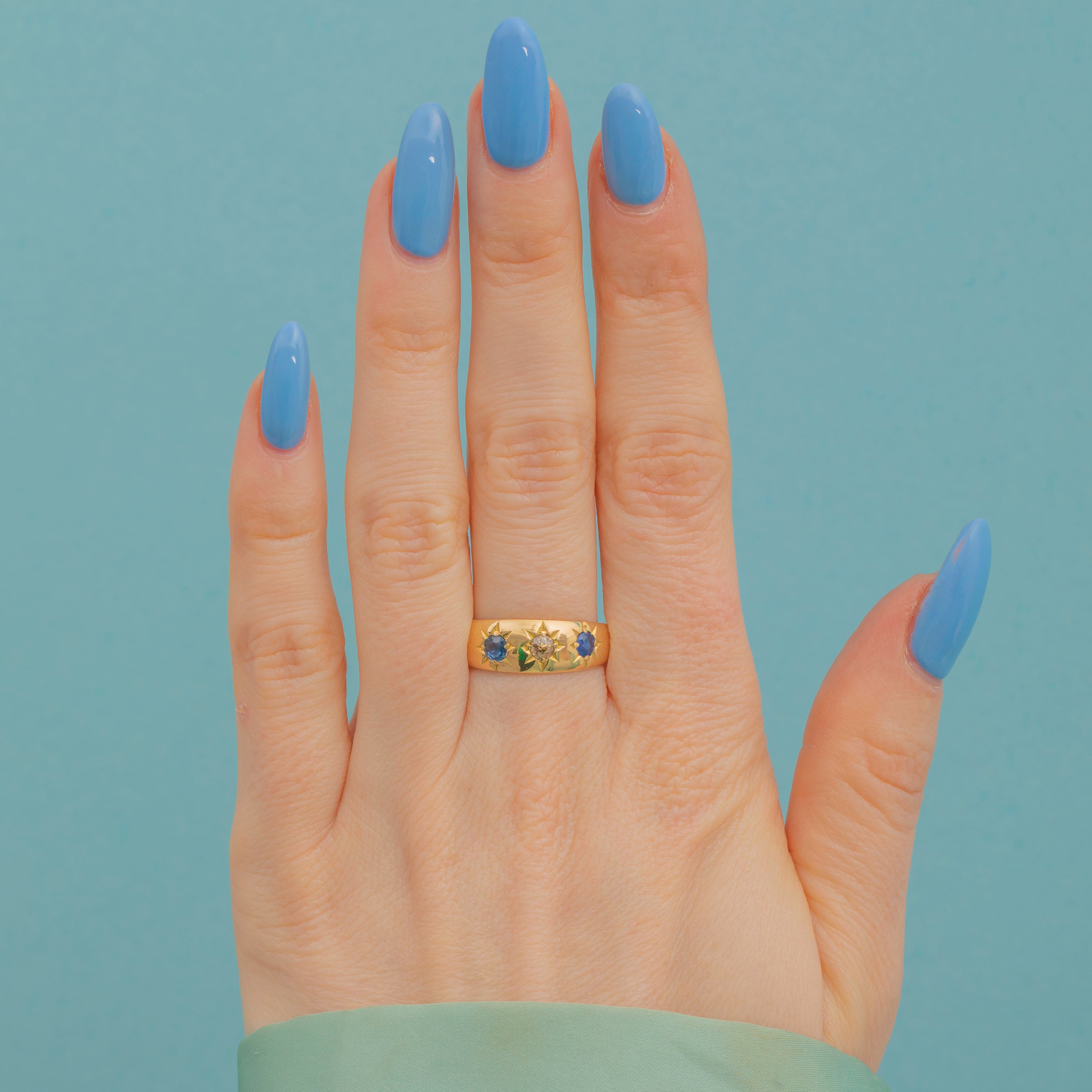 Add a touch of celestial charm to your collection with this striking antique 18ct Gold Sapphire Diamond gypsy ring! As though plucked from a midnight sky, this trilogy ring features a glimmering old-European cut Diamond flanked by two deep blue Sapphires in decorative star settings.