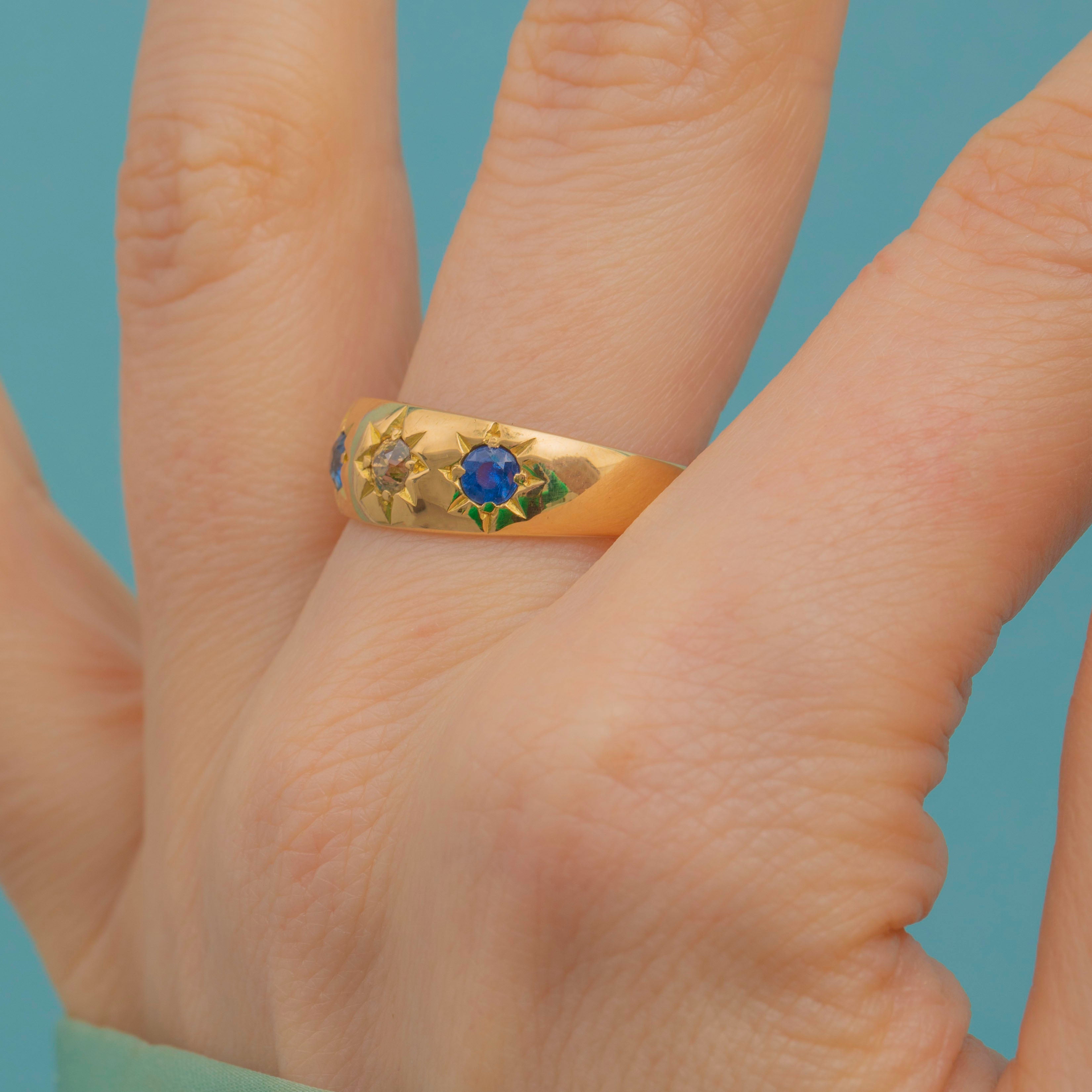 VERY GOOD-EXCELLENT. This antique 18ct Gold Sapphire Diamond gypsy ring is in wonderful condition. The Gold is saturated throughout and the band has retained its form well, with only some very minor age-related wear. The gemstones are all free from any chips or fleabites, each one securely nestled within its flush setting. Complete with a full set of antique hallmarks, this early 20th-century ring will make a fine addition to your collection!