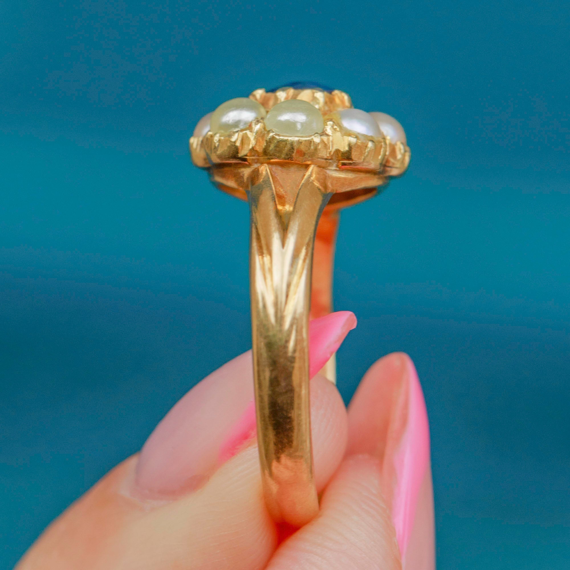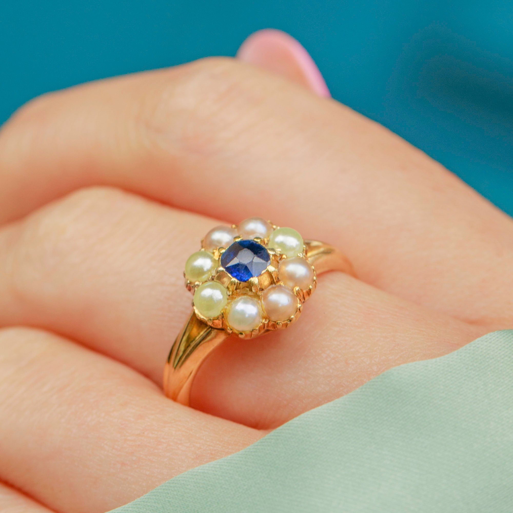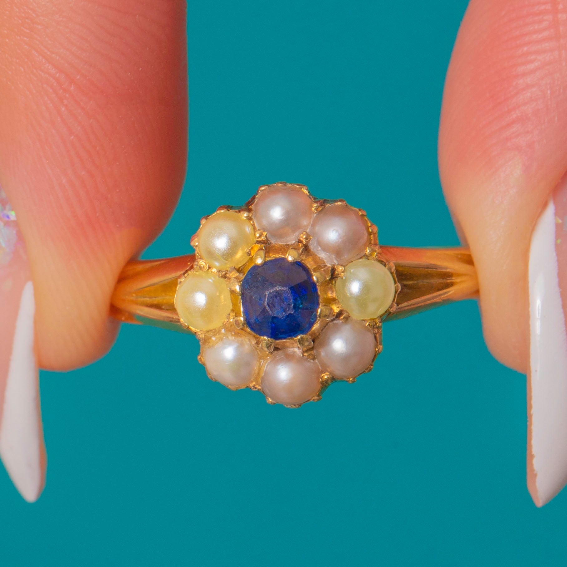 VERY GOOD-EXCELLENT: This antique 18ct Gold Sapphire Pearl cluster ring is in lovely condition. The Sapphire shows no signs of wear and is secure in her 18ct Gold setting. There is a beautiful lustre to the Pearls and some colour variation between them, but if anything, this adds to her antique charm. There is slight evidence of re-sizing at the back of the band, which is subtle and can't be seen when worn. The Gold has a wonderful saturation and the band is smooth and comfortable to wear!