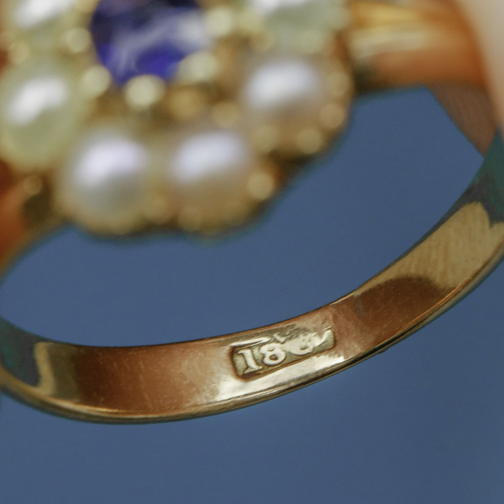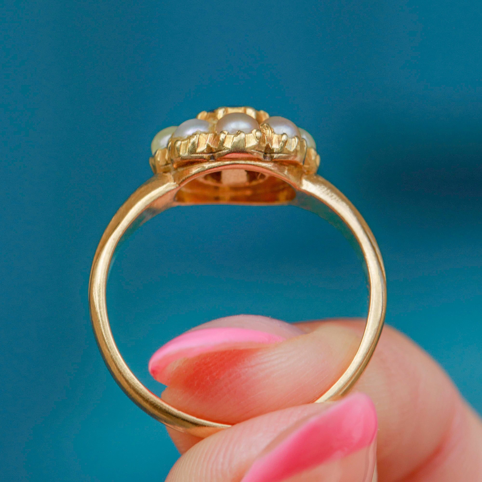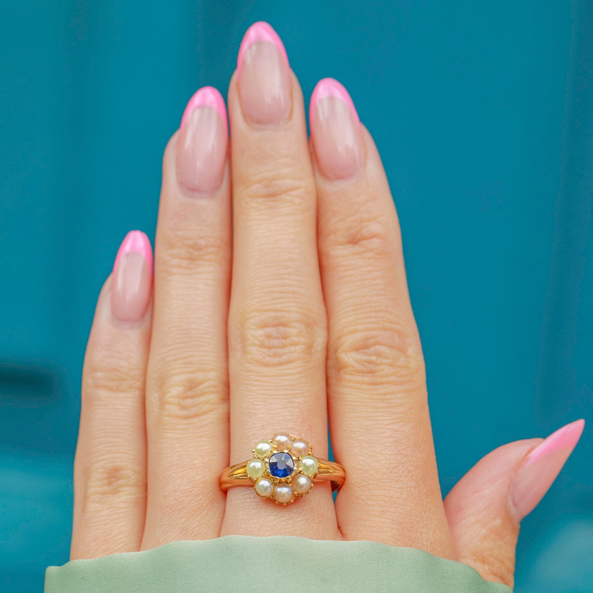 VERY GOOD-EXCELLENT: This antique 18ct Gold Sapphire Pearl cluster ring is in lovely condition. The Sapphire shows no signs of wear and is secure in her 18ct Gold setting. There is a beautiful lustre to the Pearls and some colour variation between them, but if anything, this adds to her antique charm. There is slight evidence of re-sizing at the back of the band, which is subtle and can't be seen when worn. The Gold has a wonderful saturation and the band is smooth and comfortable to wear!
