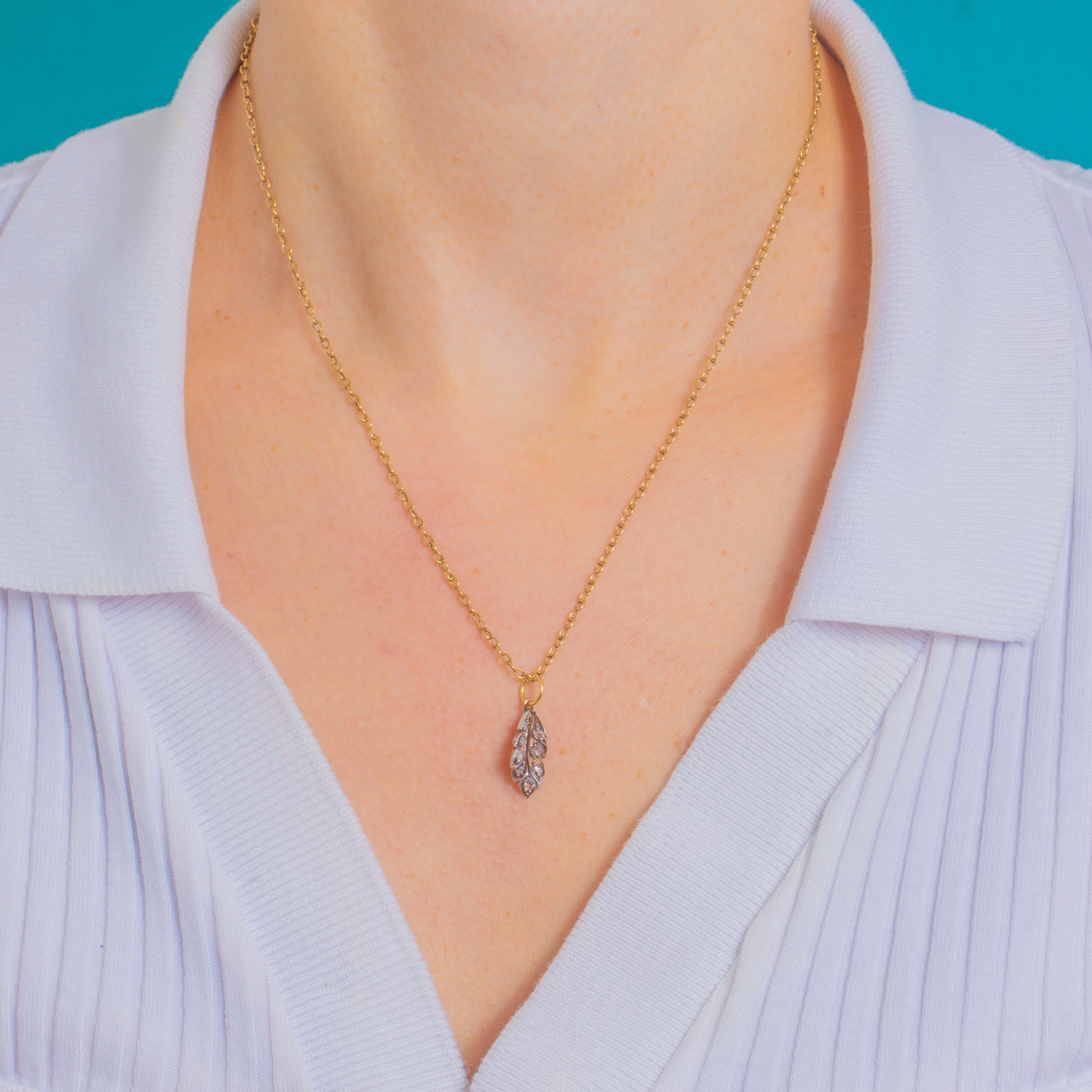 A delicate Victorian treasure, this petite leaf charm is fashioned in a beautiful two‑tone palette of Silver and 18ct Gold and set throughout with twinkling rose-cut Diamonds. Each tiny stone is individually bead set, tracing the naturalistic veins and serrated edges of the leaf for a softly scintillating, botanical finish.