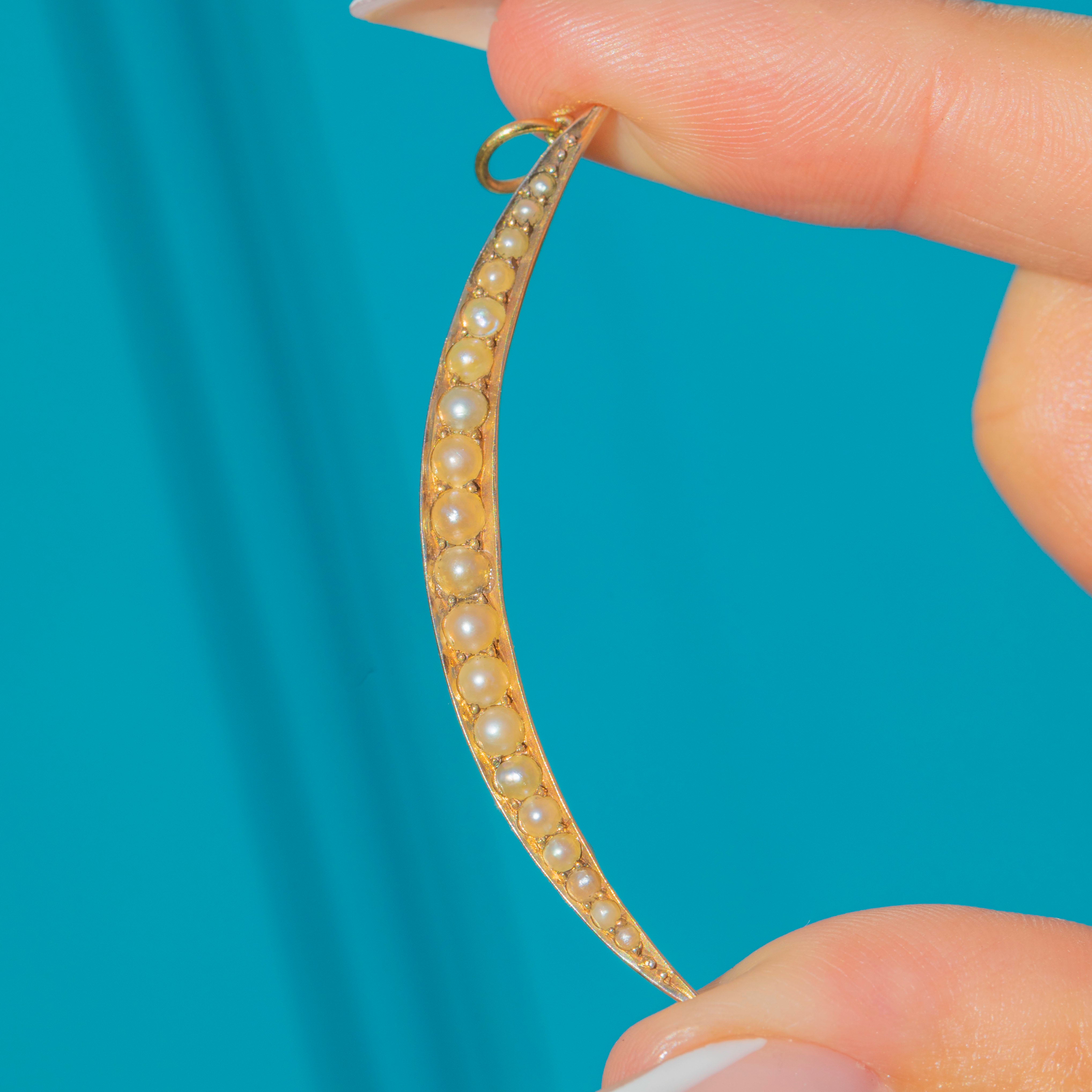 This Antique Victorian crescent moon pendant is crafted in rich 18ct Gold and set with a row of lustrous natural Pearls. The Pearls graduate in size from 1.3mm to 2.5mm in diameter, creating a delicate taper that accentuates the elegant arc of the crescent. On the reverse, a charming star detail adds a hidden flourish of craftsmanship typical of Victorian jewellery.