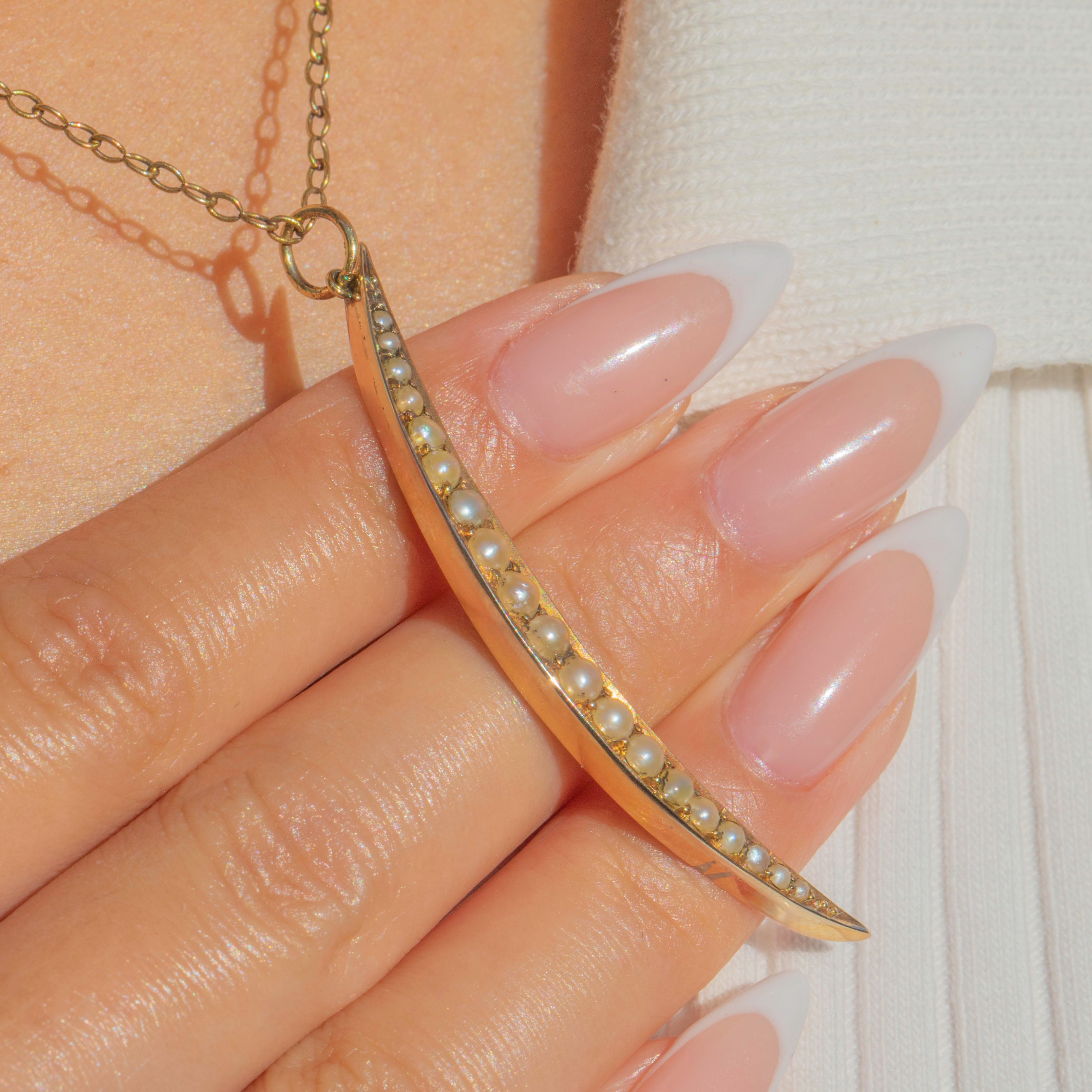 Antique 18ct Gold Skinny Pearl Crescent Moon Pendant