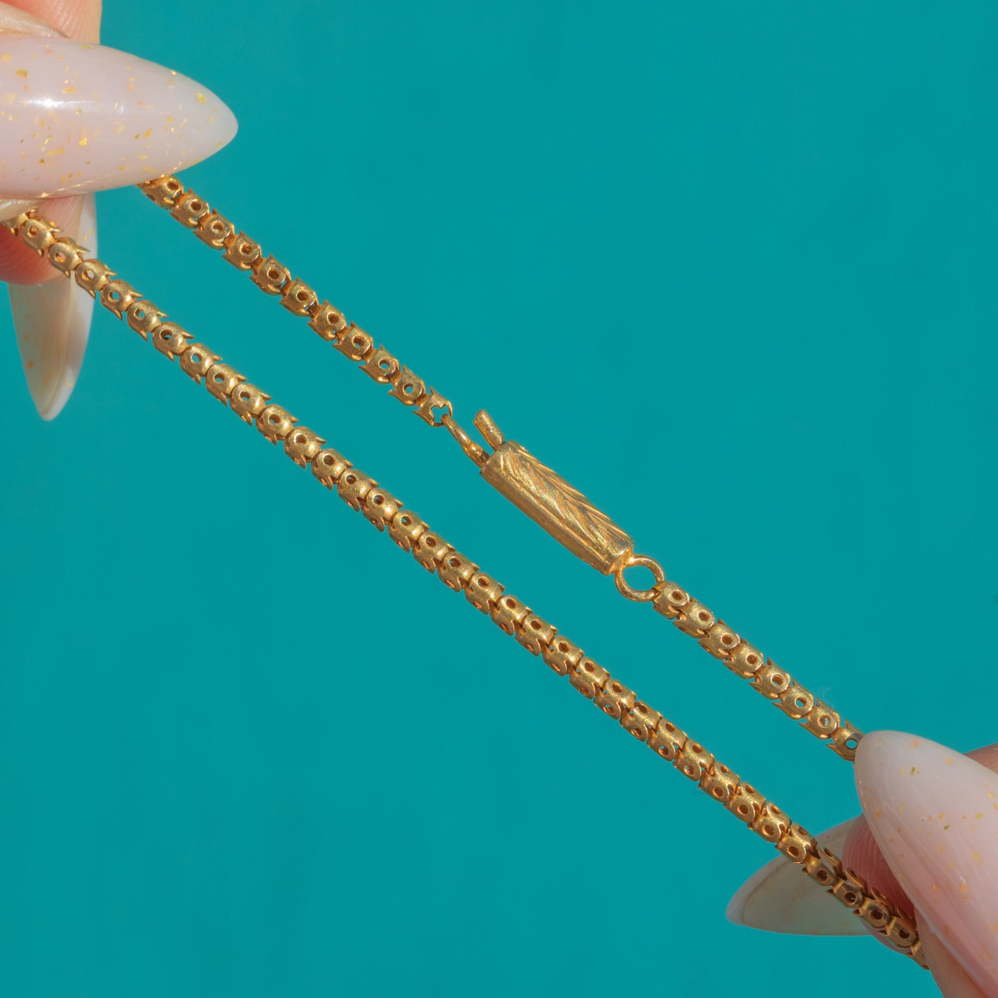 EXCELLENT: The Gold shows a bright polish with only light surface wear and a gentle, even patina consistent with age. The serpent and chain are intact with no dents, losses or visible repairs. The engraved barrel clasp remains crisp and secure.