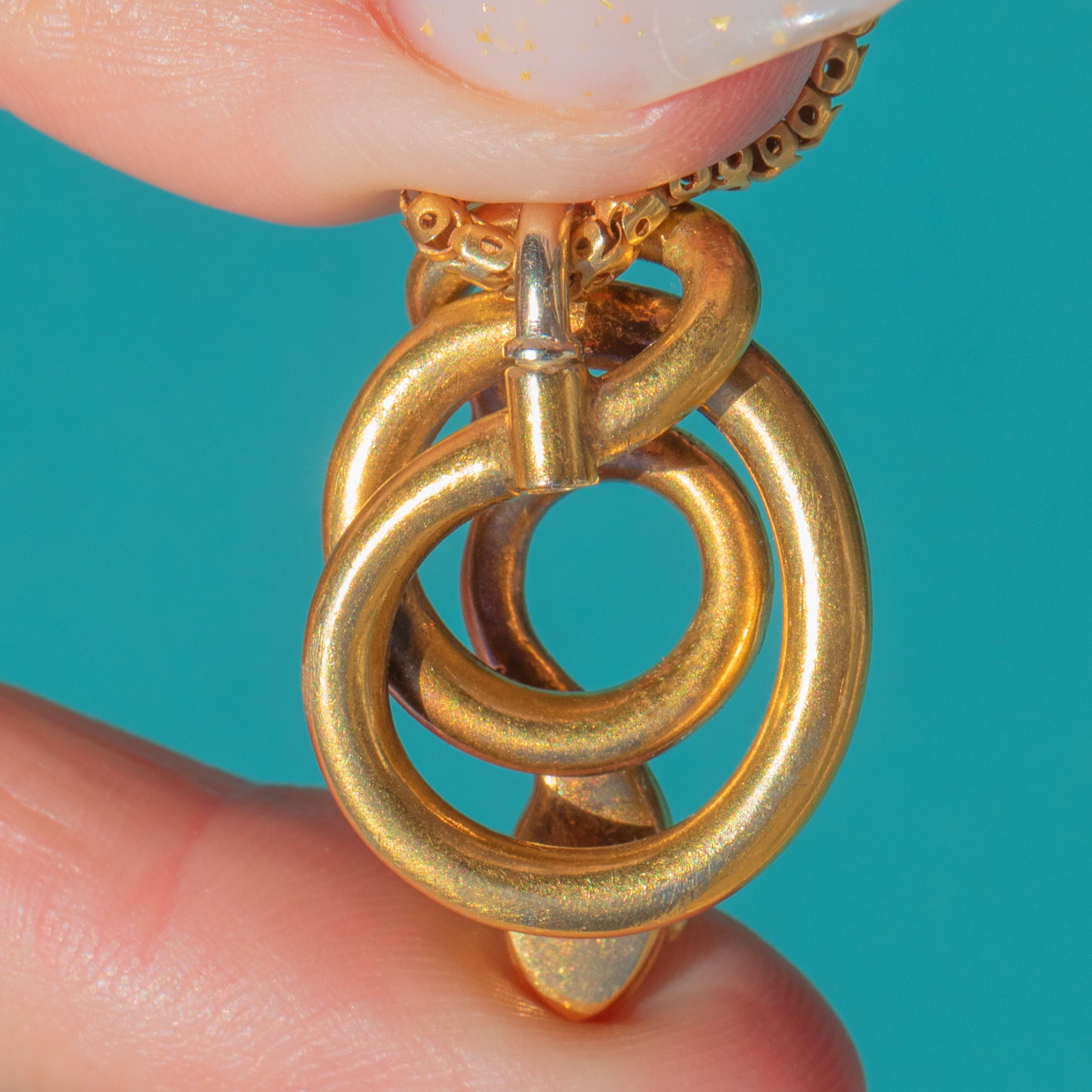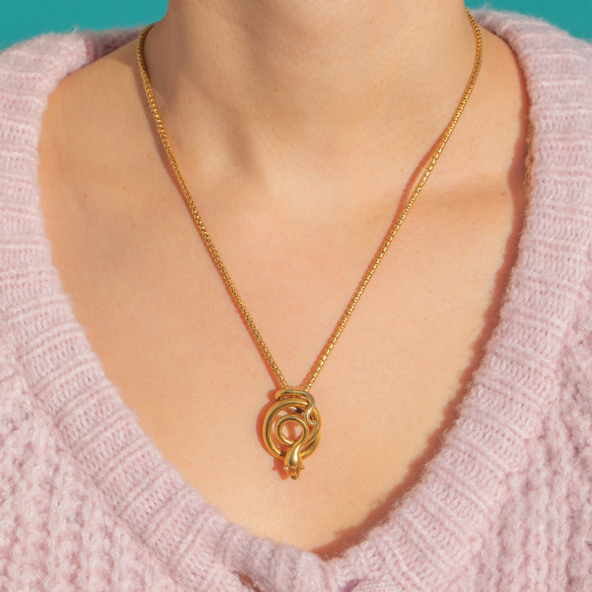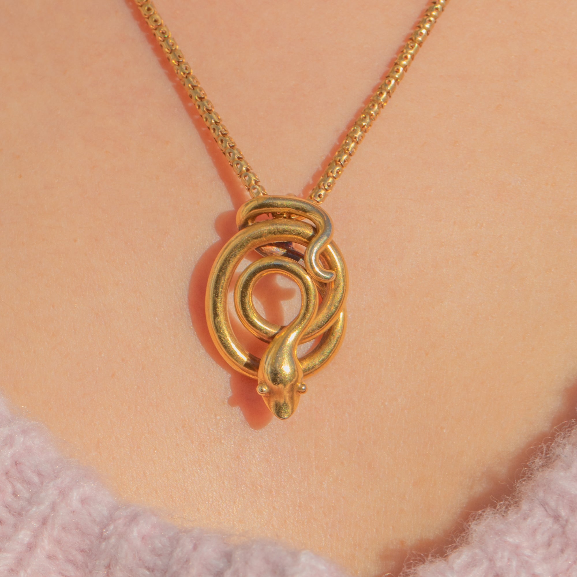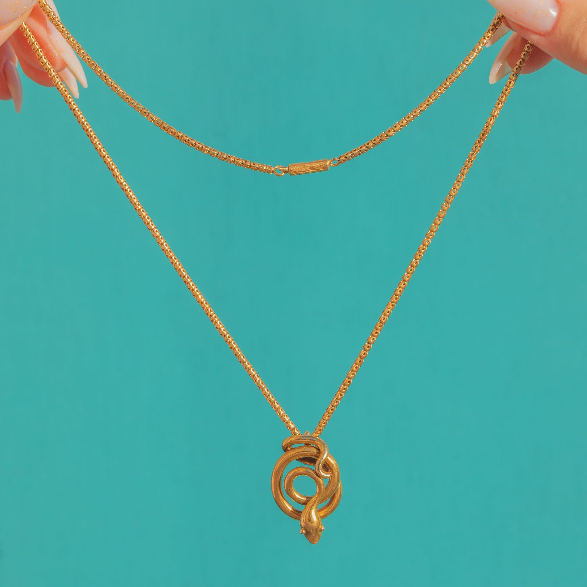 The pendant is paired with a fine 15ct Gold box chain, secured by an engraved barrel clasp—a quintessential period detail that complements the serpent’s refined minimalism. A timeless emblem of eternal love and protection, this is a chic Victorian classic ready to wear every day.