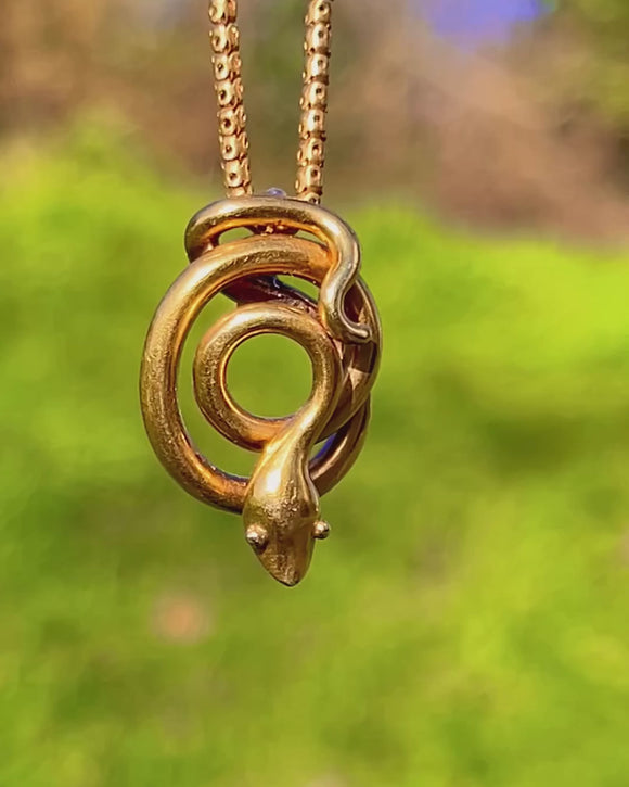 Sleek, symbolic and beautifully sculptural, this Victorian 18ct Gold snake pendant coils into a smooth, compact loop with tiny engraved eyes and an integrated top coil bail. Its polished surfaces gleam with a warm antique patina for that effortless, talismanic allure.