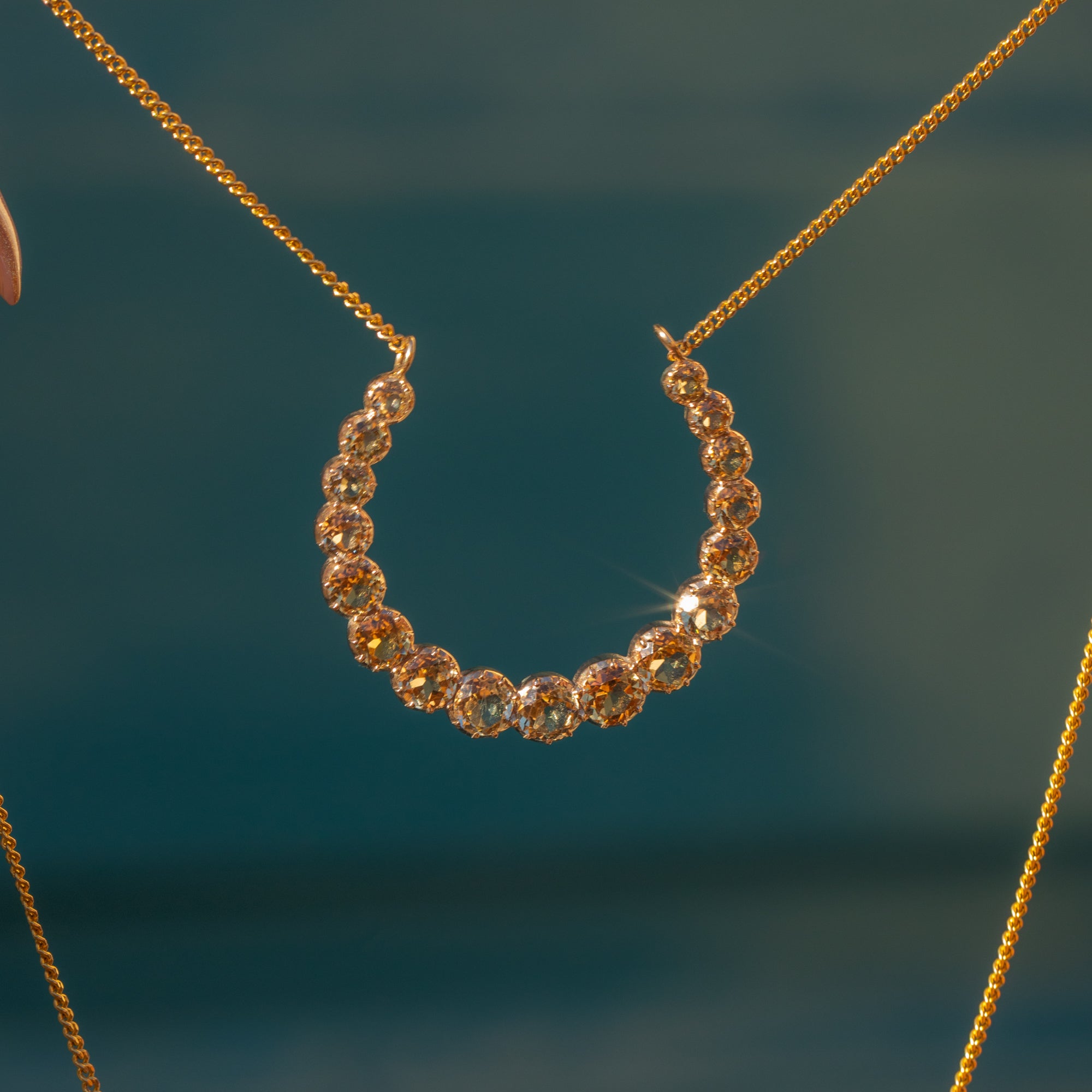 This dreamy Victorian crescent moon necklace is set with a glowing row of pale champagne Topaz, graduating gently around the curve for a soft, sparkling shimmer. The stones are collet-set in warm 15ct Gold, giving that classic mid-19th century look with a refined, minimal profile that sits beautifully at the collarbone.