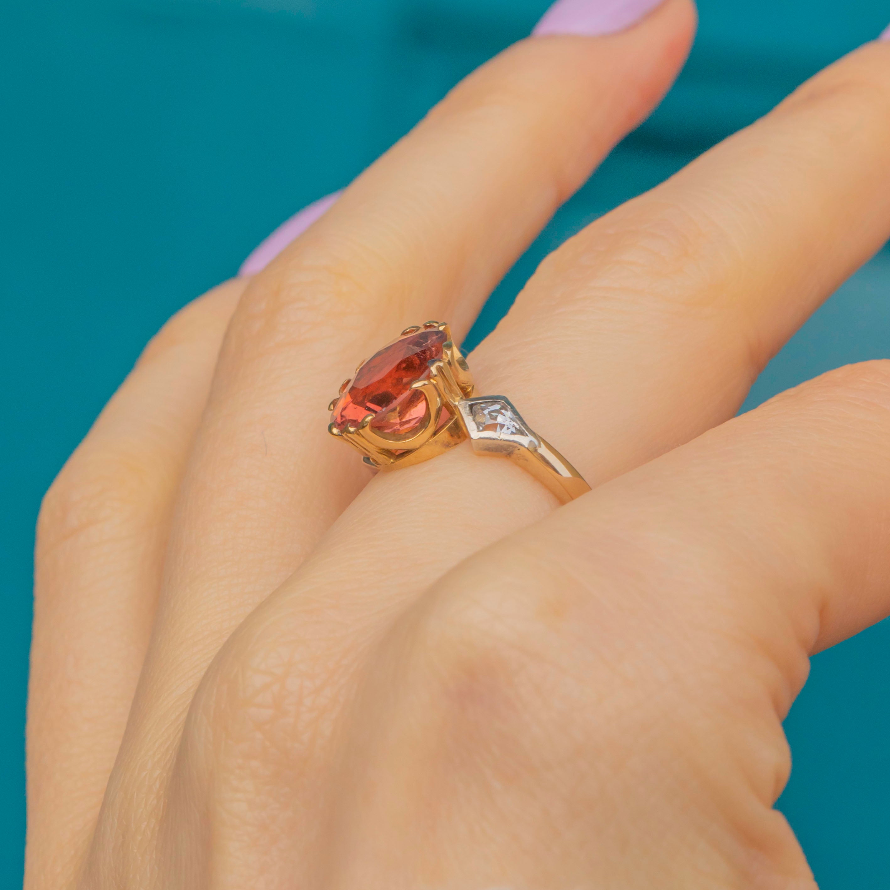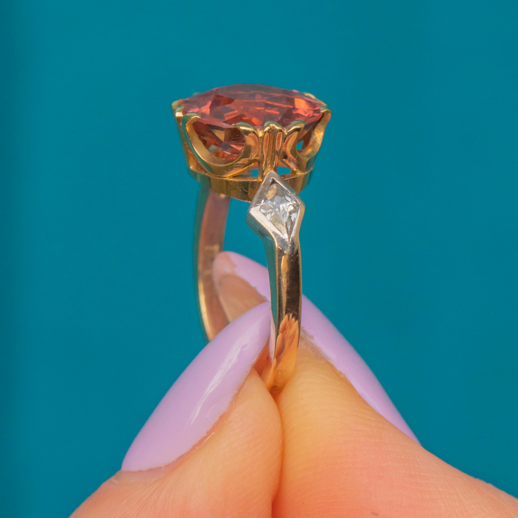 This outstanding antique 18ct Gold Tourmaline Diamond three stone ring will instantly bring the wow factor to your outfit! As it moves in the light, the impressive 3.00ct red Tourmaline displays spectacular hues of crimson and burnt orange that dance across its crisp, hand-cut facets, flanked by Diamond shoulders that allow the gemstone trilogy to span the width of your finger.