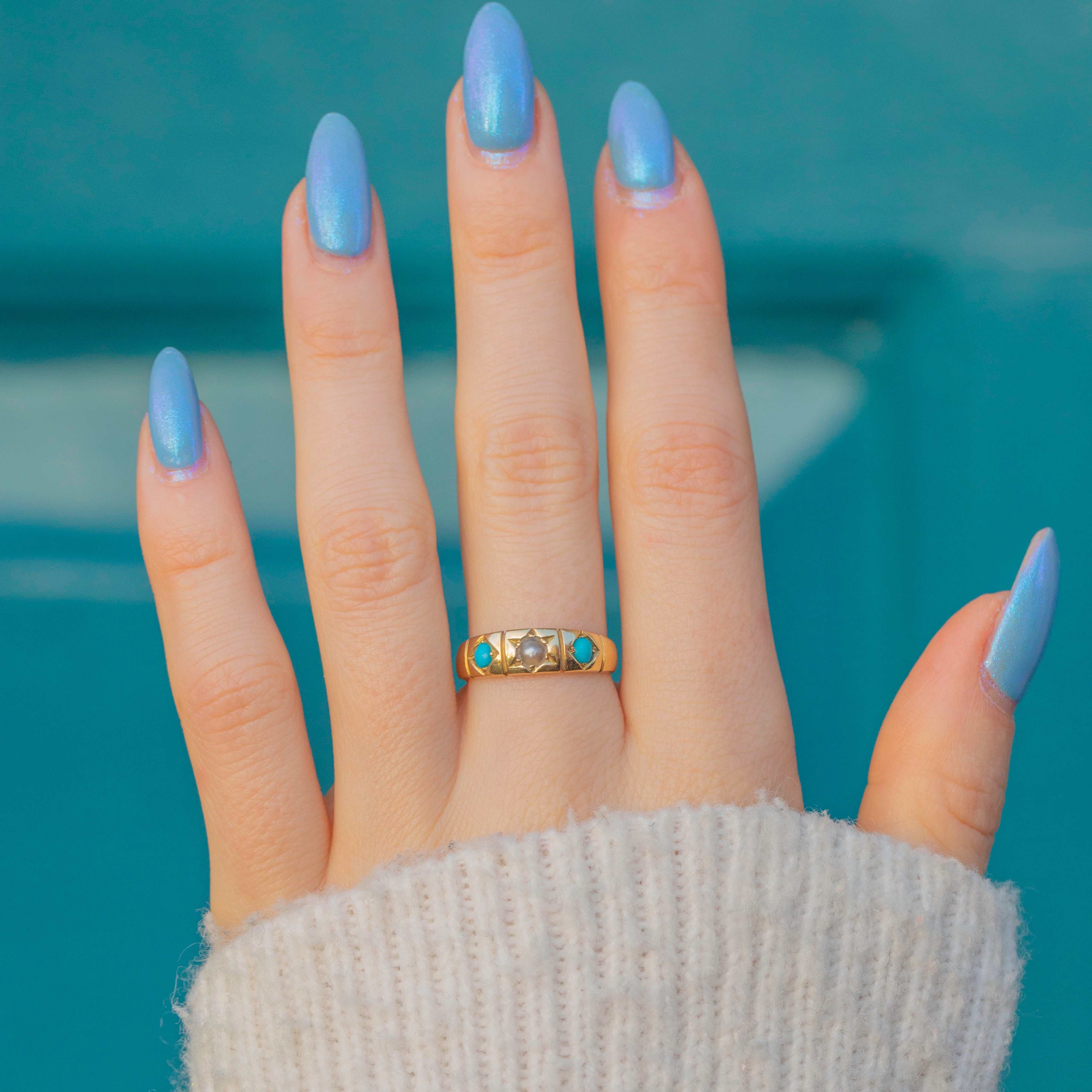 white Pearl, flaked by two peacock blue Turquoise stones, complemented by the rich 18ct Gold! This antique gypsy ring will soon become a firm favourite of yours!