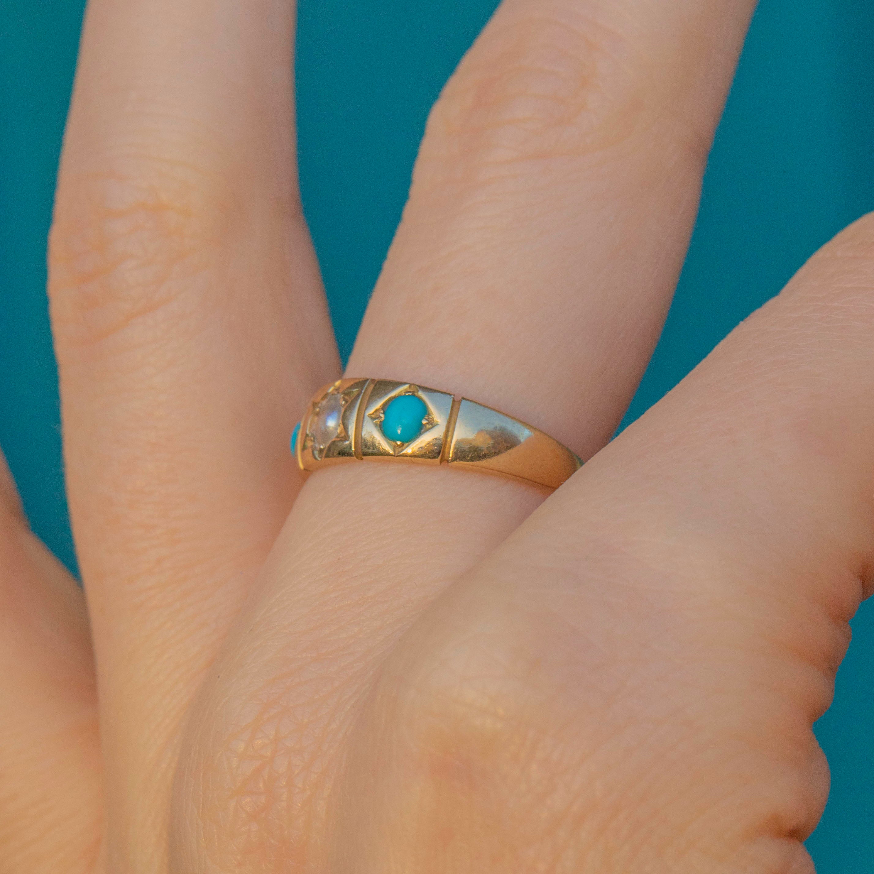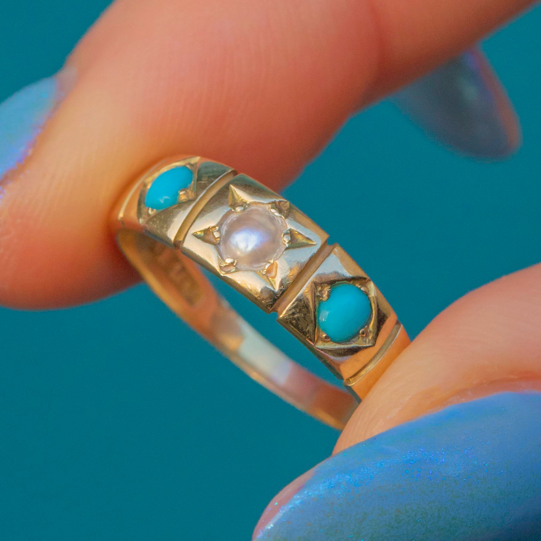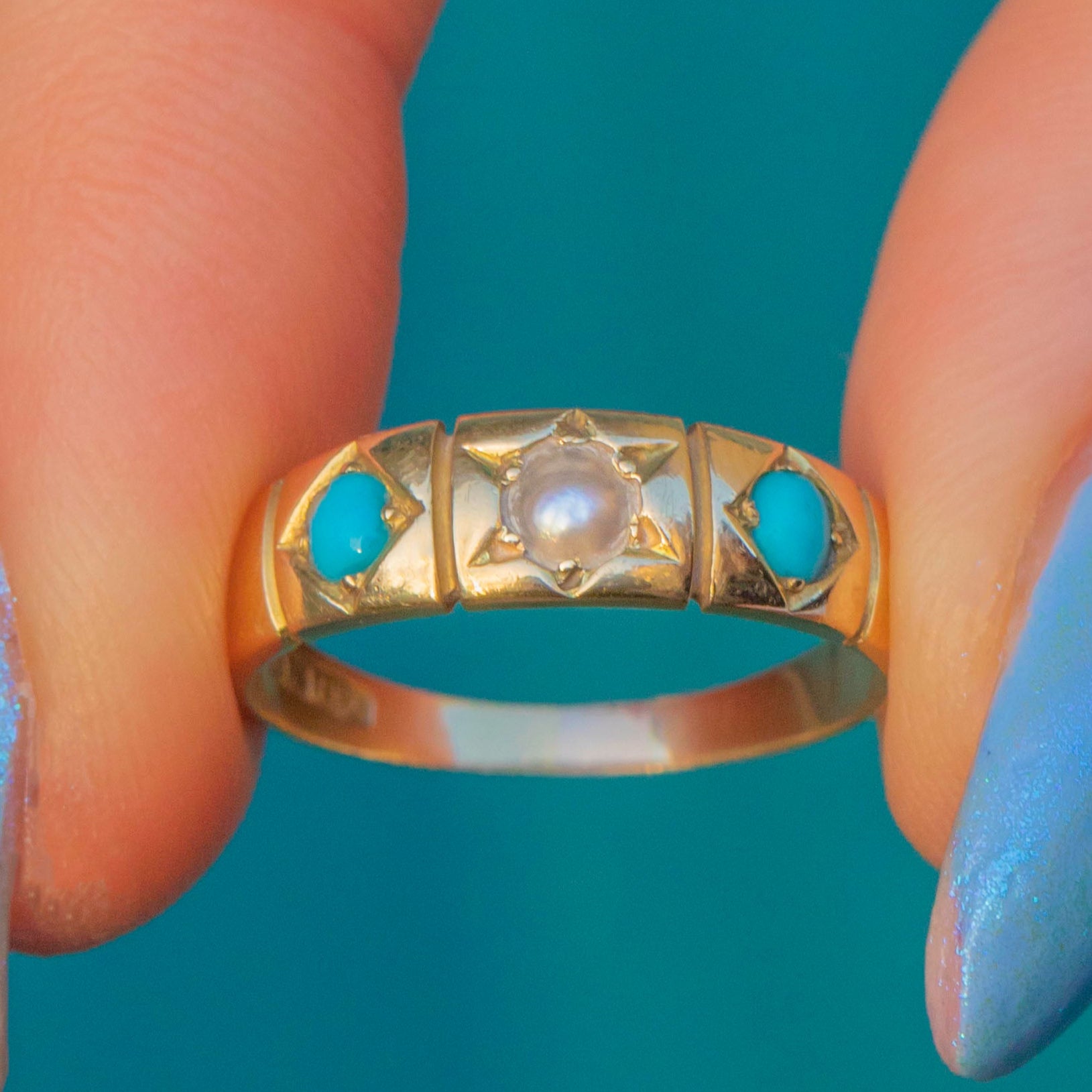 GOOD-VERY GOOD. This stunning antique 18ct Gold Turquoise Pearl star-set ring is in great condition, especially when considering its grand age! The stones are securely set and smooth to the touch, with only minimal wear commensurate with age. There is a small chip on one of the Turquoise stones and some gentle wear on the Pearl, which is noticeable under close inspection. A truly beautiful piece, perfect for any collector or lover of antique jewellery!