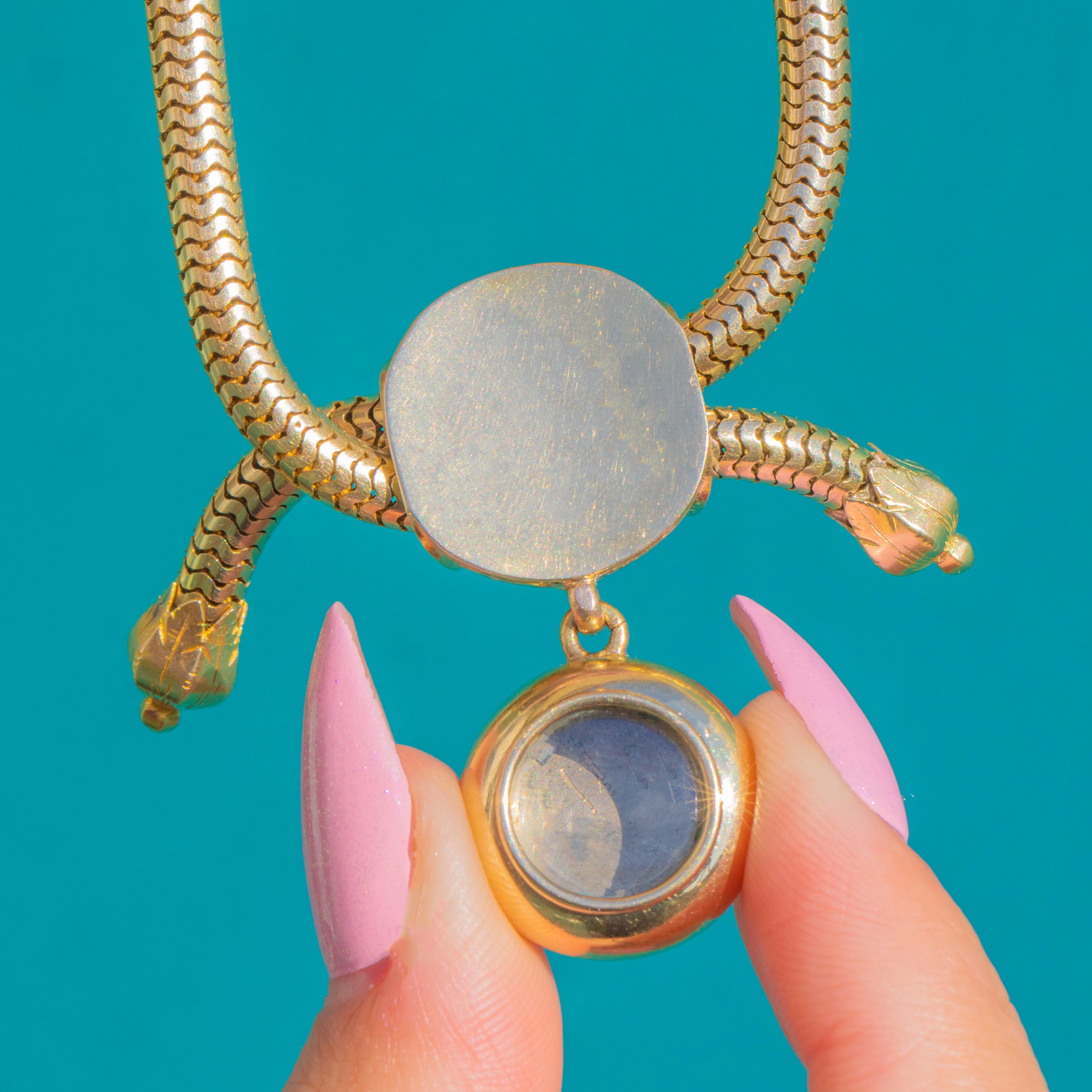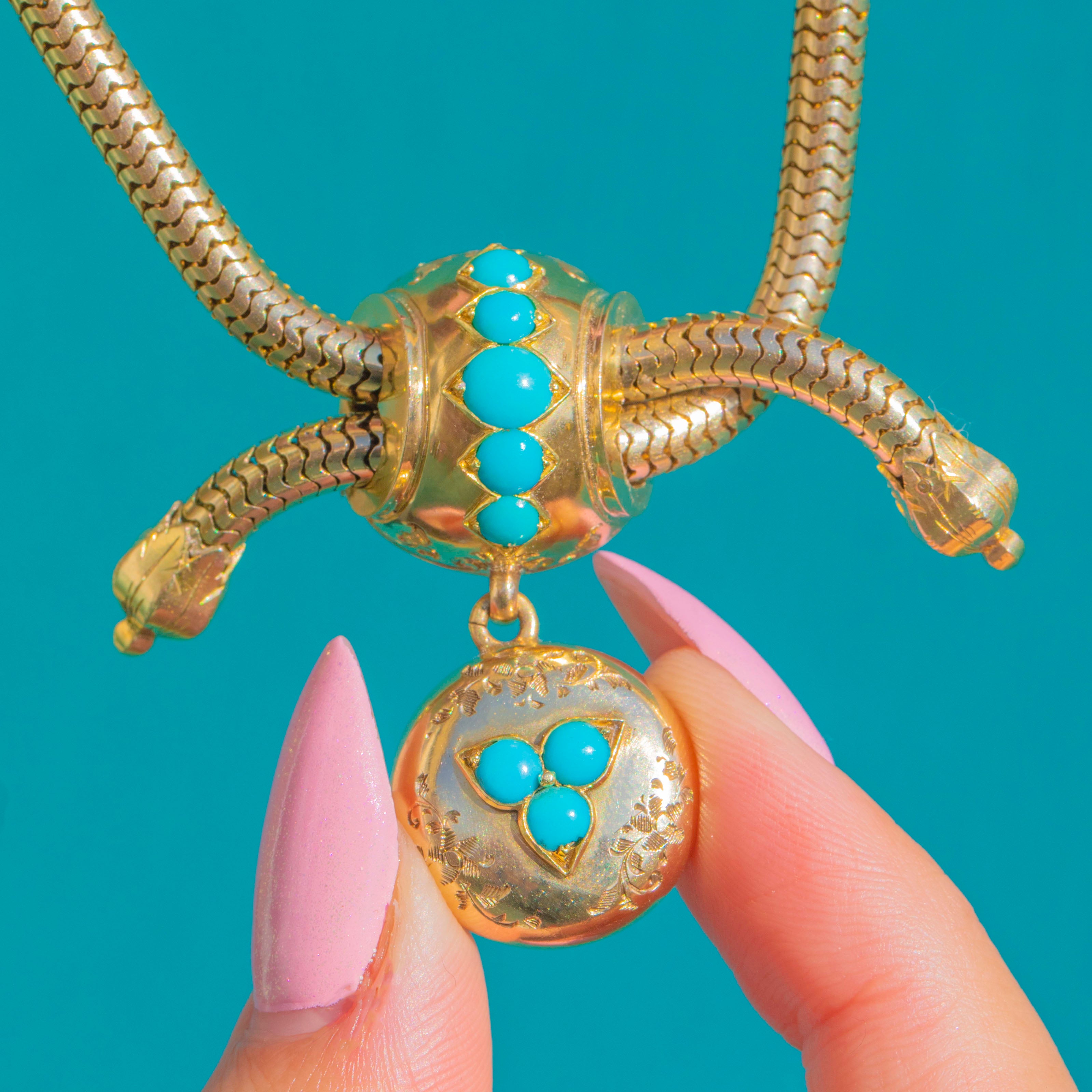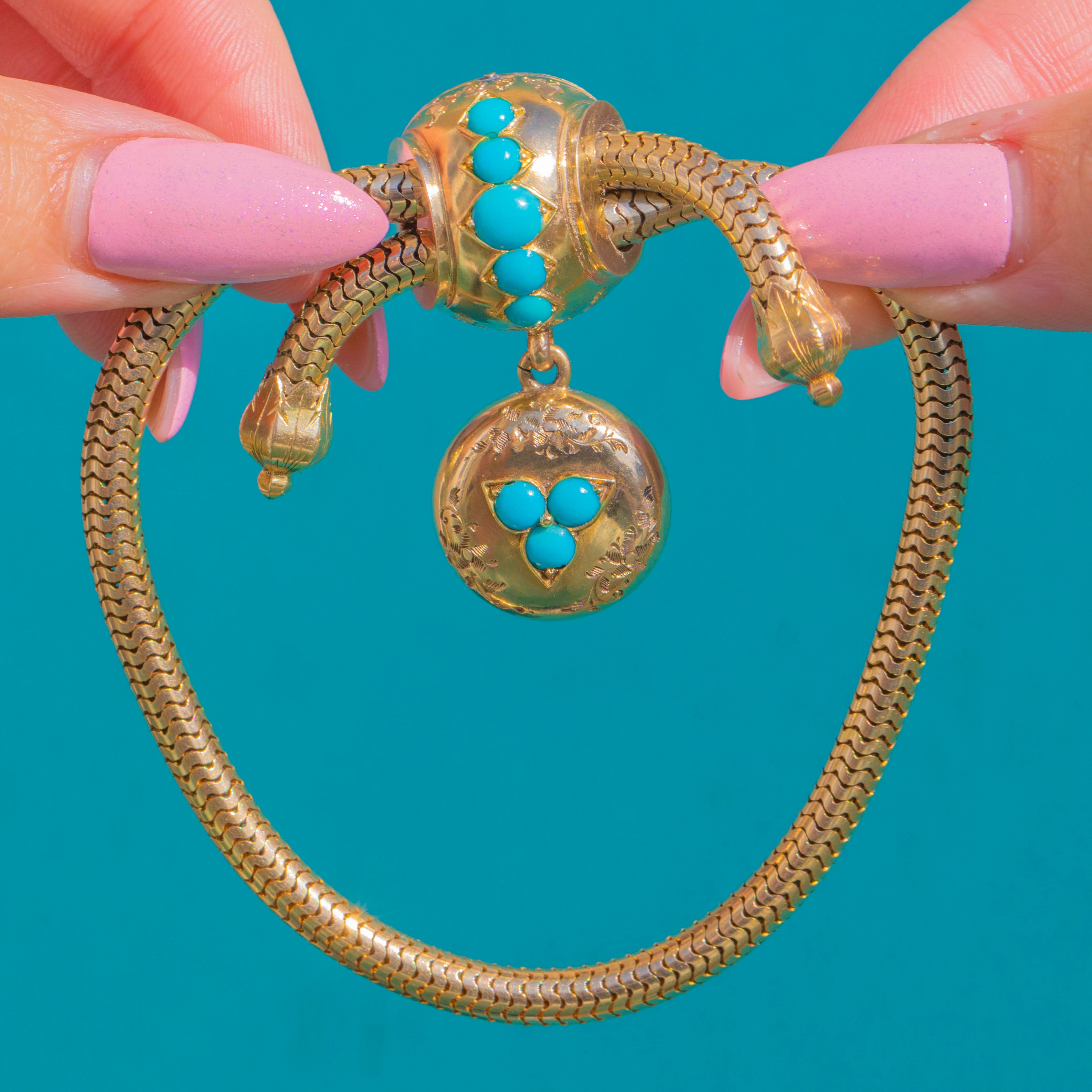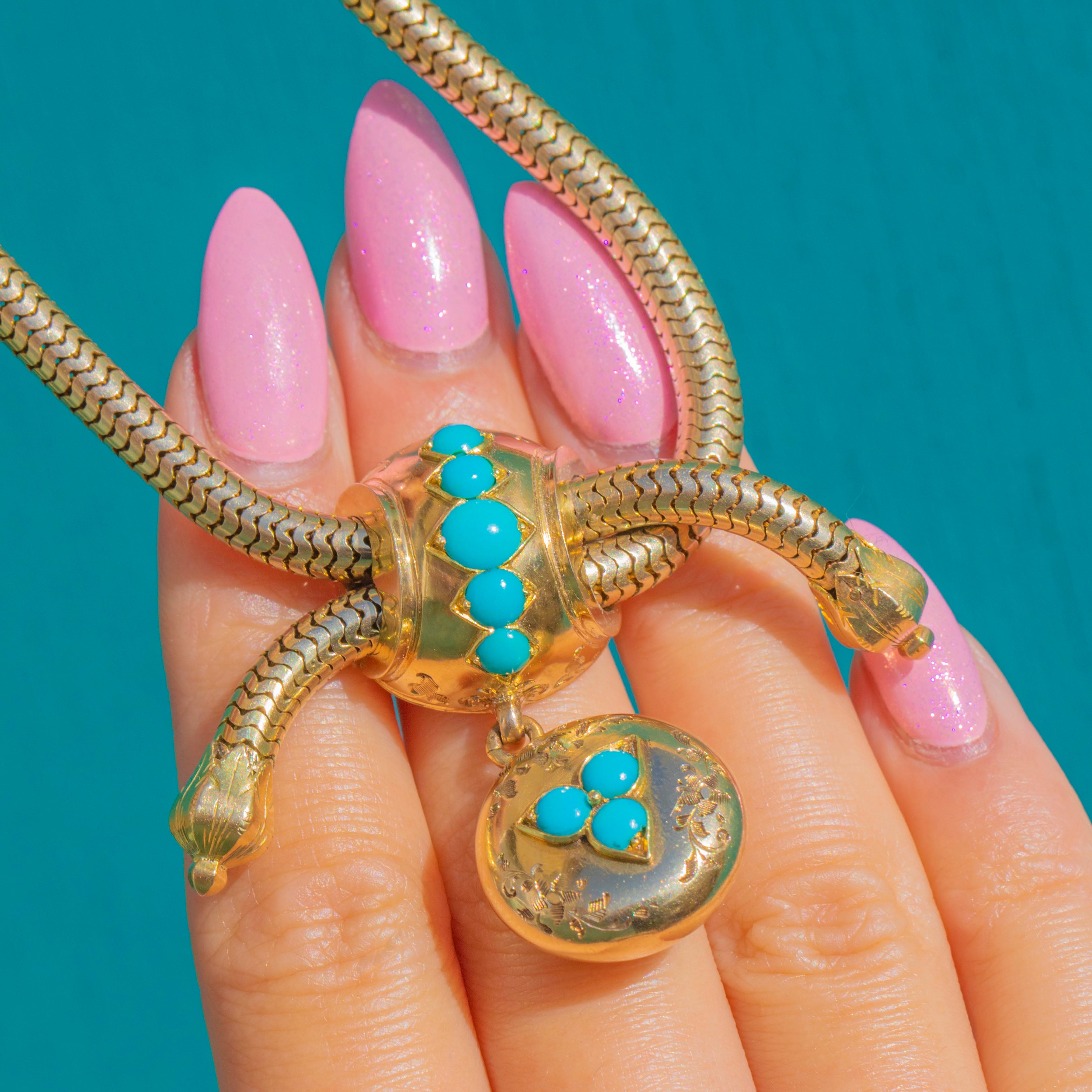 EXCELLENT: Turquoise are bright and well-matched with no visible chips, and settings are secure. The Gold shows minimal light surface wear consistent with careful wear and age, with the snake chain and slider mechanism in fine working order. No signs of later restoration are evident.