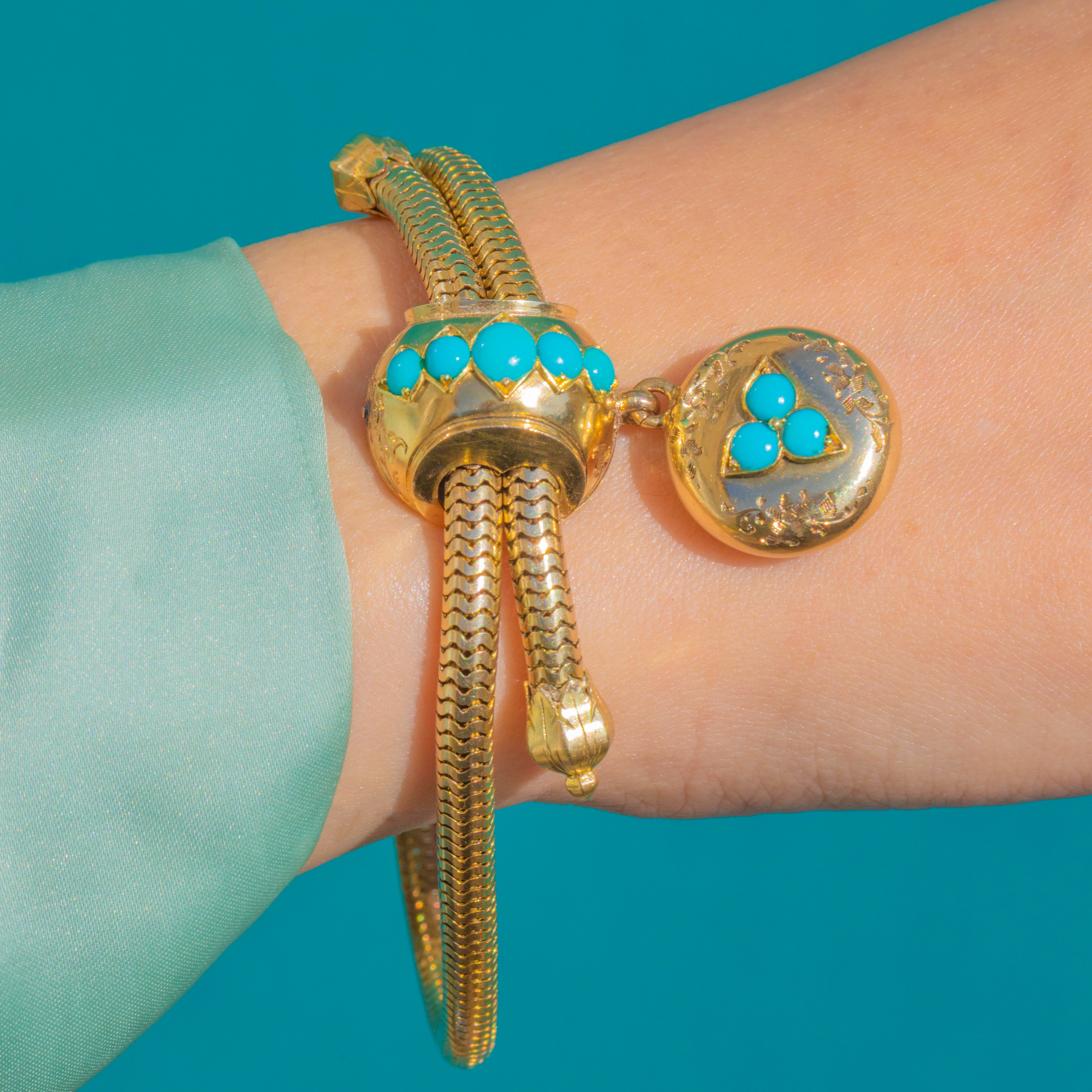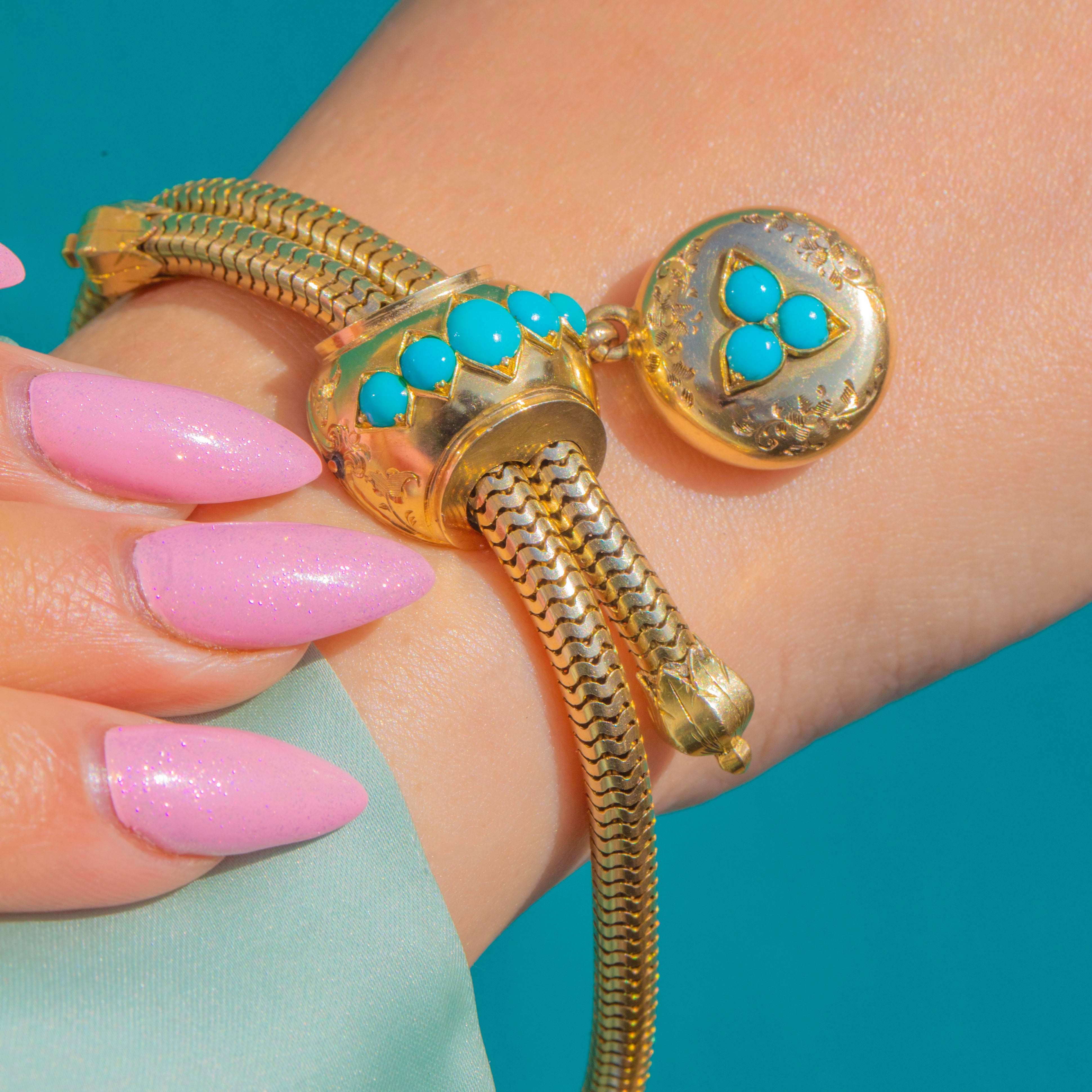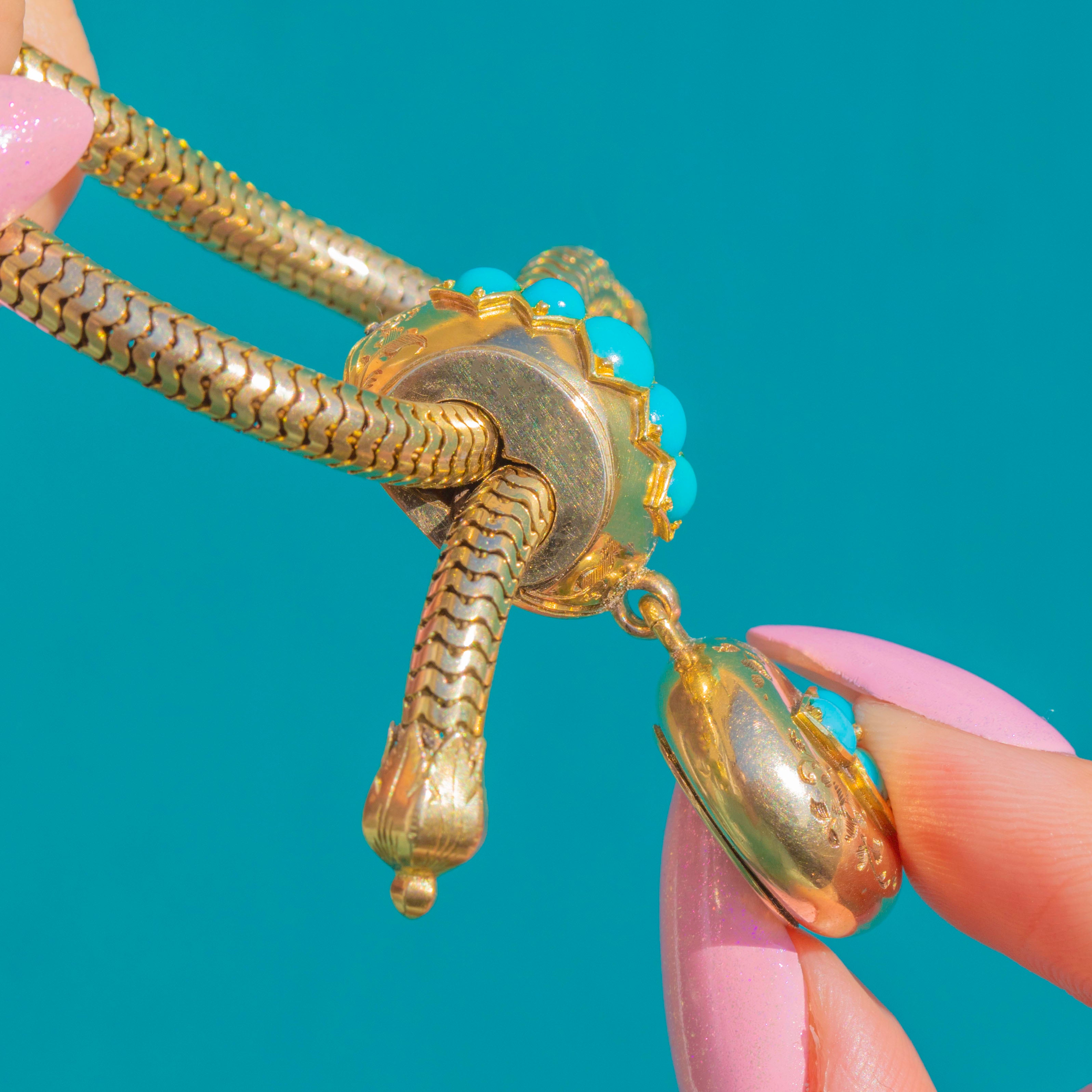 A glorious mid–late Victorian slider bracelet in rich 18ct Gold, set with vibrant Turquoise and finished with a sweet locket charm. The supple snake chain glides around the wrist, while the Turquoise-studded slider brings a pop of joyful colour and vintage romance.