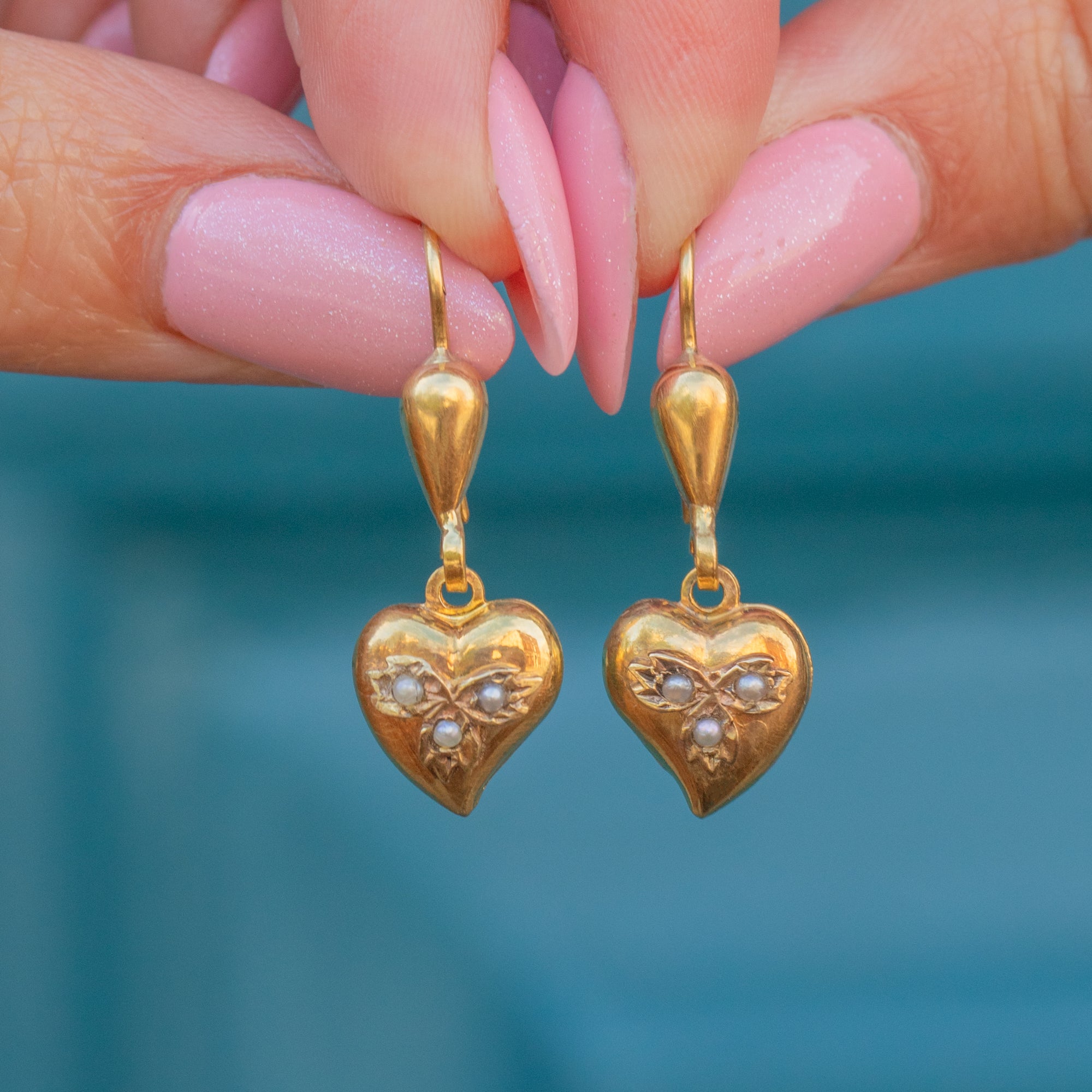 These enchanting antique 18ct Gold witches heart Pearl drop earrings exude femine charm. Each earring us crafted from glowing 18ct yellow Gold and shaped into the elegant curve of a witches heart, a rare and symbolic design representing love and protection. Each heart is adorned with three shimmering seed Pearls displayed within foliate settings.