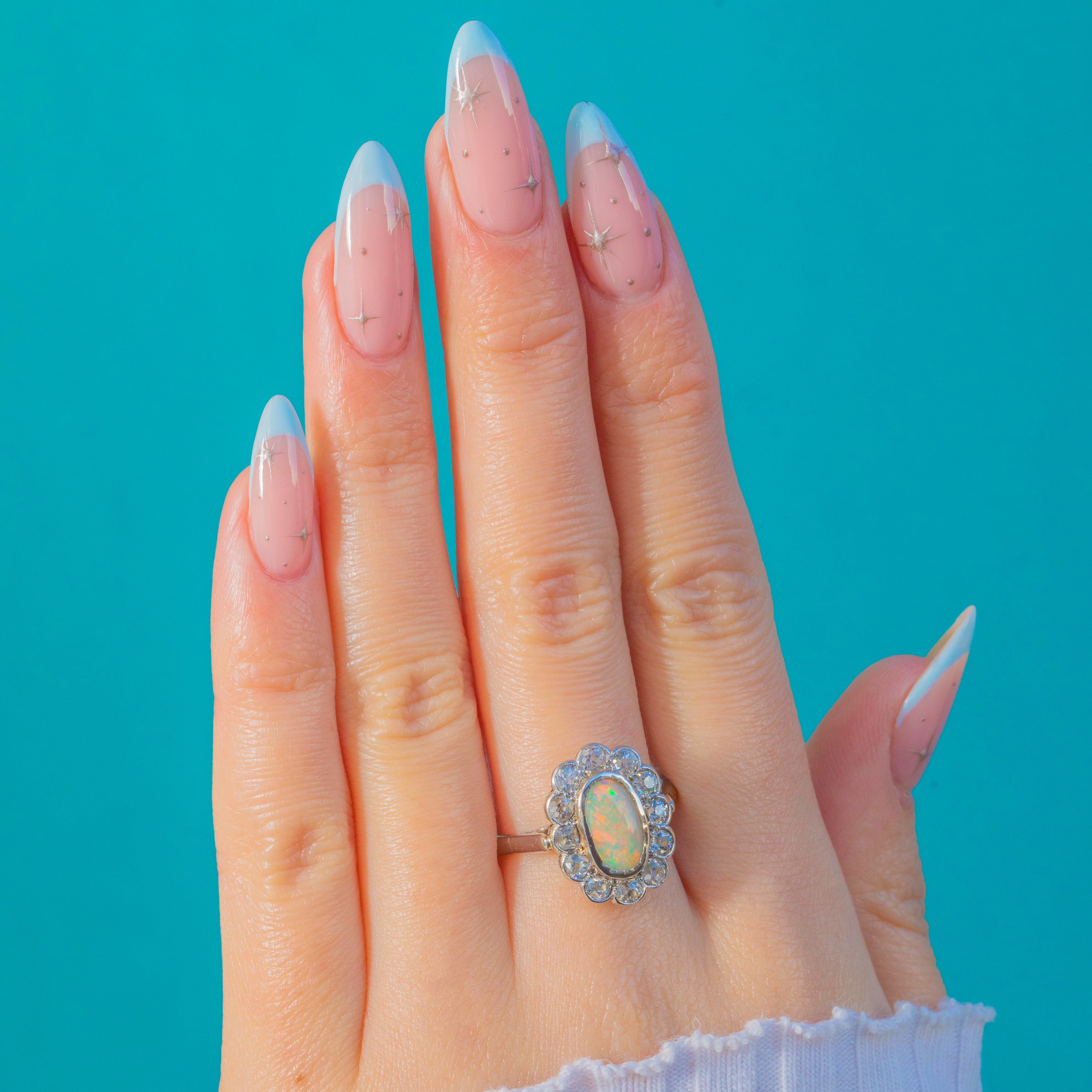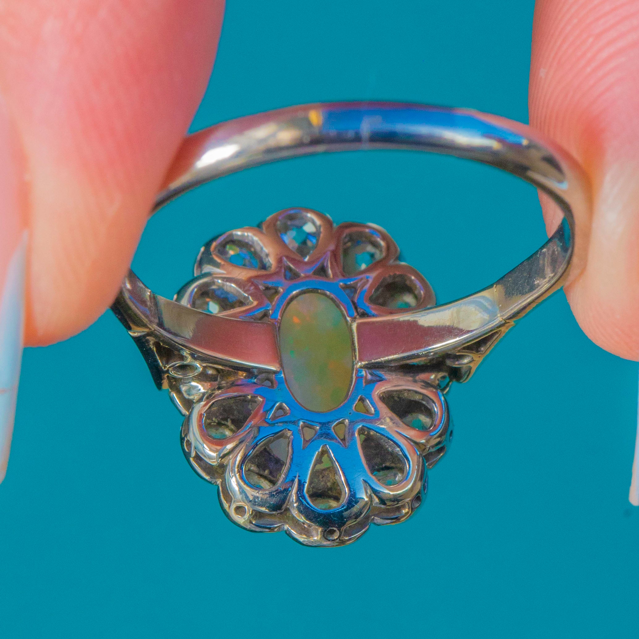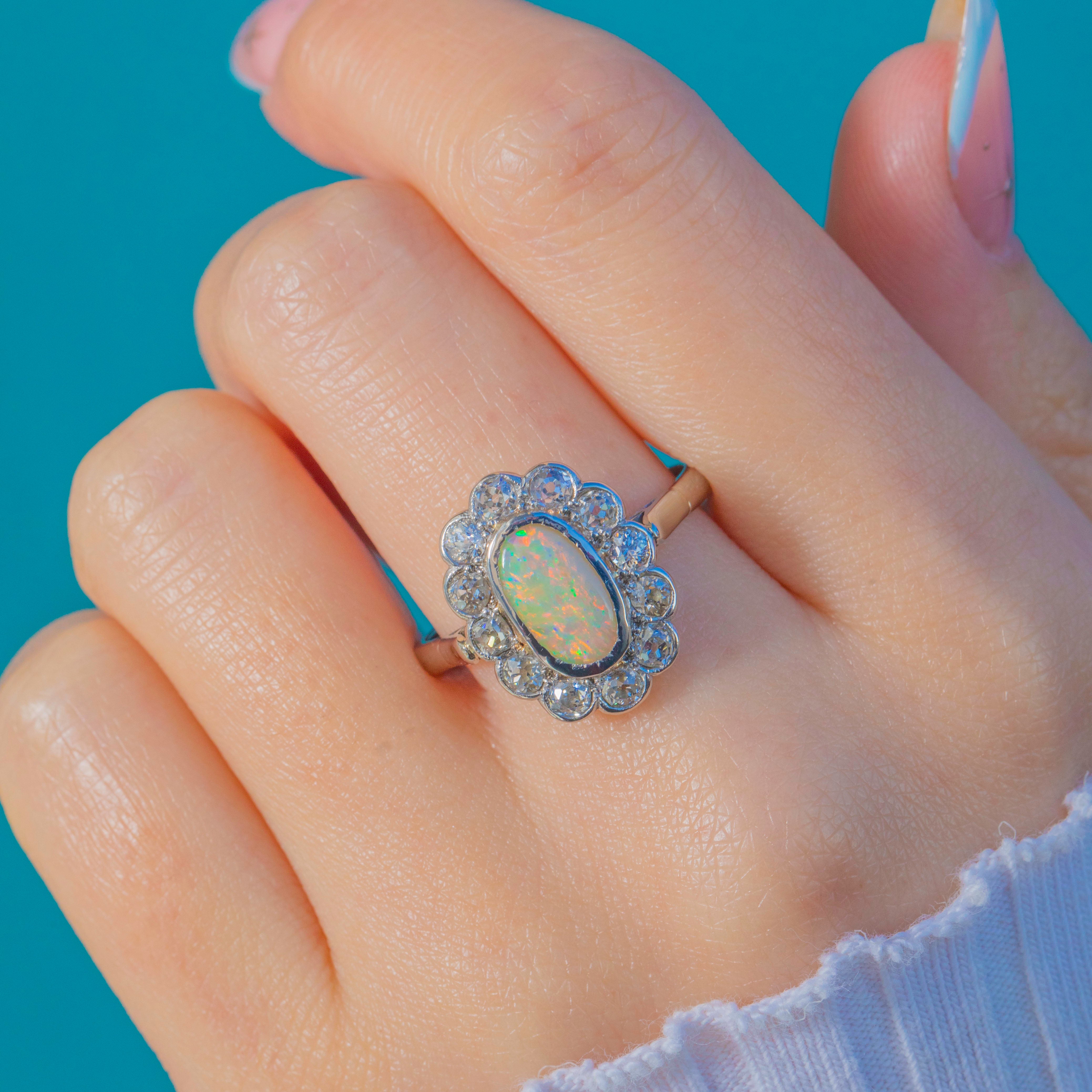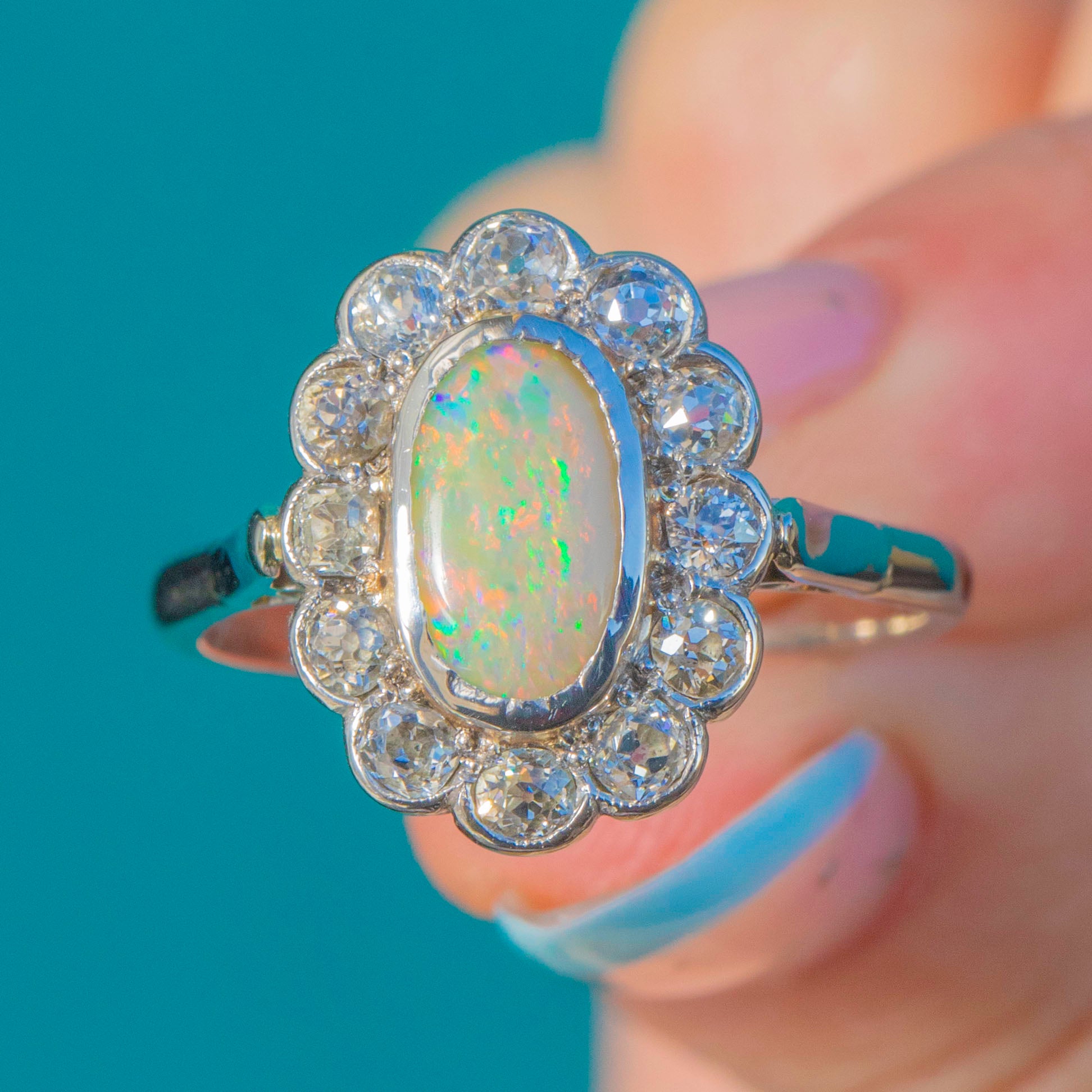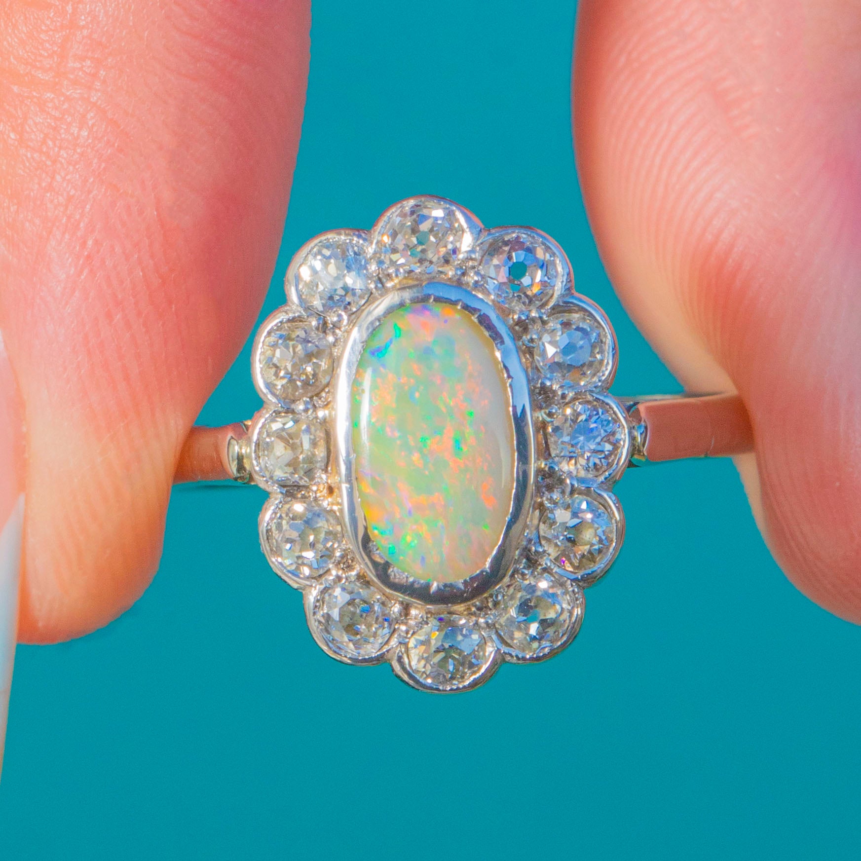 A captivating Vintage cluster ring that marries celestial colour with timeless sparkle. At its heart, a natural solid Opal shows a vivid, fiery play-of-colour with flashes of green, orange and red, safely cradled in a sleek rub-over setting. Encircling it, twelve antique old mine cut Diamonds twinkle within a scalloped, milgrain-edged halo for that irresistibly romantic “daisy” look.