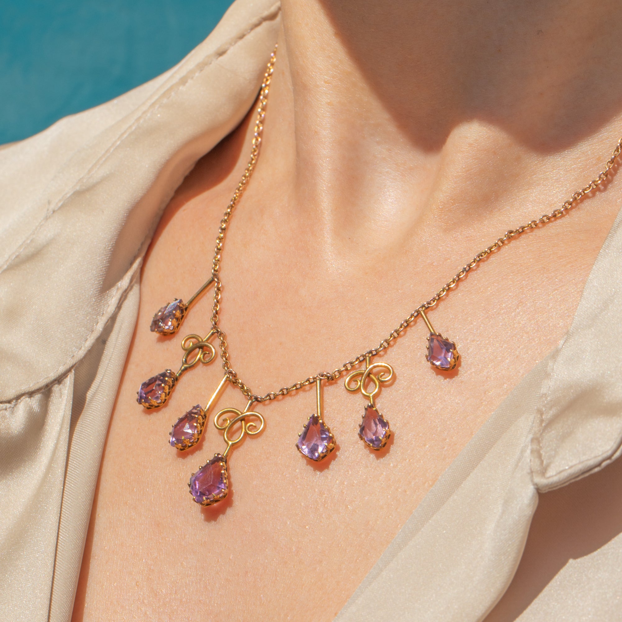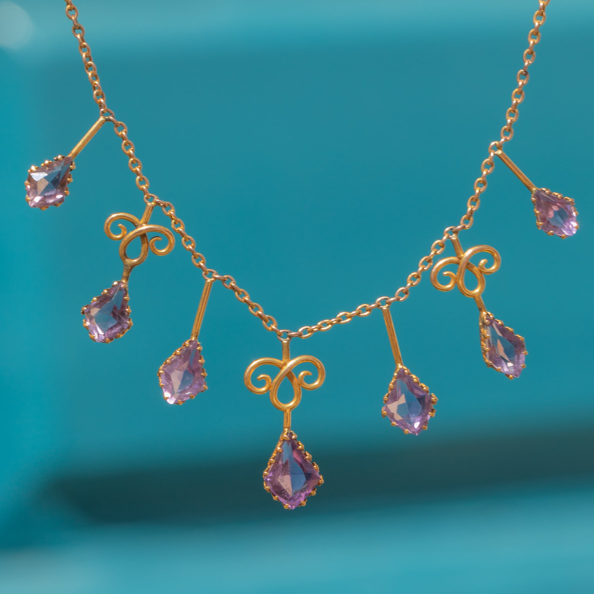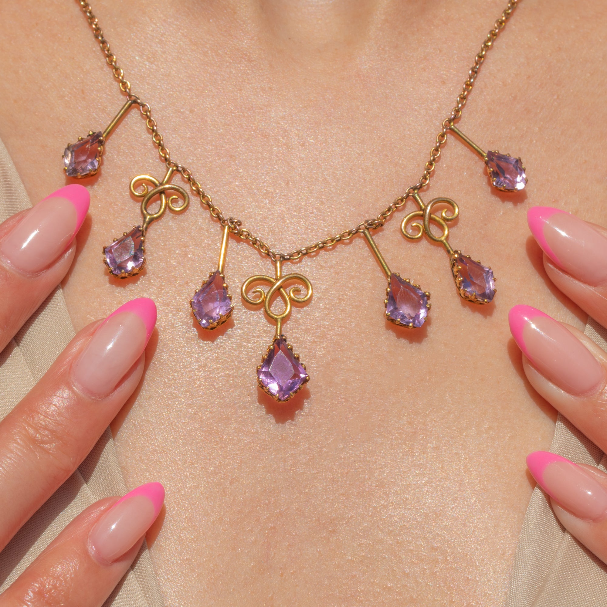 Fancy and flirtatious, prepare to fall in love with this antique 9ct Gold Amethyst fancy fringe necklace! Her seven faceted Amethysts burst with gorgeous lilac hues, creating a stunning display when resting across the décolletage.