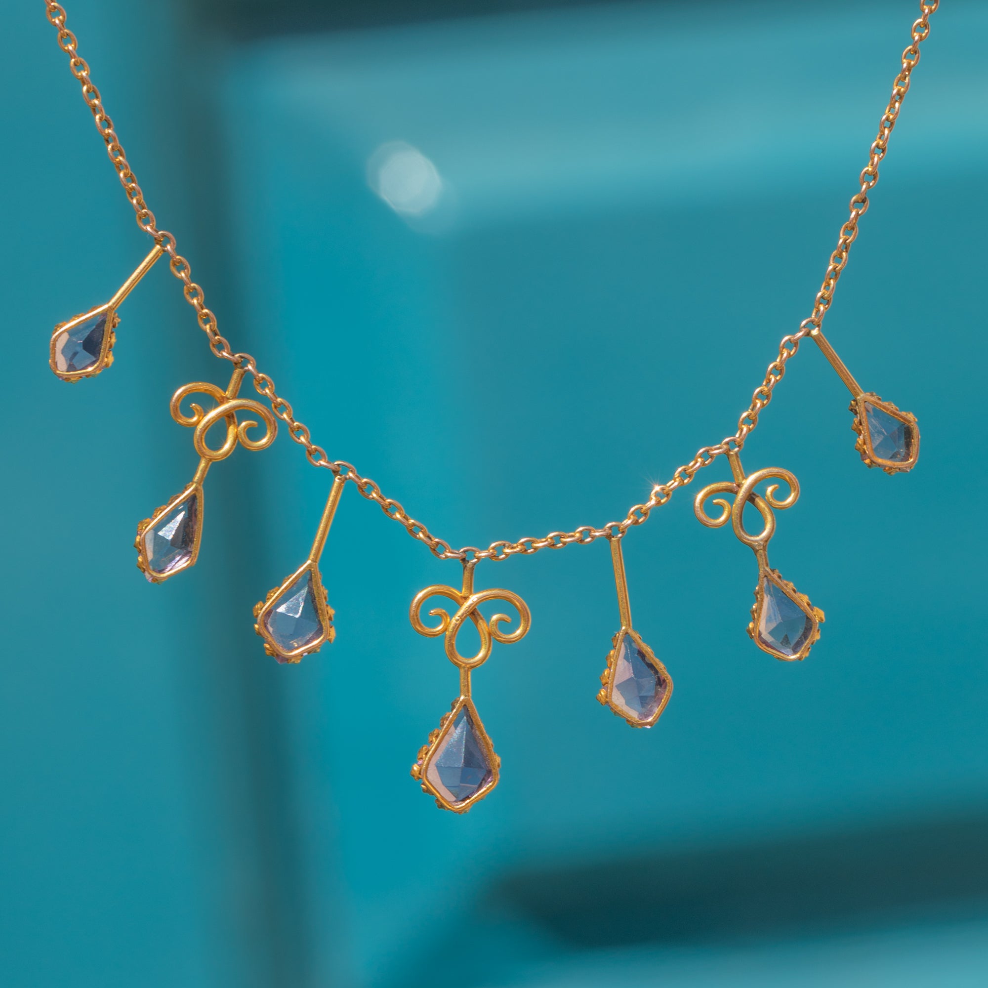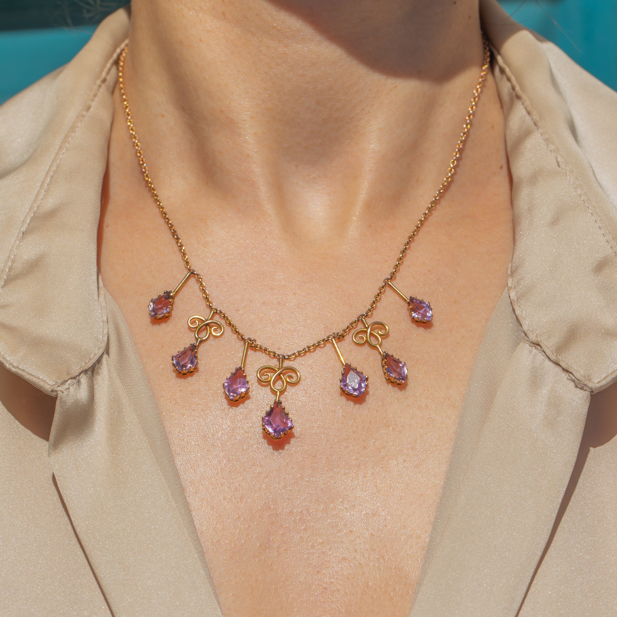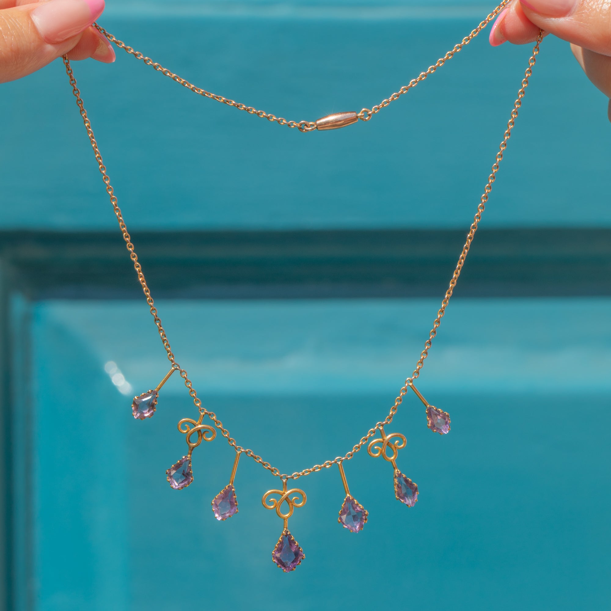 Fancy and flirtatious, prepare to fall in love with this antique 9ct Gold Amethyst fancy fringe necklace! Her seven faceted Amethysts burst with gorgeous lilac hues, creating a stunning display when resting across the décolletage.