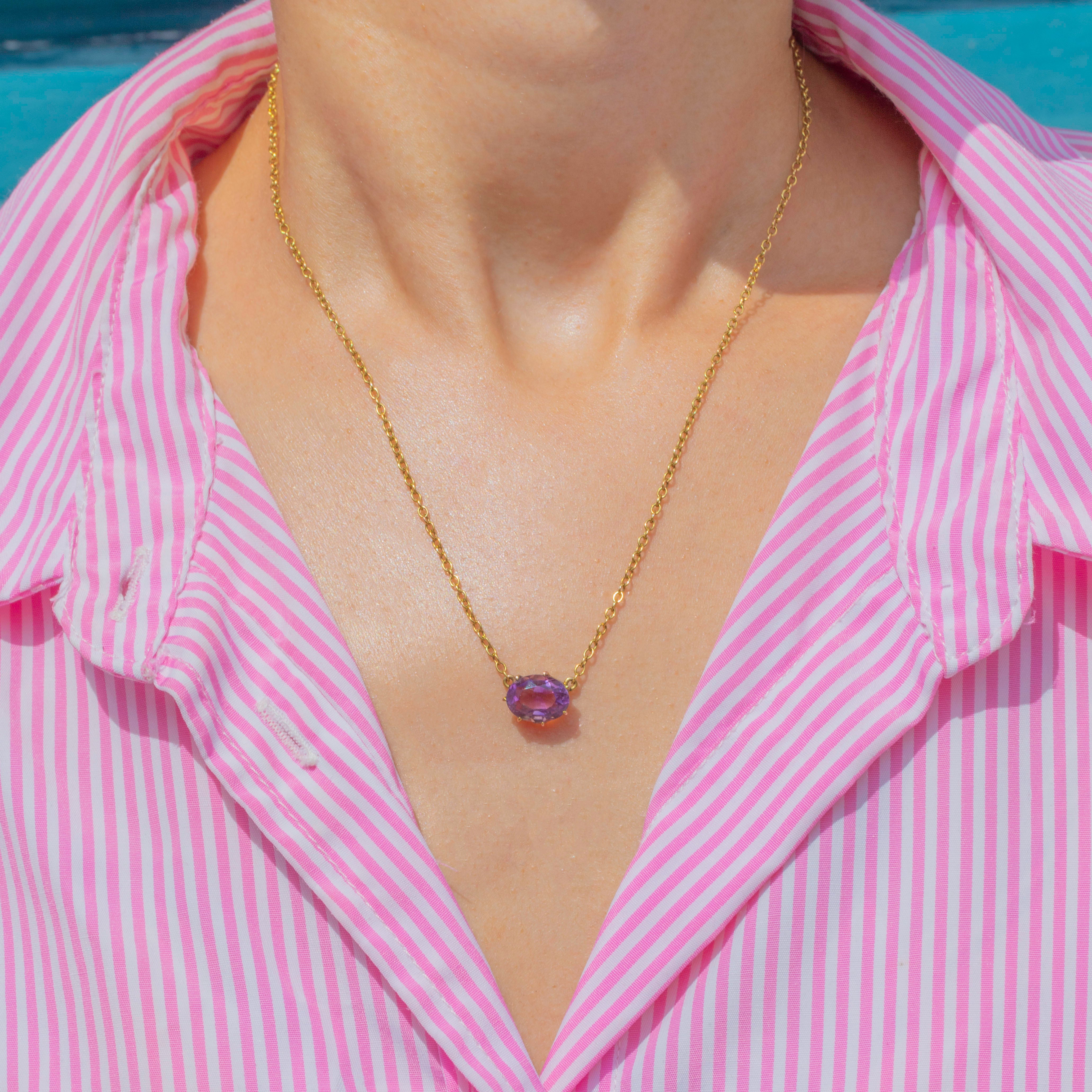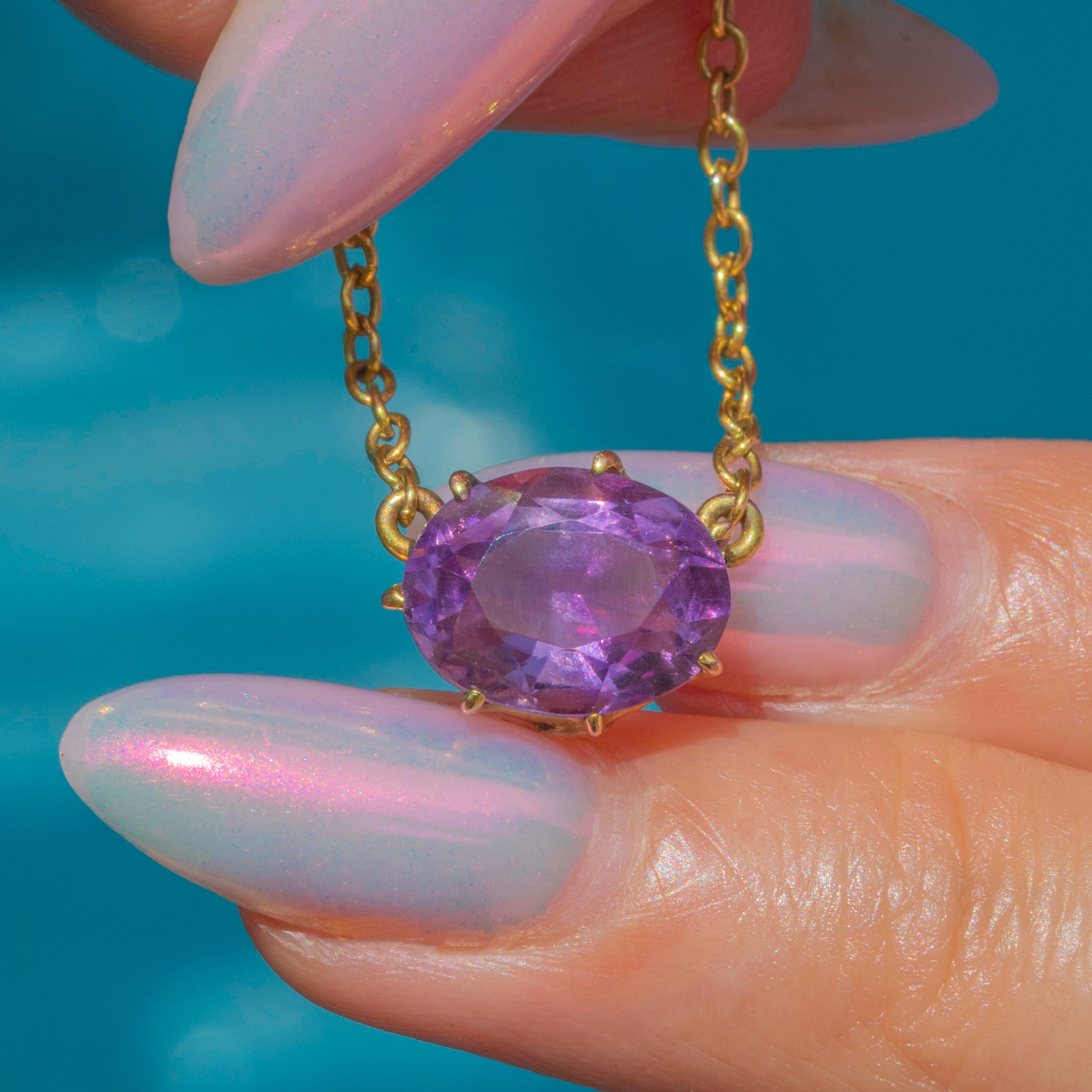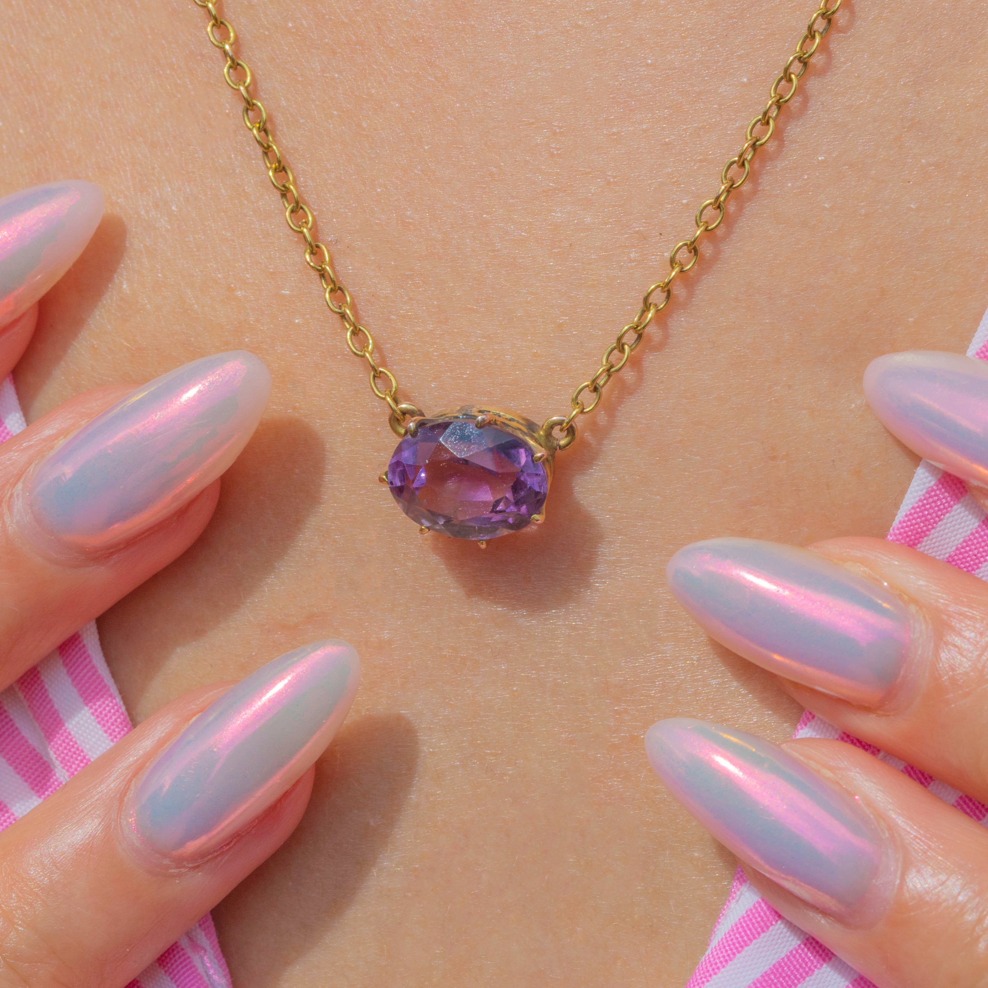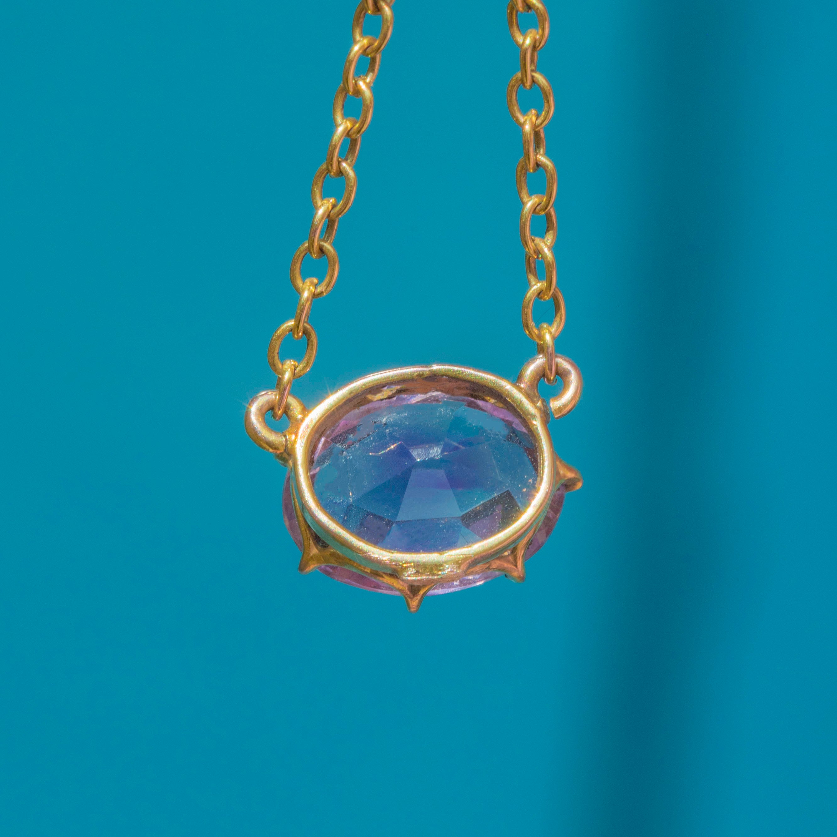 This glossy Victorian necklace has been crafted from buttery 9ct Gold and suspends a 2.43ct Amethyst embraced by claw settings. The 17" chain allows the Amethyst to rest centrally across your décolletage, radiating a deep plum hue and revealing subtle pink undertones as its facets shimmer in the light.