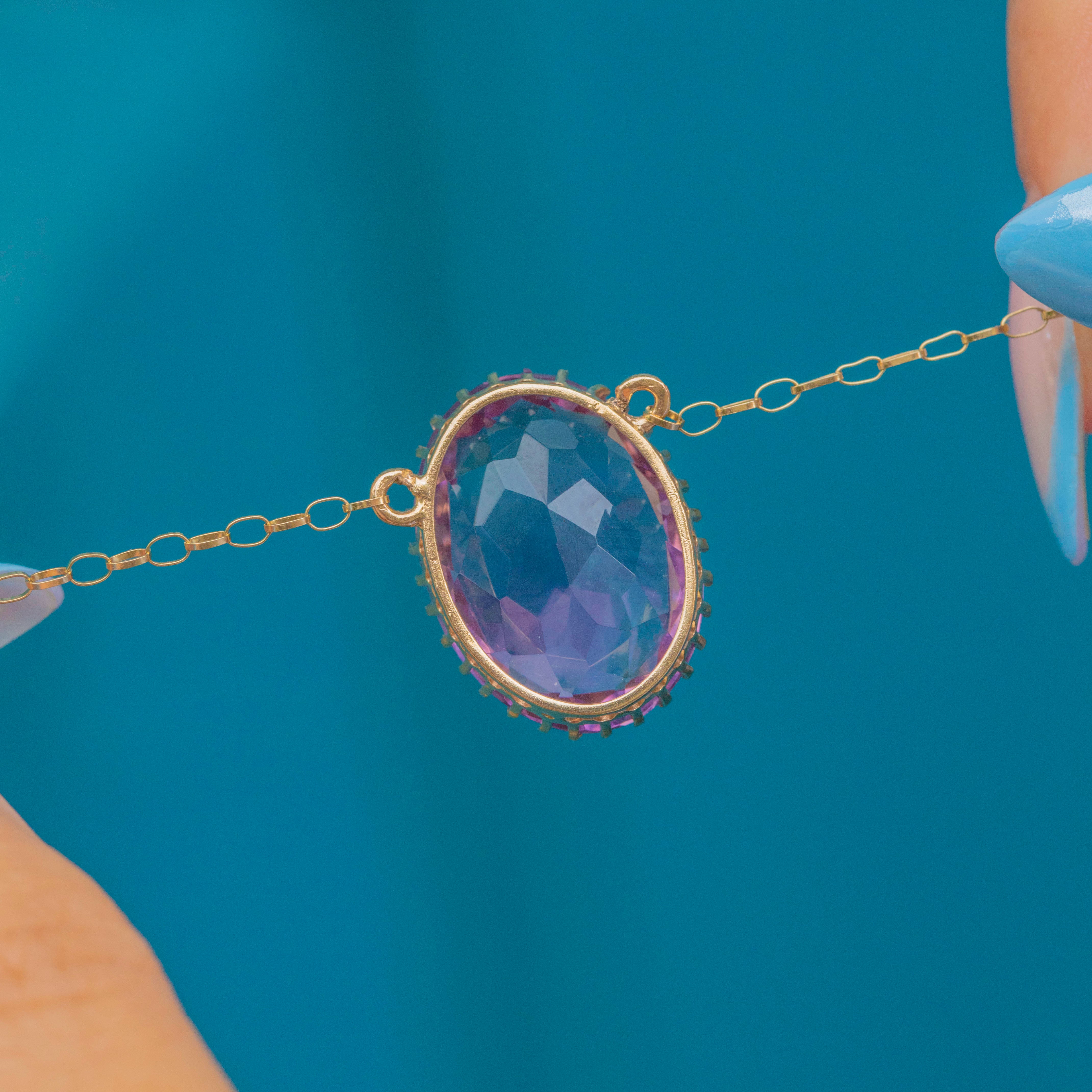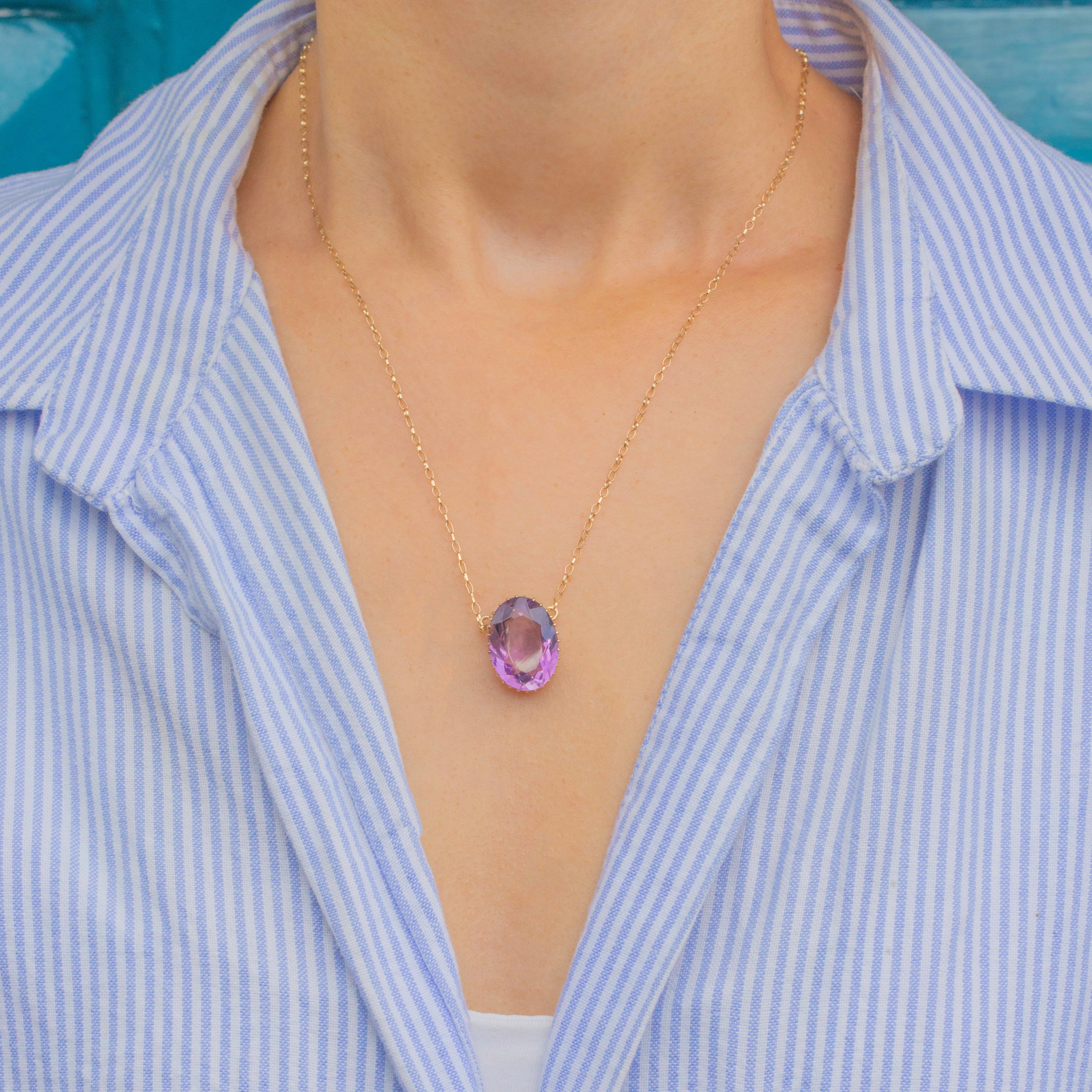 EXCELLENT: The Amethyst is secure in its claw settings and free from chips or abrasions. The chain links are all securely connected and the necklace closes with a bolt ring clasp for secure wear!