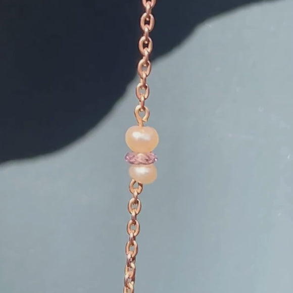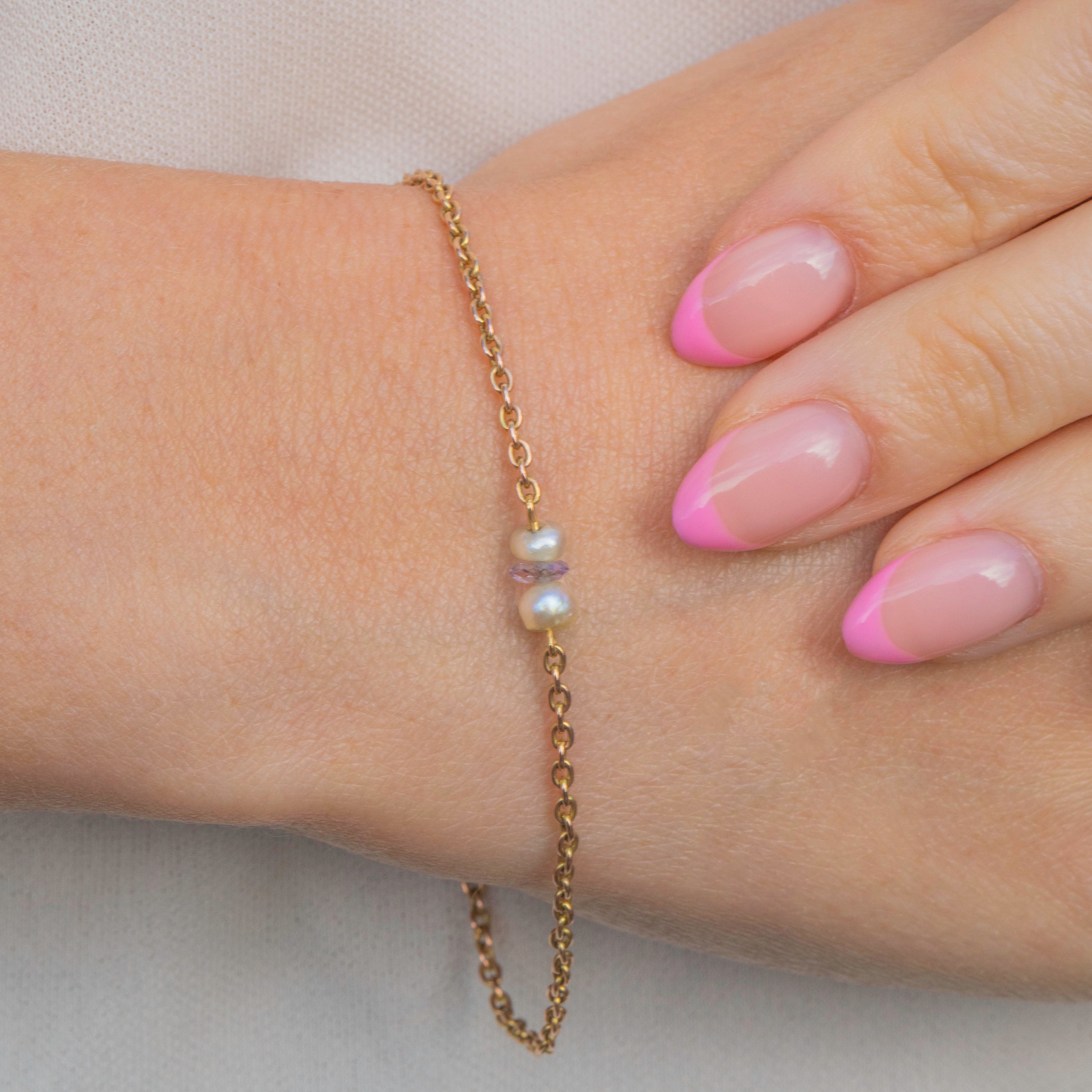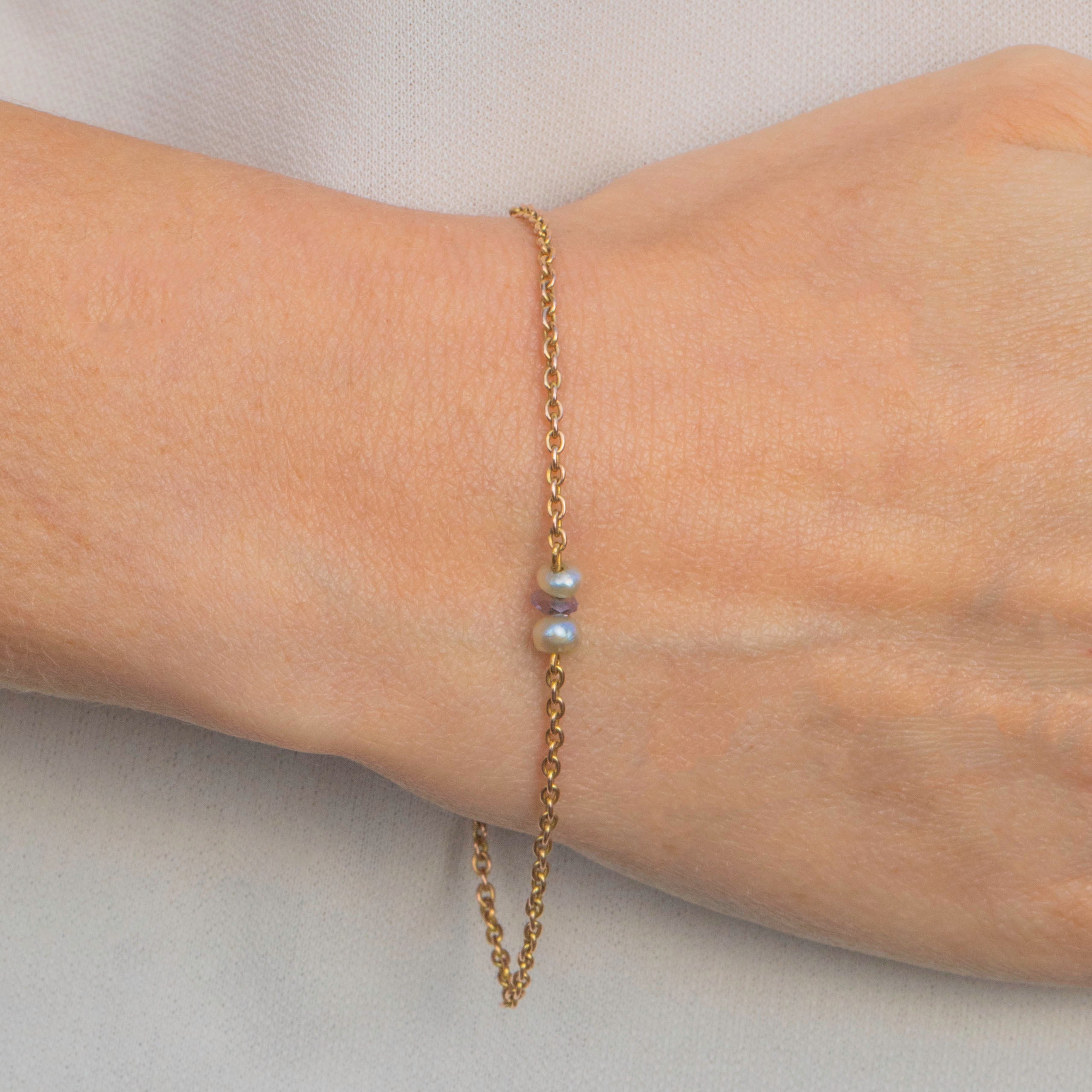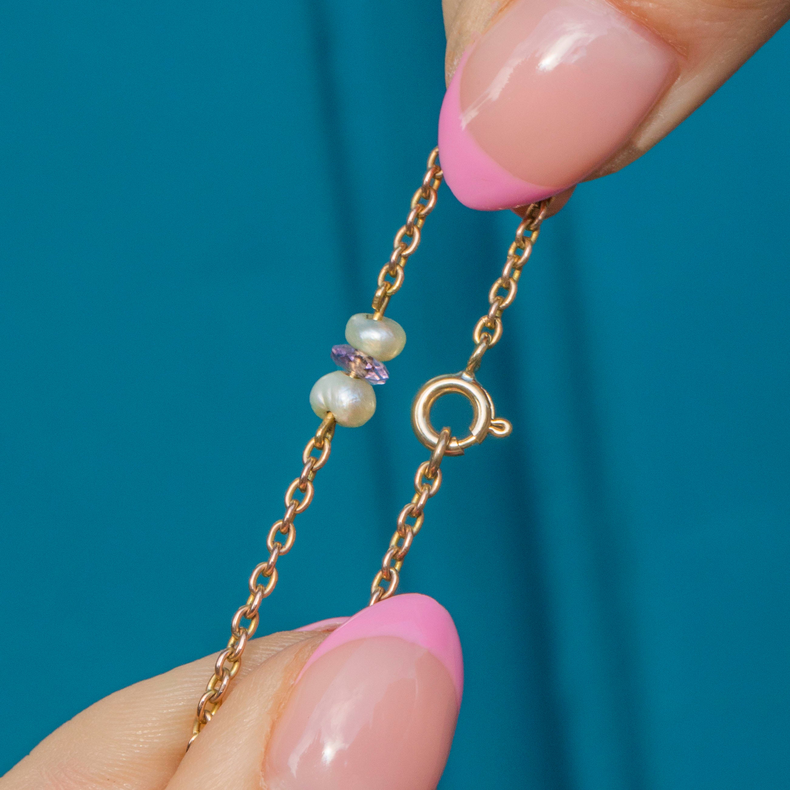 Bring splendour to your wrist stack with this antique 9ct Gold Pearl Amethyst bracelet! Her 7.5-inch length is formed of slender belcher links, homing a faceted Amethyst nestled between two shimmering Pearls for a refined finish.