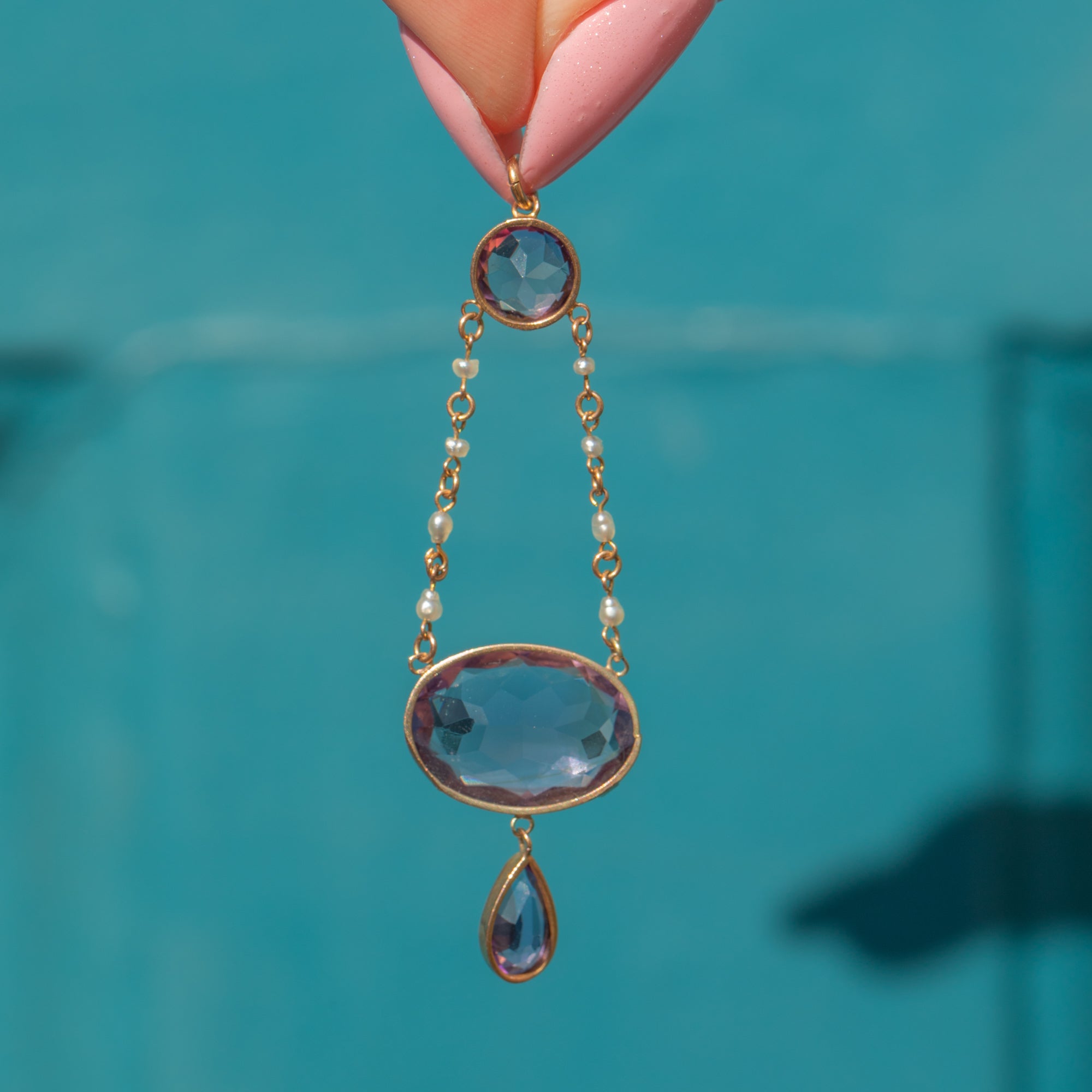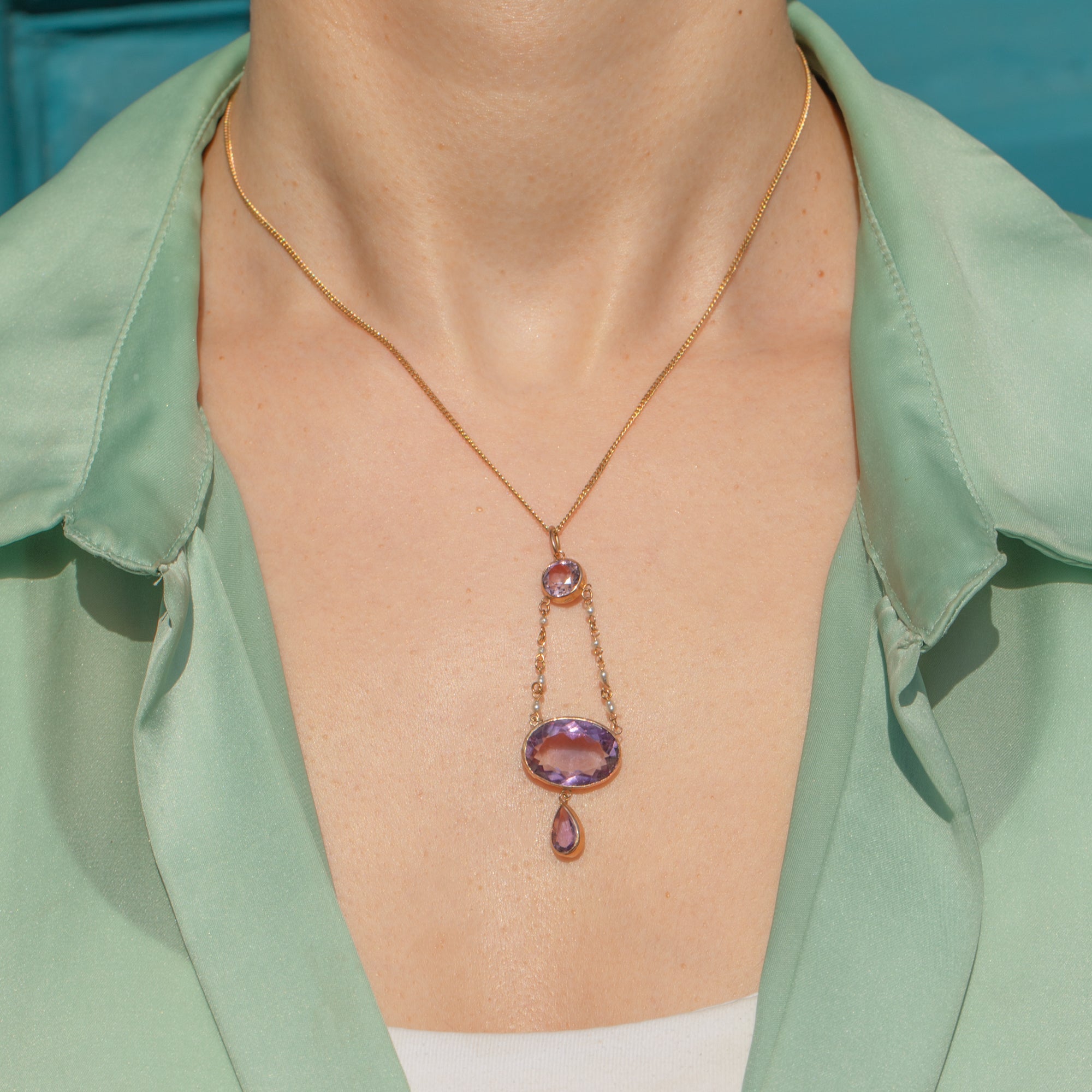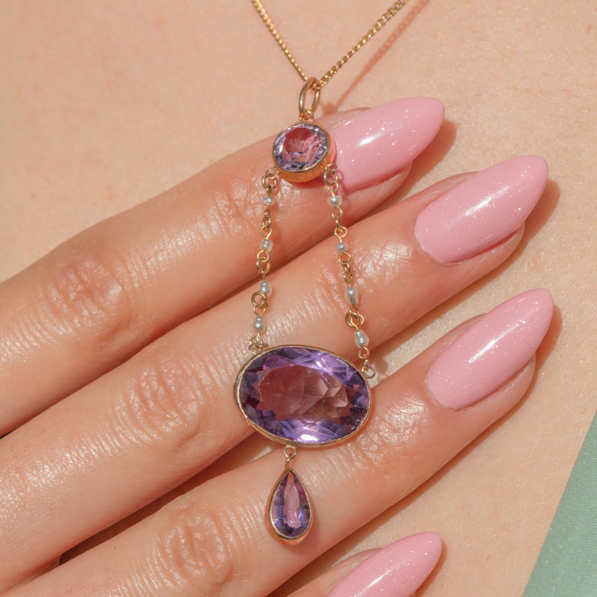This antique 9ct Gold Amethyst Pearl drop pendant exudes an effortless regal appeal! Plucked from the prettiest era, this Edwardian pendant is crafted from solid 9ct Gold and boasts three lilac Amethysts connected by lengths of dainty chains that are dotted with shimmering Seed Pearls.