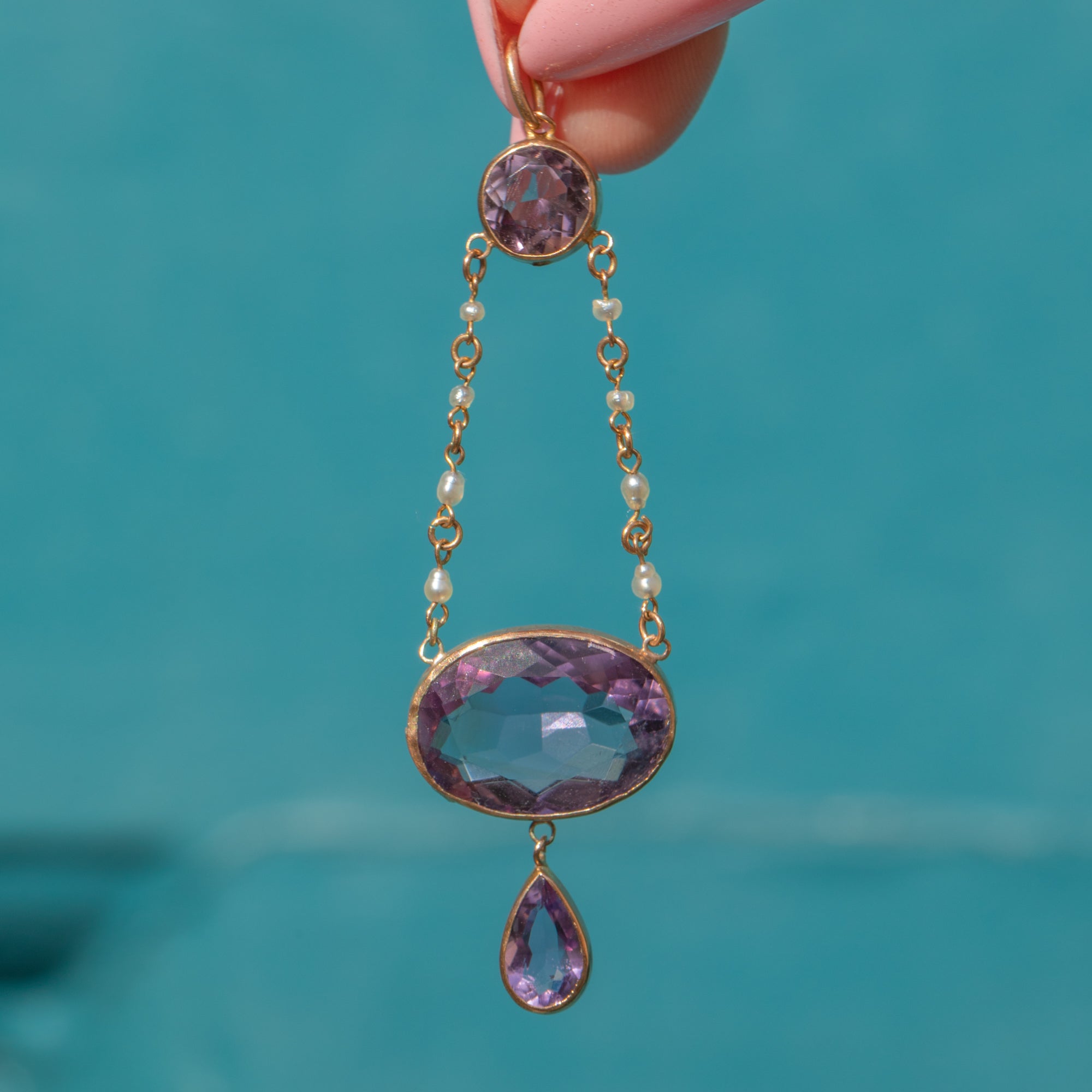 Antique 9ct Gold Amethyst Pearl Drop Pendant, 6.06ct Item added
