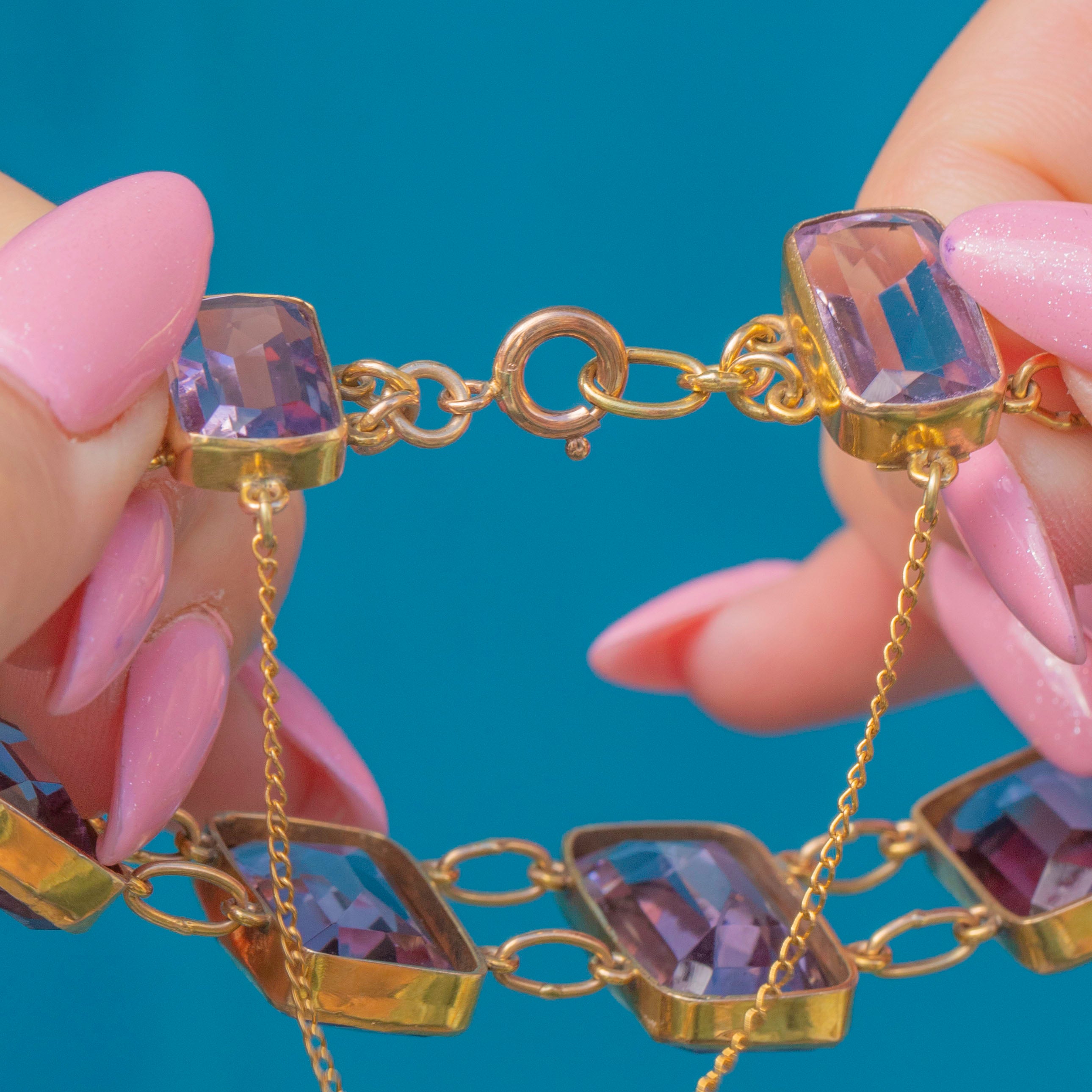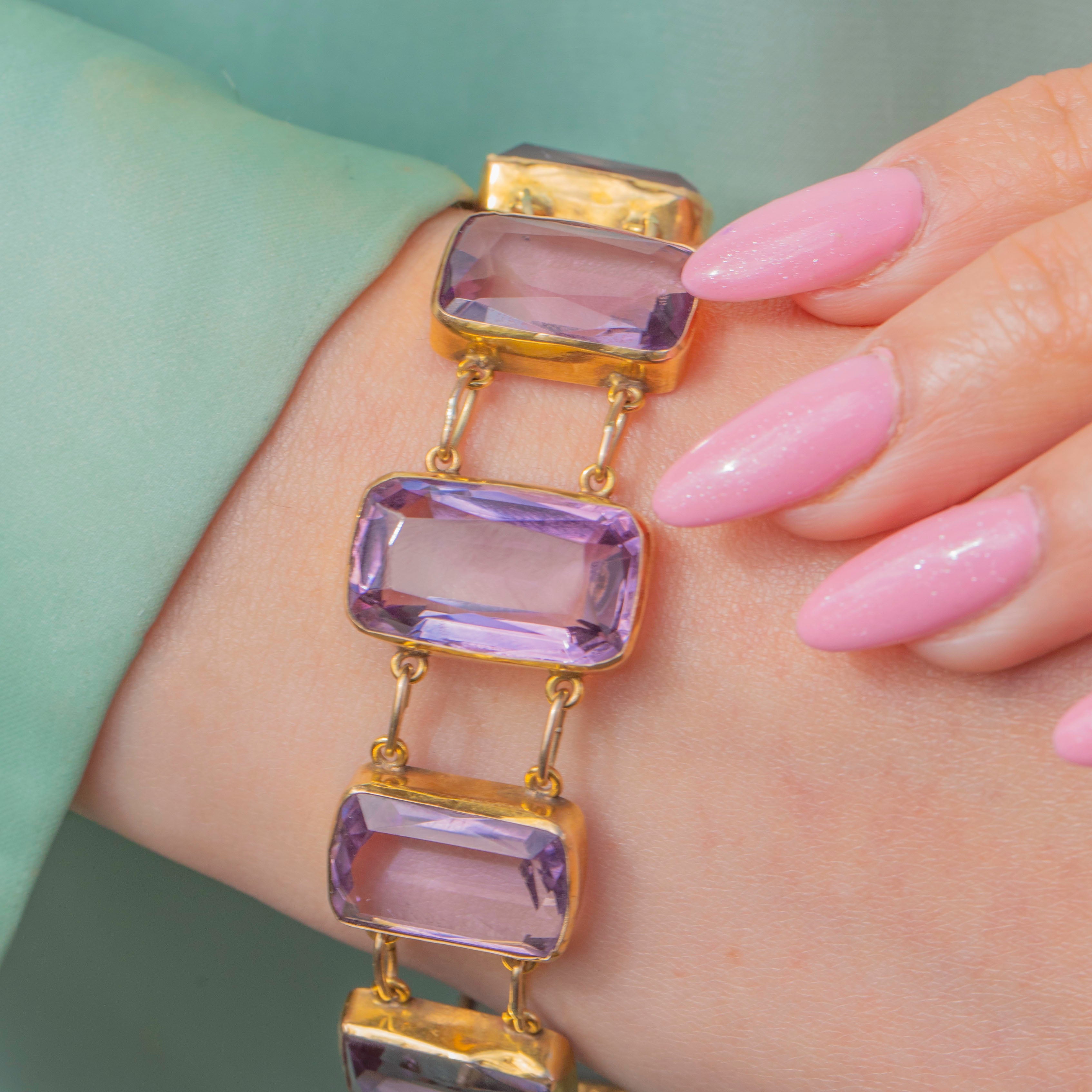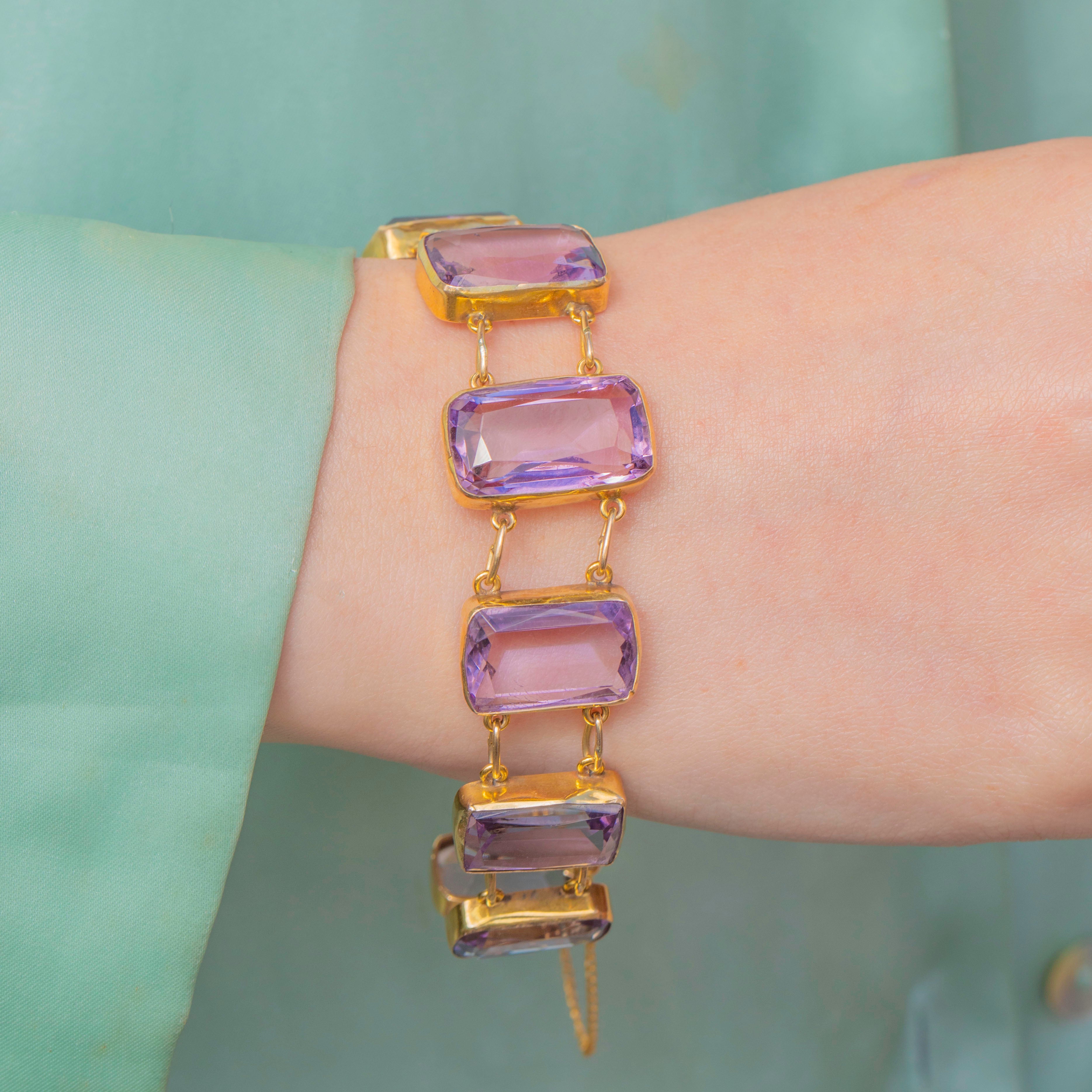 Each gemstone is expertly cut to allow the light to dance across its facets, creating a radiant display of lavender hues. The lovely lilac tones are perfectly complemented by warm 9ct Gold, which carries a bright honey-hued blush, enhancing the bracelet’s antique charm.