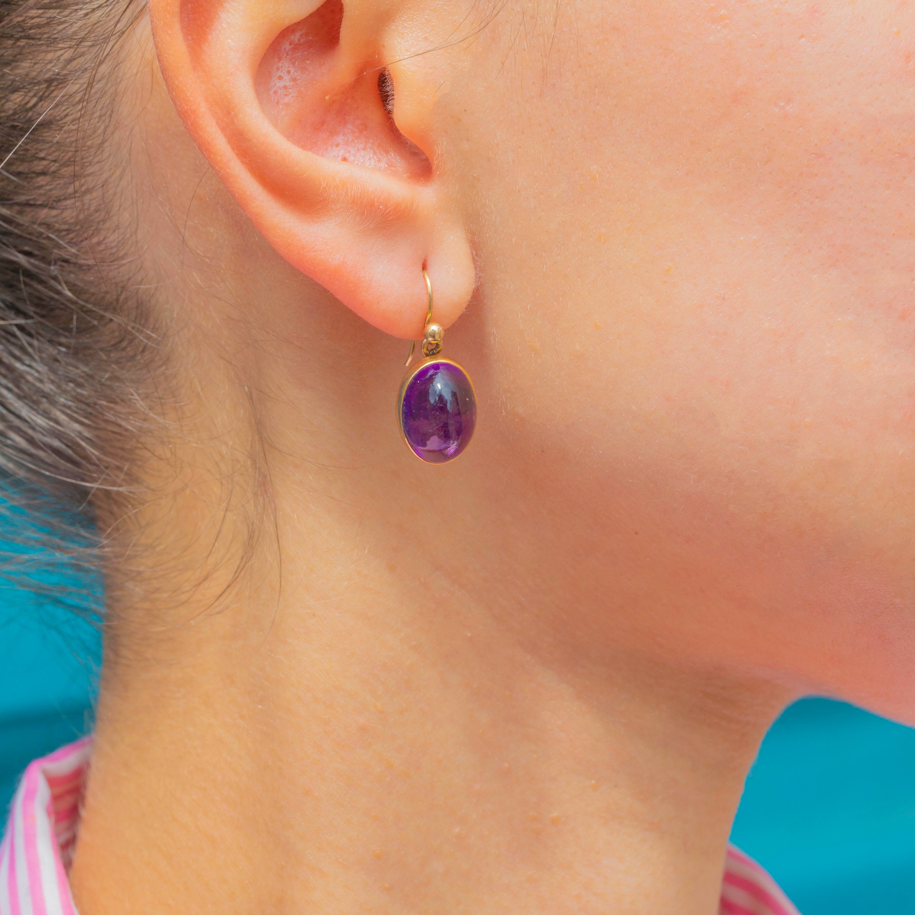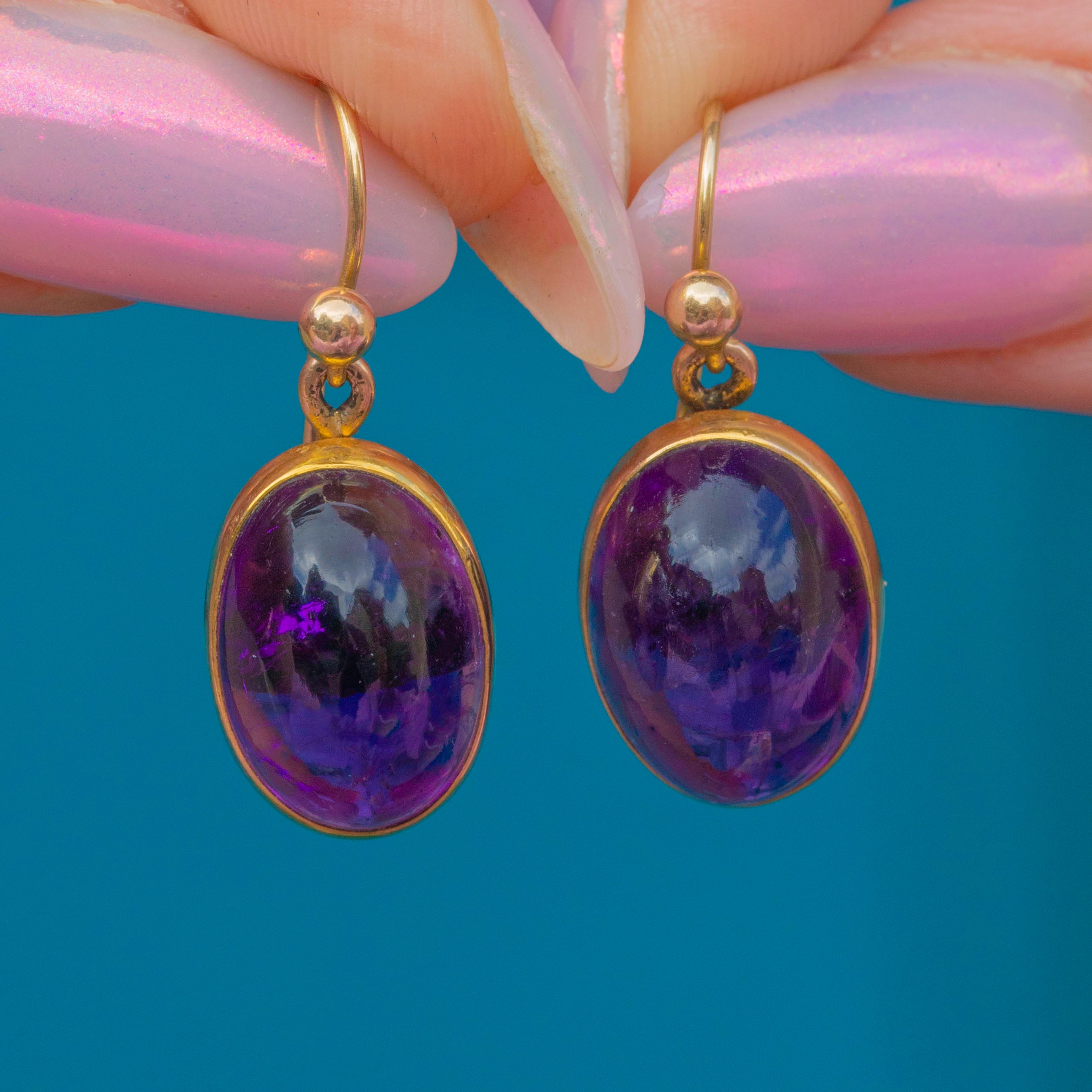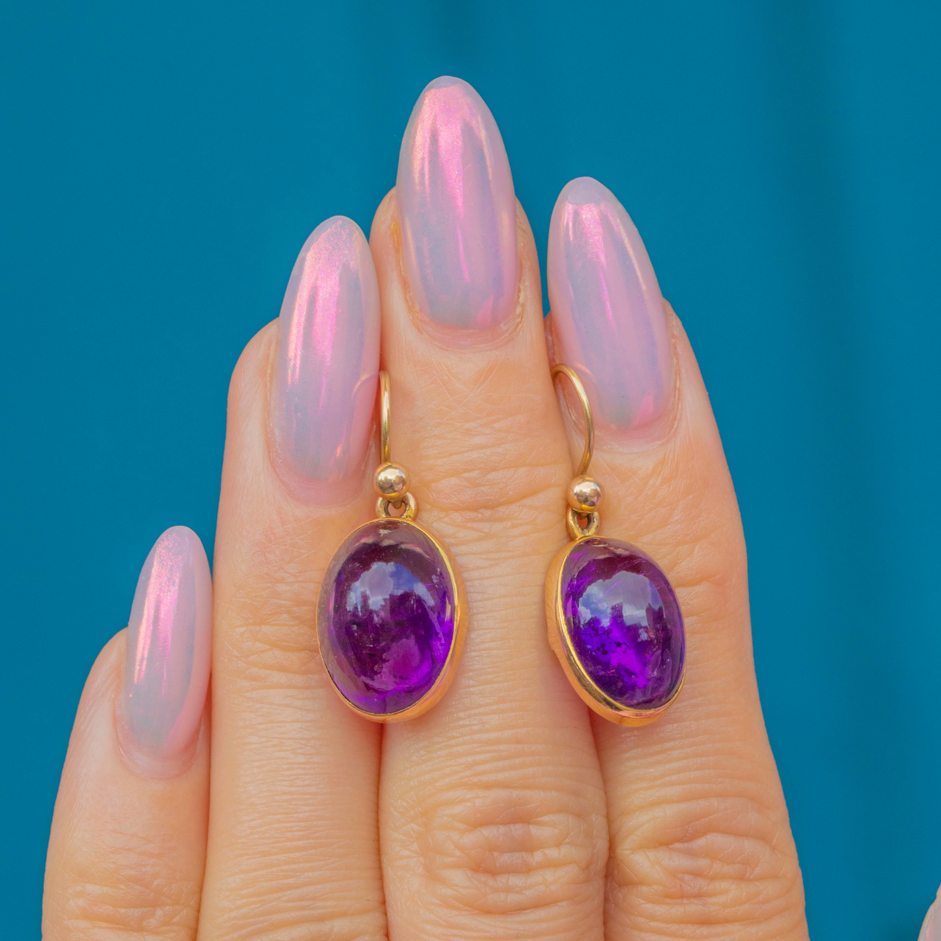 Each Amethyst has been cut into a striking sugarloaf cabochon, with its glossy domed profile radiating saturated deep Royal purple hues. Hugged by sumptuous 9ct Gold bezels and dancing with movement as they suspend from matching hooks, these Art Deco earrings are a colourful delight!