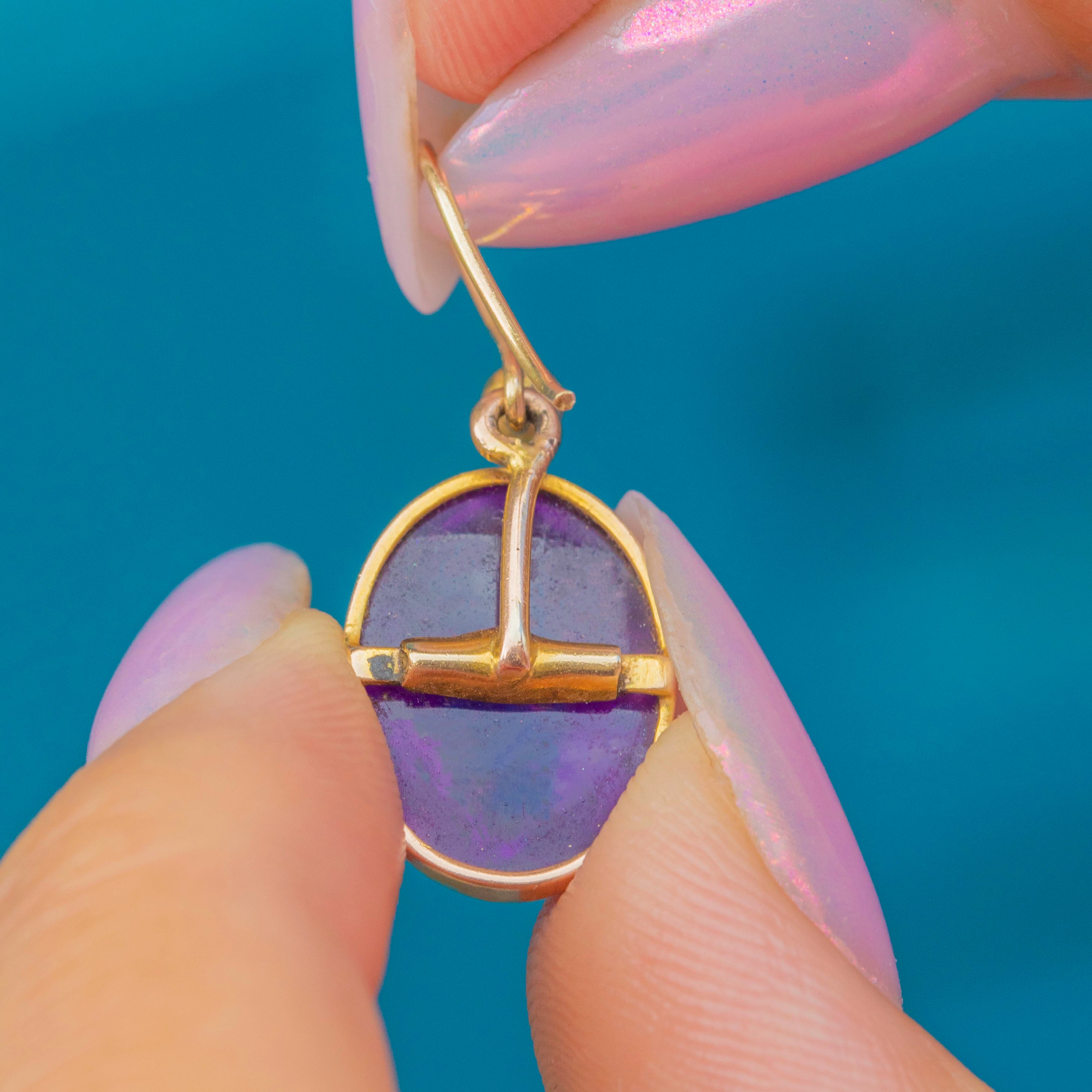EXCELLENT: Each Amethyst is radiant and secure in its bezels. Both are adorned by surface inclusions - what we like to view as a little nod to Mother Nature, and are free chips, scuffs or abrasions! These intriguing and striking earrings appear to have been converted from old antique cufflinks (not by us!), but the work has been done well and to a quaity standard. Complete with secure solid Gold hooks, they hang beautifully so you can wear these Art Deco 9ct Gold earrings with confidence.