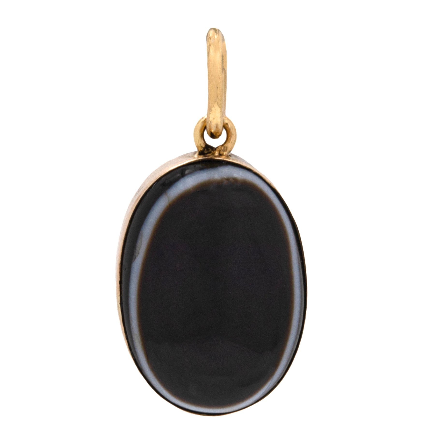 VERY GOOD. This 9ct Gold banded Agate pendant is in very good condition. The banded Agate is smooth to the touch, with no damage to note, and is secure within the bezel setting. On the back of the 9ct Gold there are some marks to both sides from where she has been expertly converted from a stick pin, but rest assured this cannot be seen when worn. With a soldered jump-ring, this Victorian Agate pendant can be suspended from an antique Gold chain with ease!