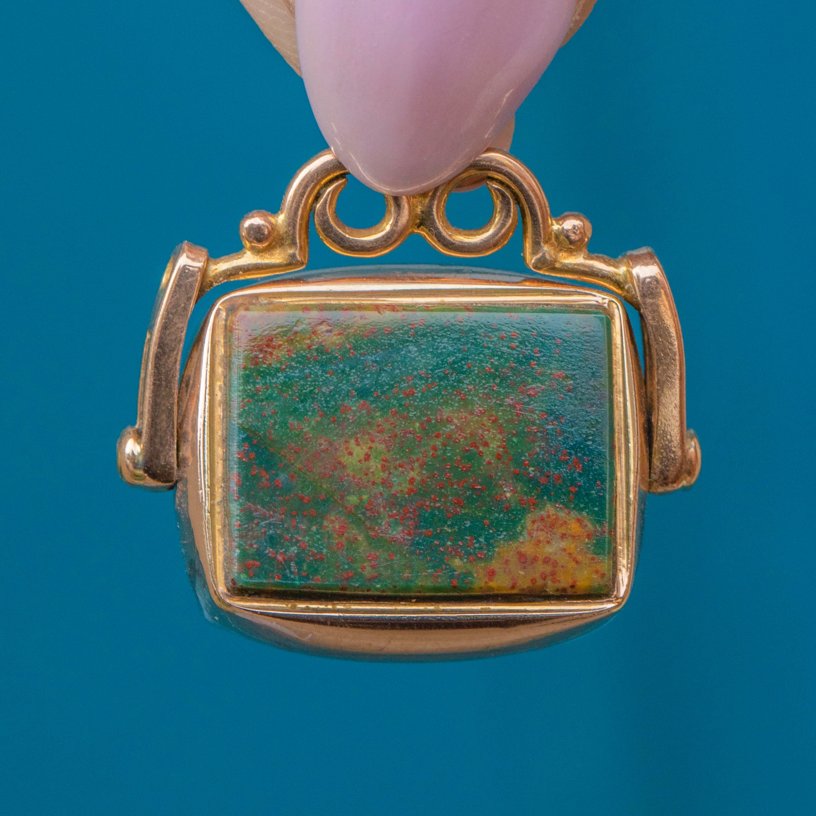 VERY GOOD. This antique 9ct Gold Bloodstone Carnelian square swivel fob pendant is in very good condition. Both her Bloodstone and Carnelian have a smooth rectangular cut, her 9ct Gold has accrued a rich, rosy tone over the years and although she has some wear present, this is commensurate with age. The spinning mechanism works well and is securely affixed promising many more years of enjoyment. All in all, she's a fabulous piece of Victorian jewellery looking for a loving new home!