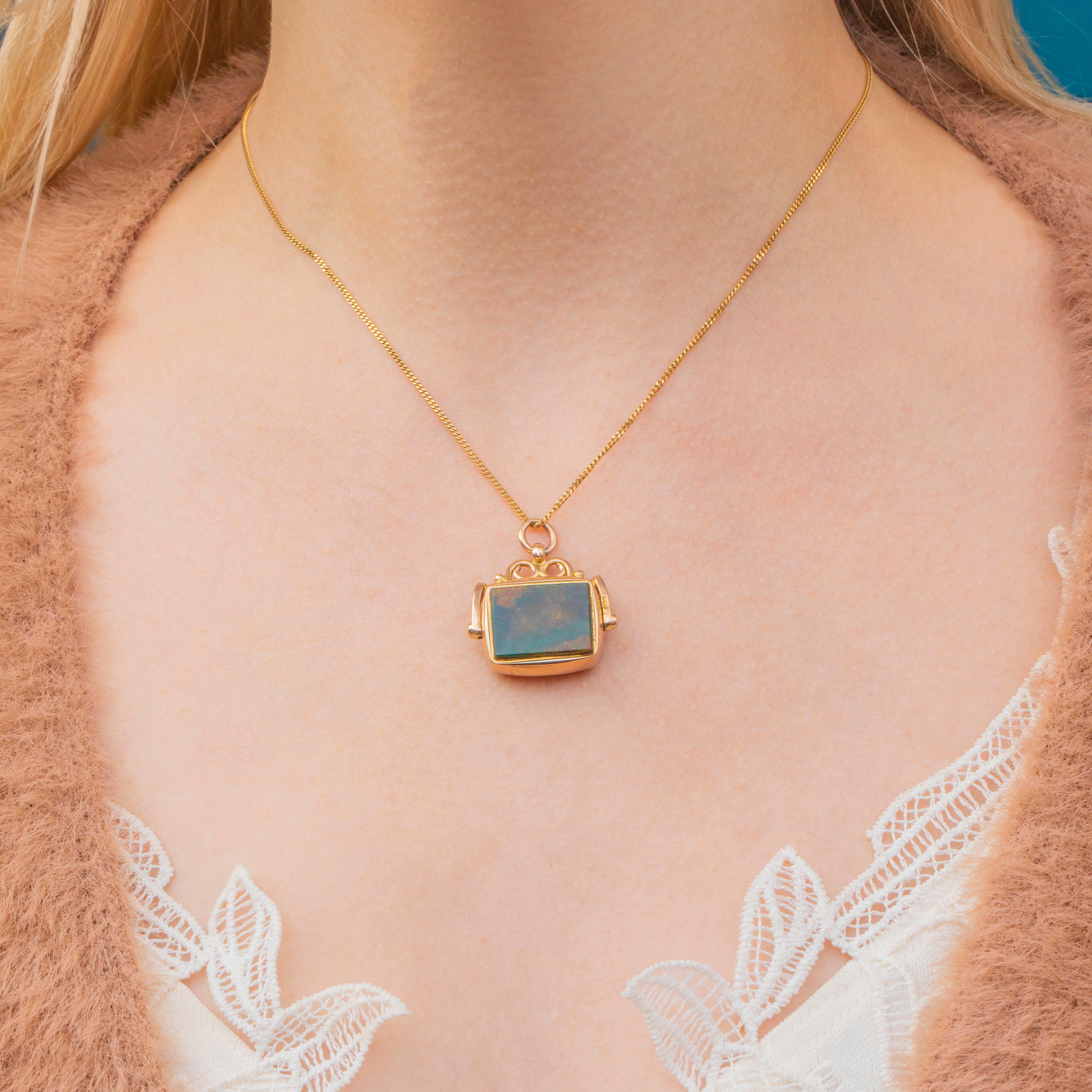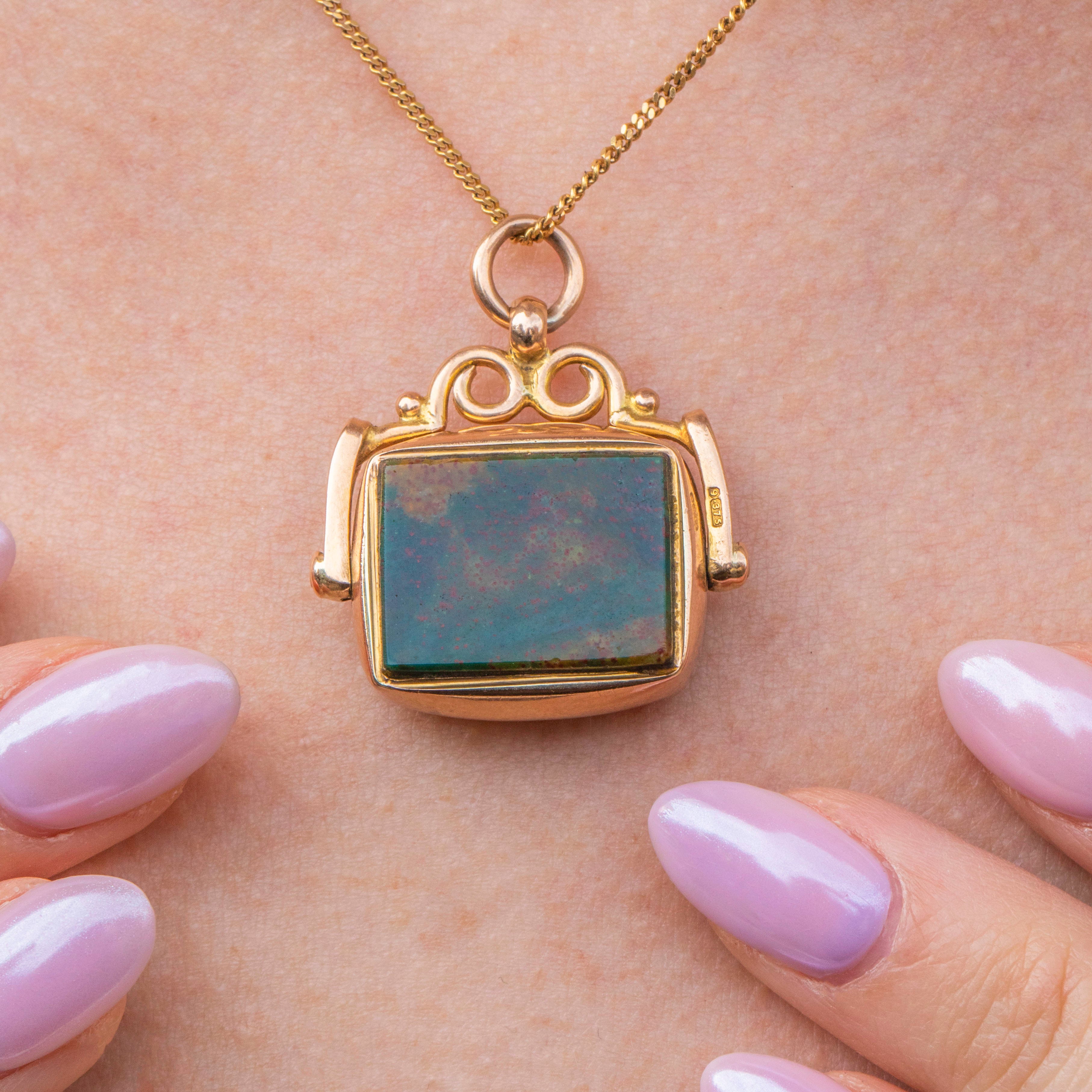 This antique 9ct Gold Bloodstone Carnelian square swivel fob pendant is quite the statement piece! Formed from scrumptious 9ct Gold and inlaid with both Bloodstone and Carnelian, you'll glimpse flashes of deep inky purple and crimson-flecked forest green as she effortlessly spins.