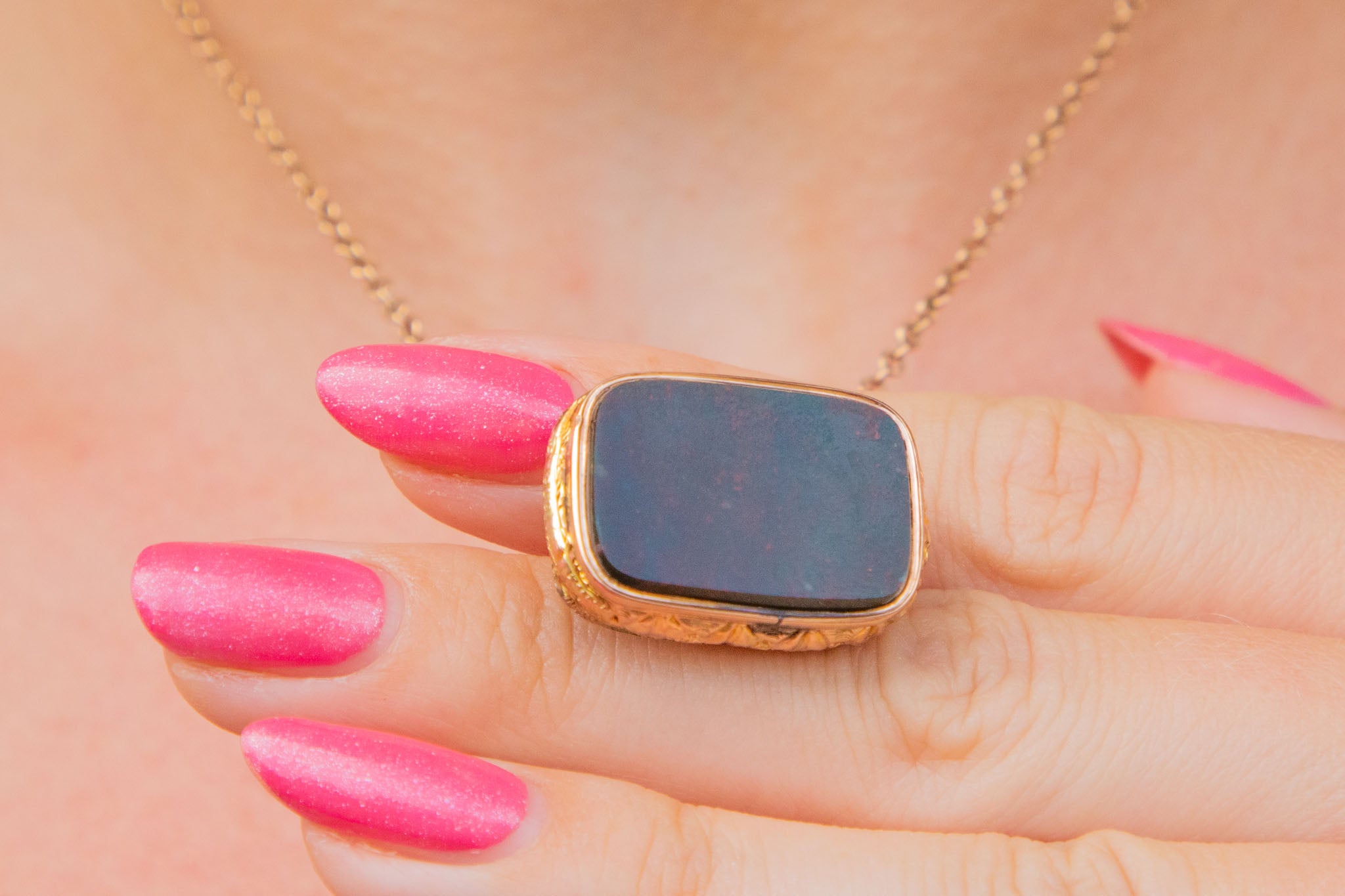 This antique 9ct Gold Bloodstone fob pendant has the most regal aura! Every inch of her radiant Gold casing is adorned with charming engravings and her inky Bloodstone boasts delicious blood-red speckles.