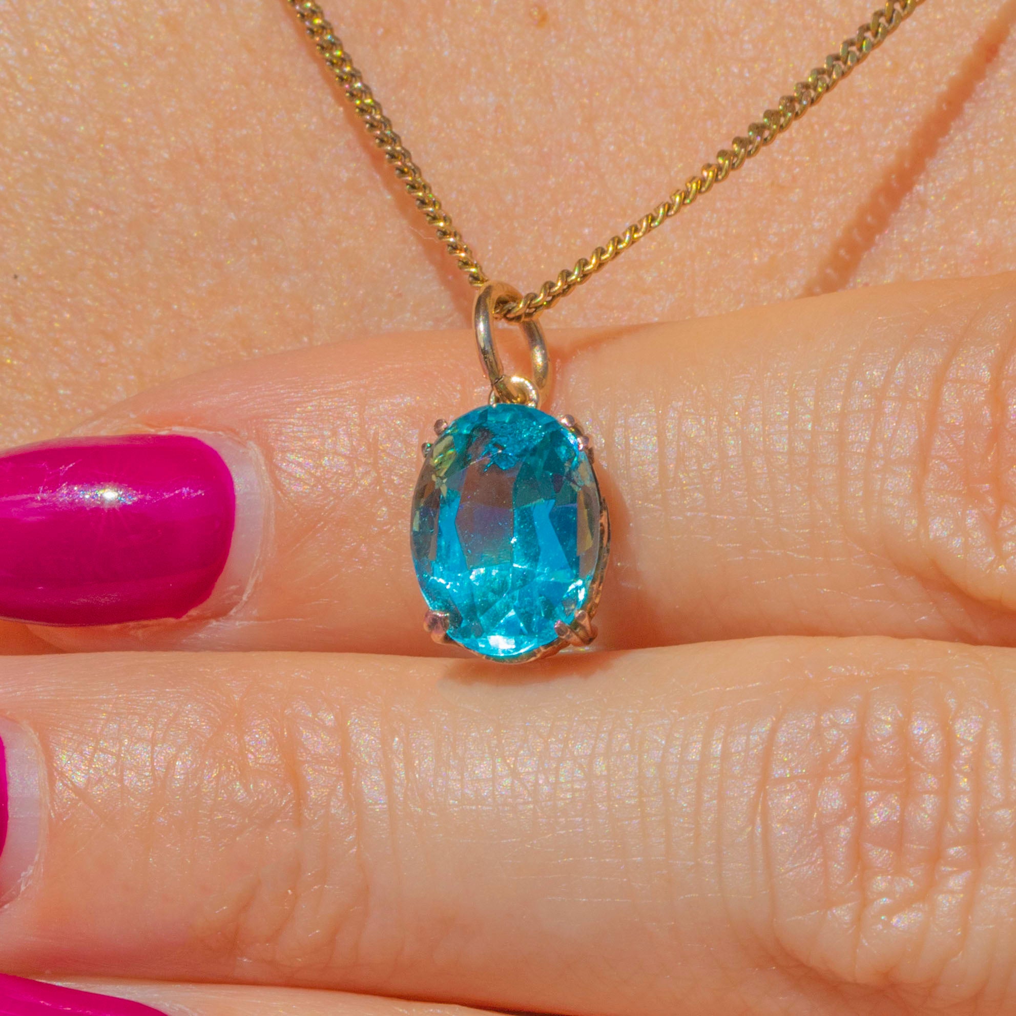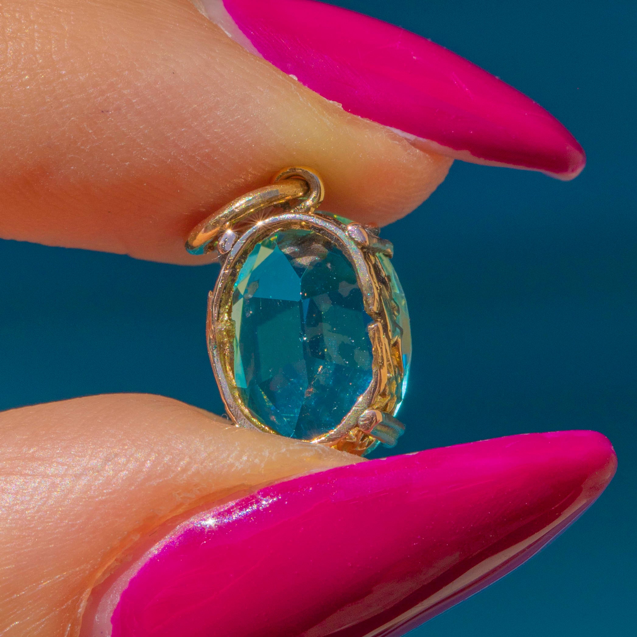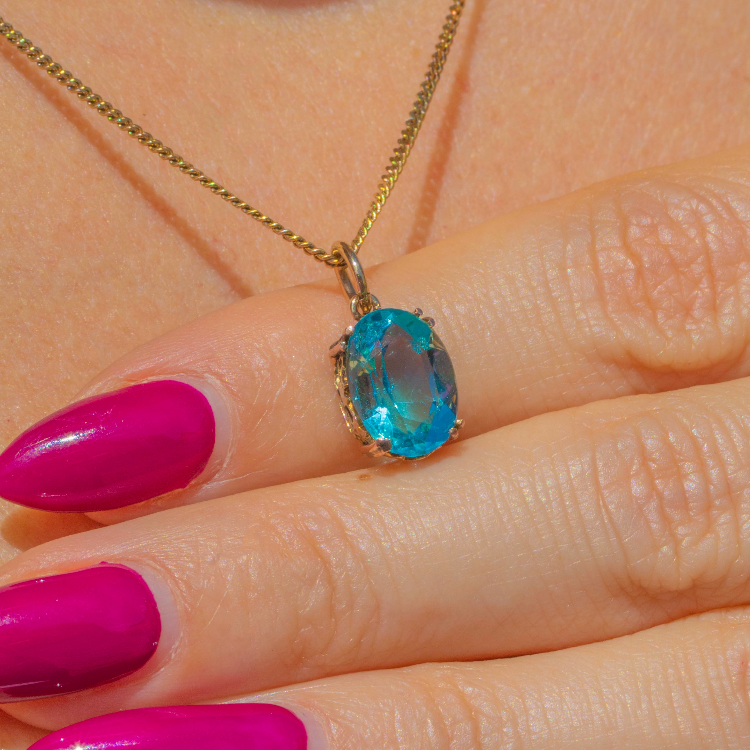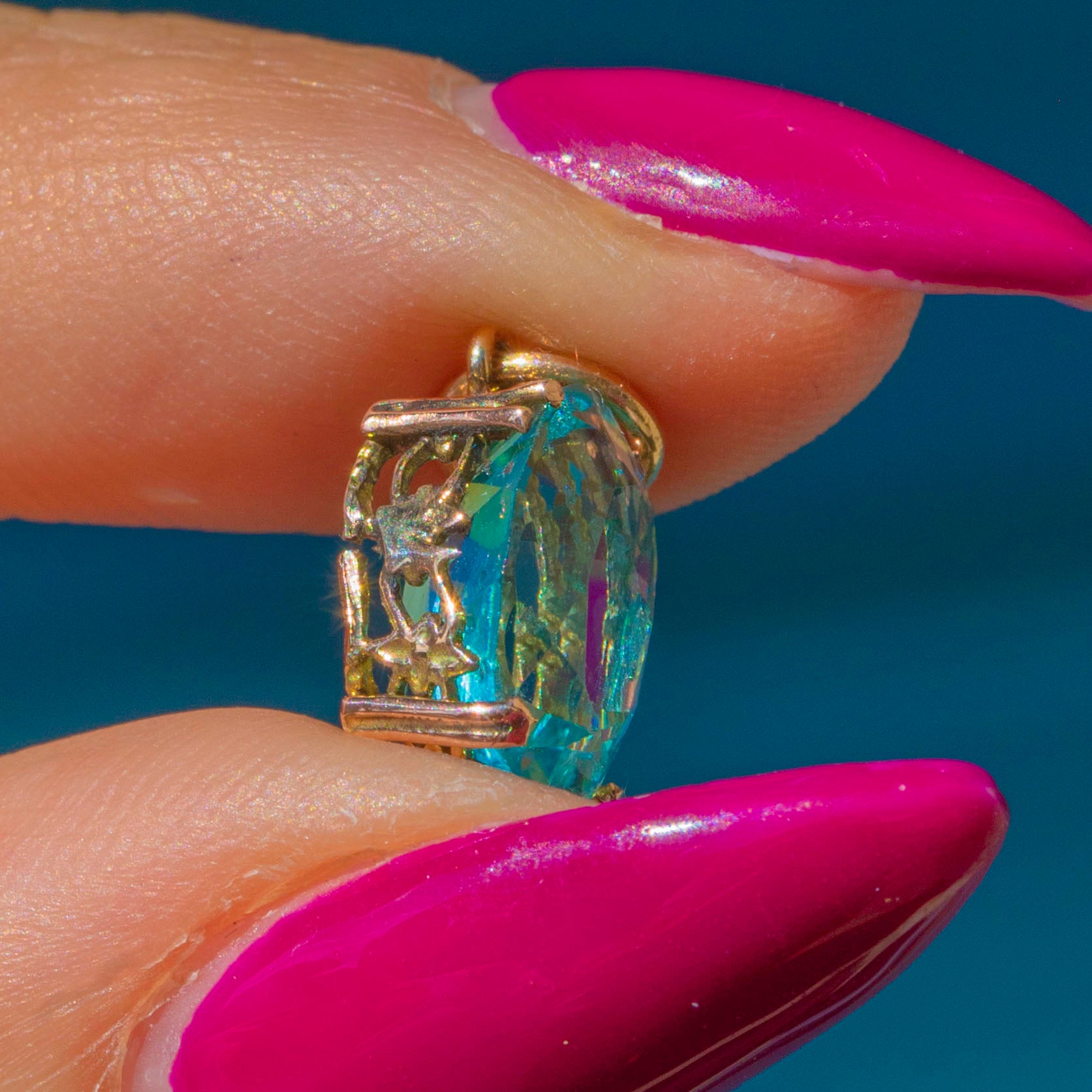 A vibrant aqua-blue Paste charm, displayed in ornate 9ct Gold settings!