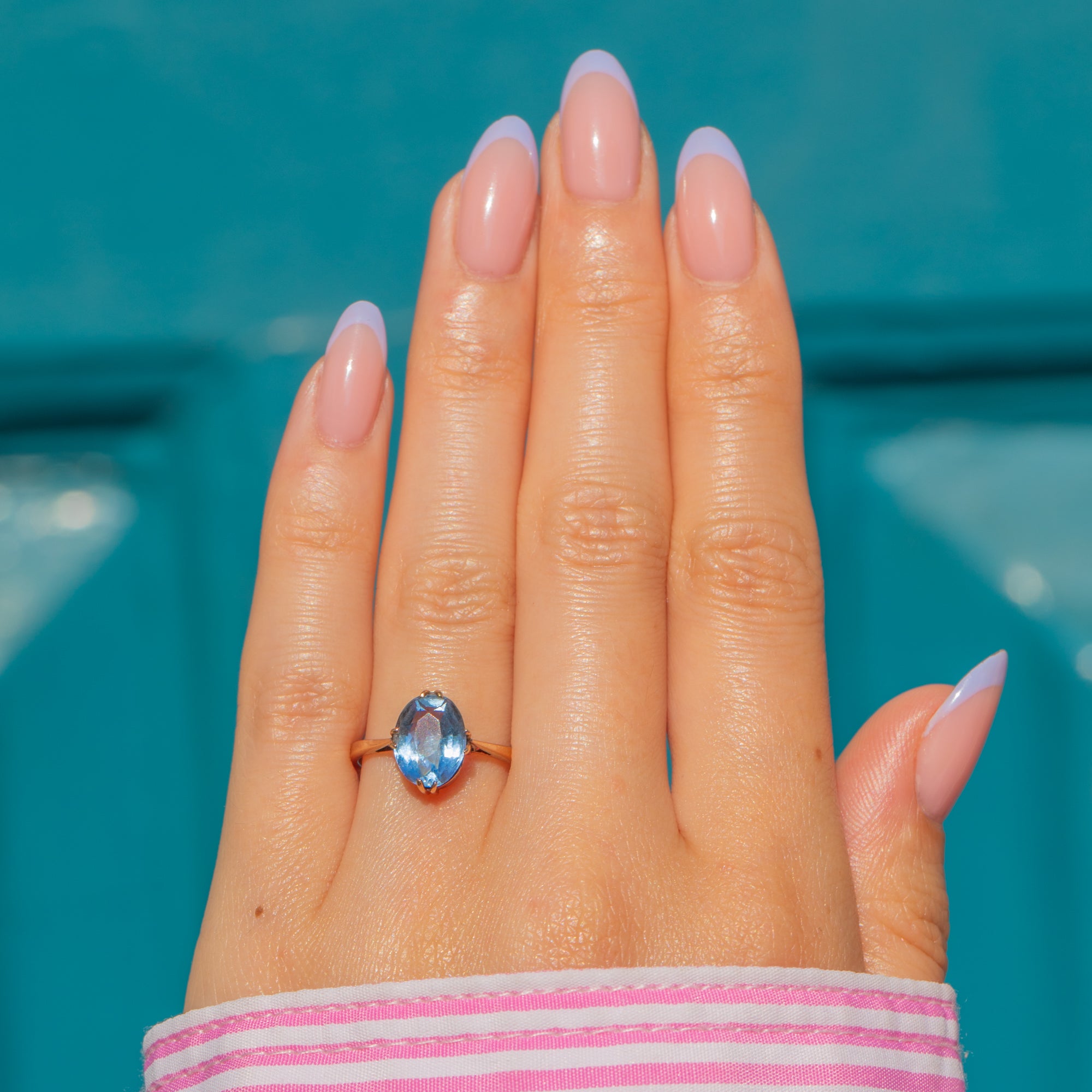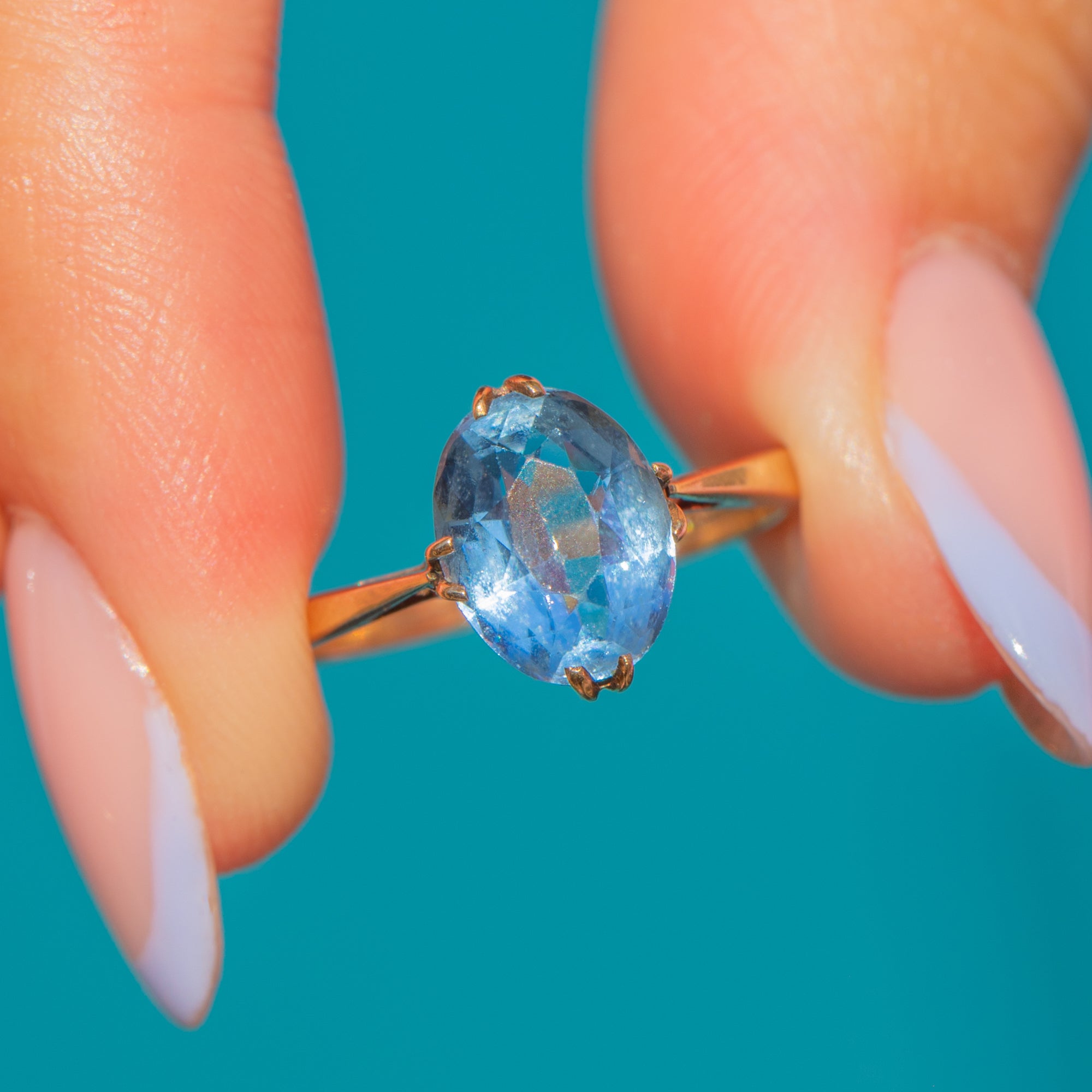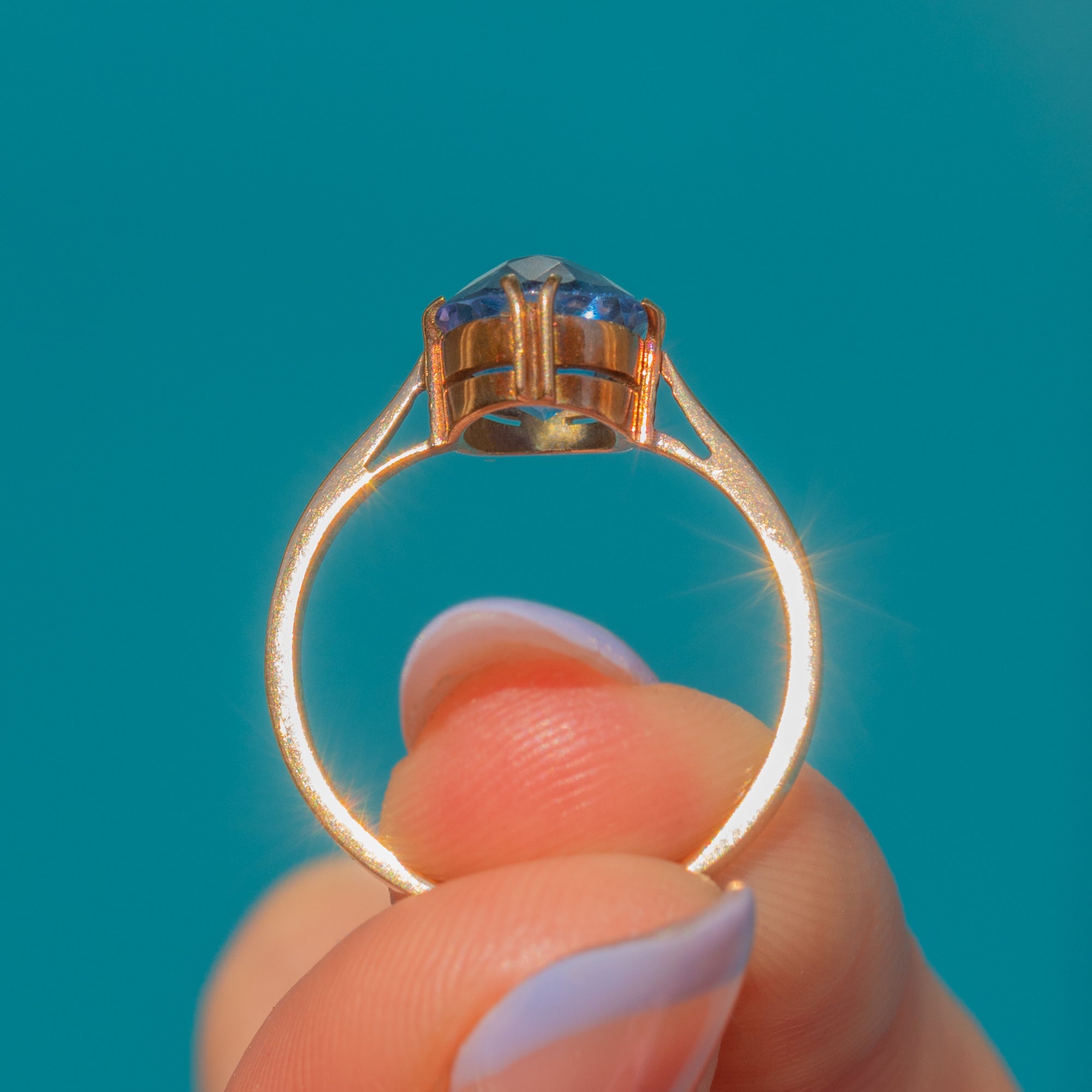 Add a pop of colour to your attire with this antique 9ct Gold blue Paste solitaire ring!