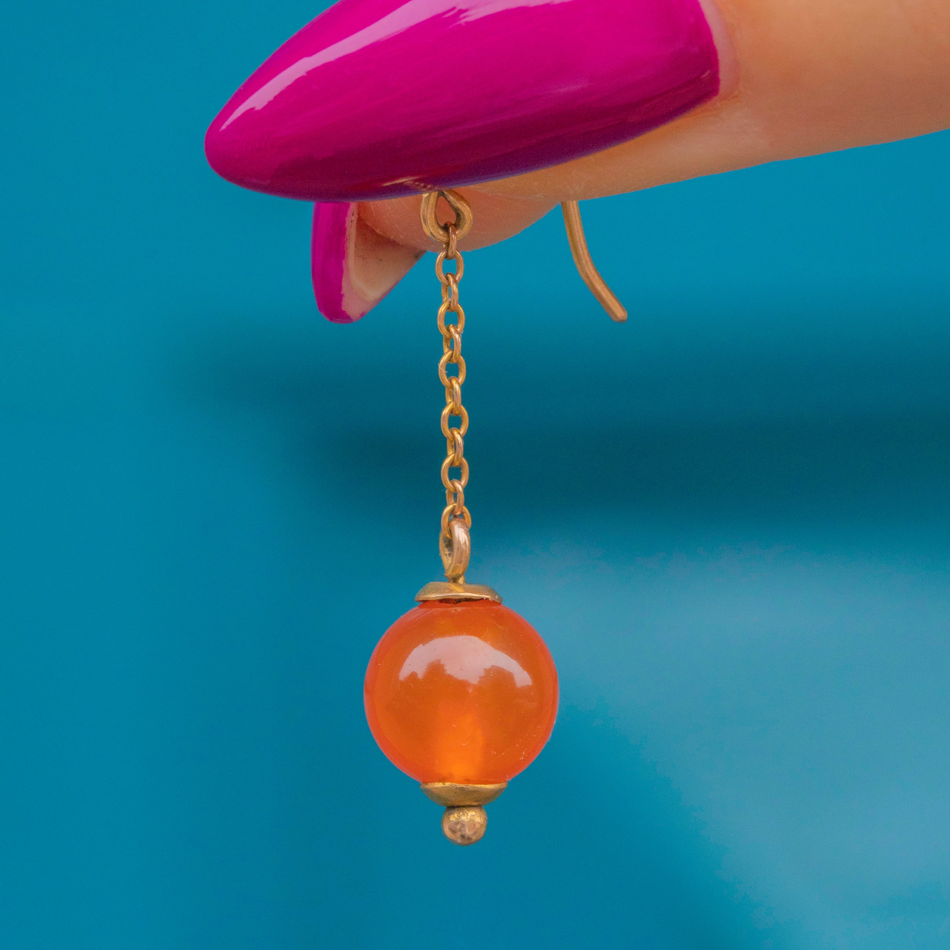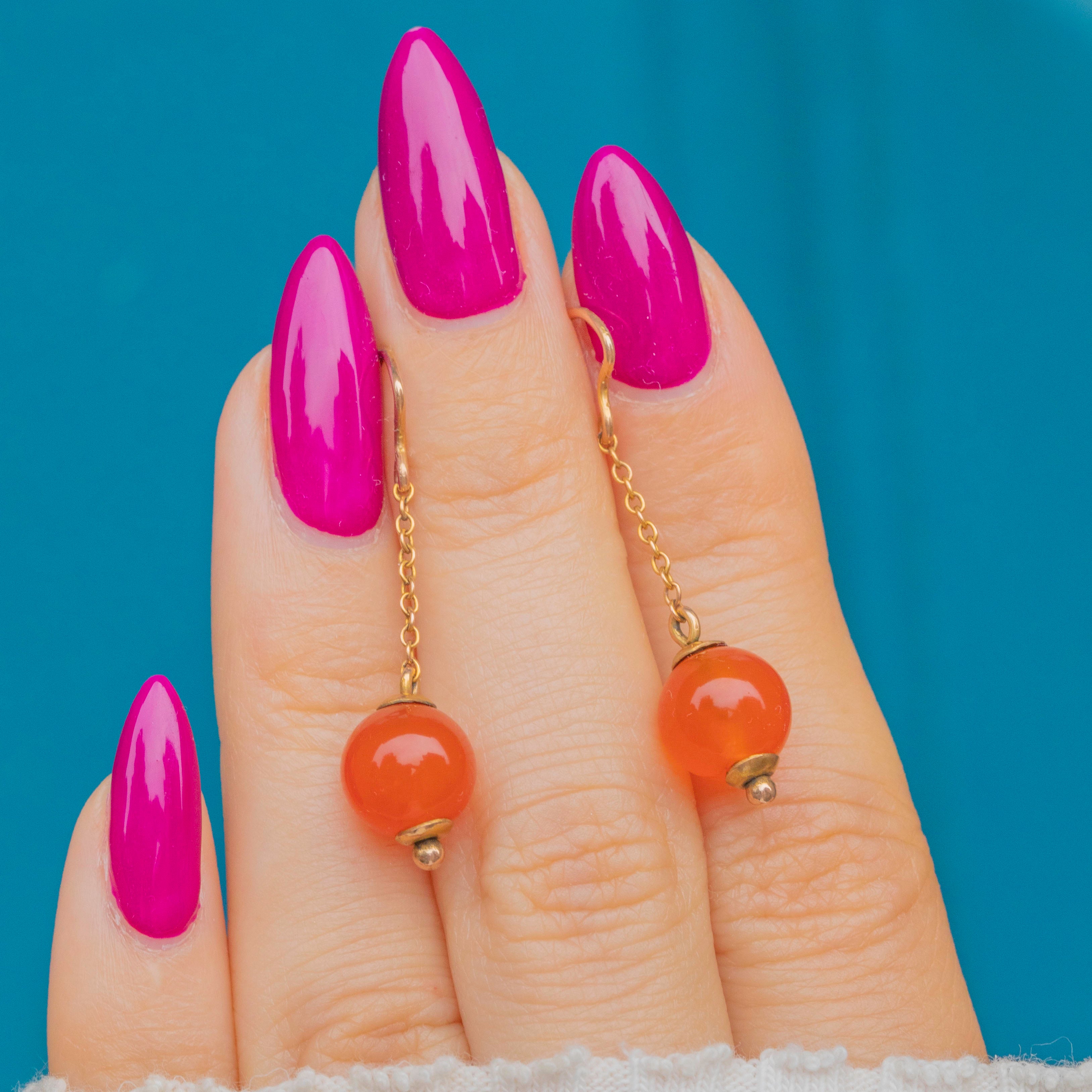 These Victorian Carnelian drop earrings are peachy delights and endlessly satisfying, with their 4.00cts of smooth Carnelian orbs swaying gently as they suspend from your lobes. The vibrant orange Carnelian spheres are beautifully complemented by the 9ct Gold, creating an elegant pair for everyday or occasion wear.
