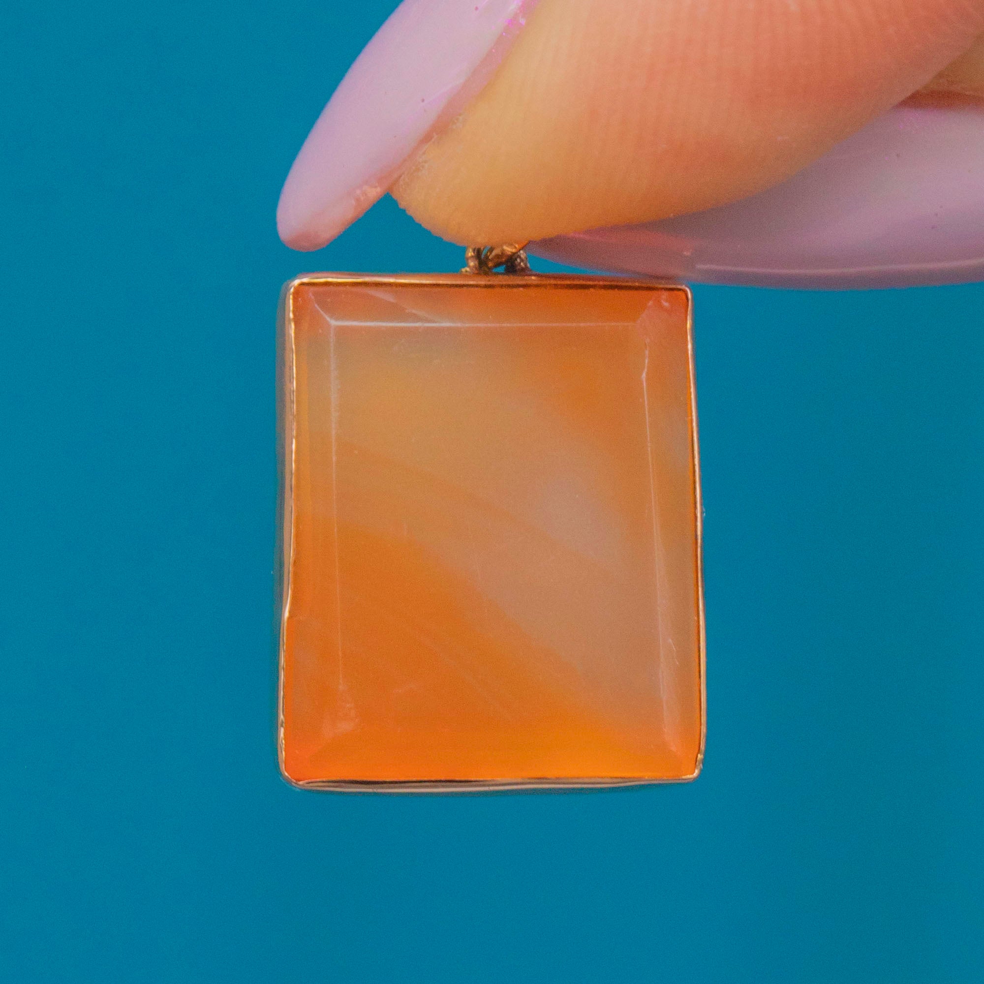 VERY GOOD: The Carnelian is smooth, polished, and securely set in a robust solid Gold rim. The 9ct Gold frame and jump ring are in excellent condition with only light age-related wear. There is some evidence on the back of the pendant that this piece was perhaps part of a larger suite, and there is a small chip or nick in the Agate on the top left quadrant of the pendant. - But his is quite subtle.  All in all a charming Victorian pendant with beautiful warm colour and classic simplicity.