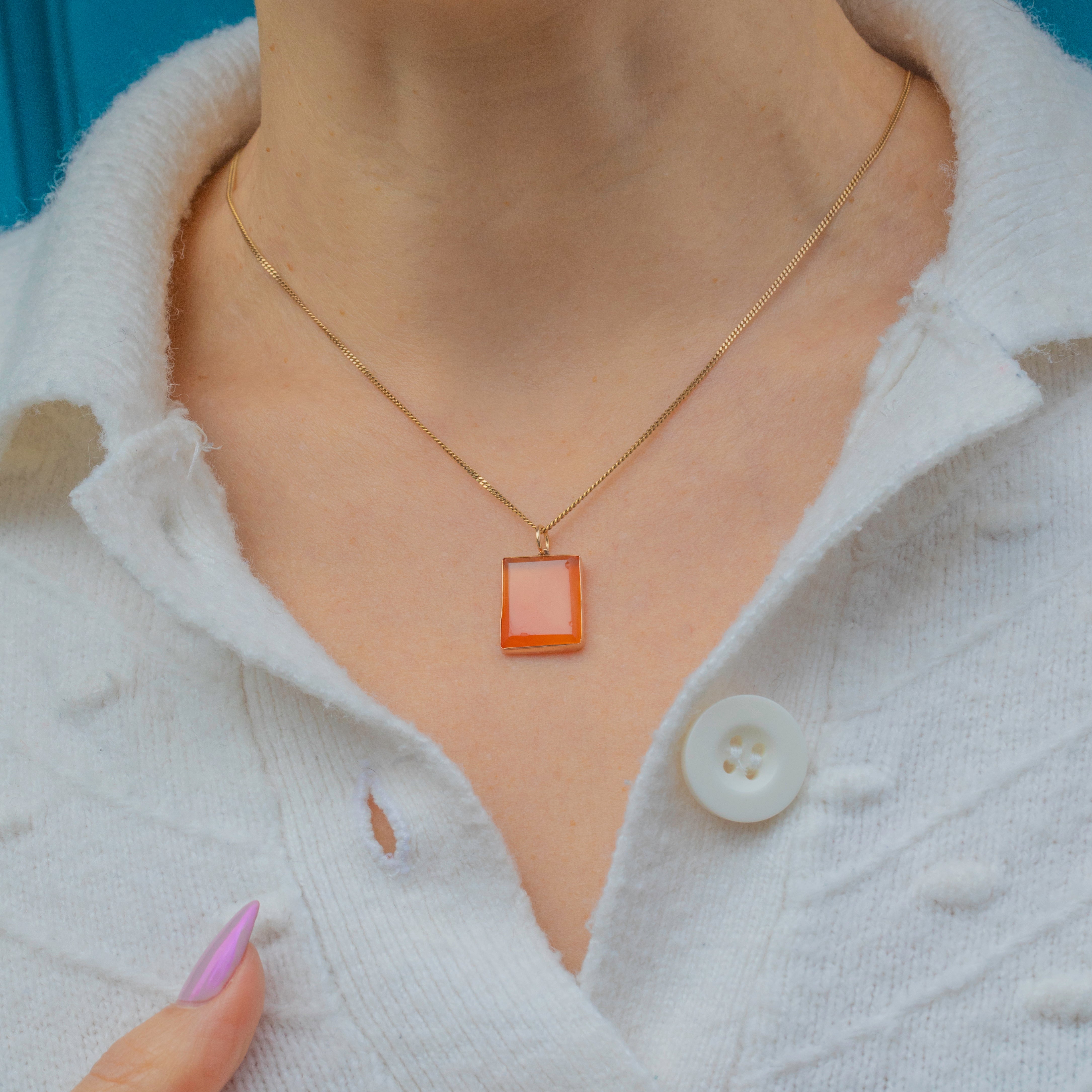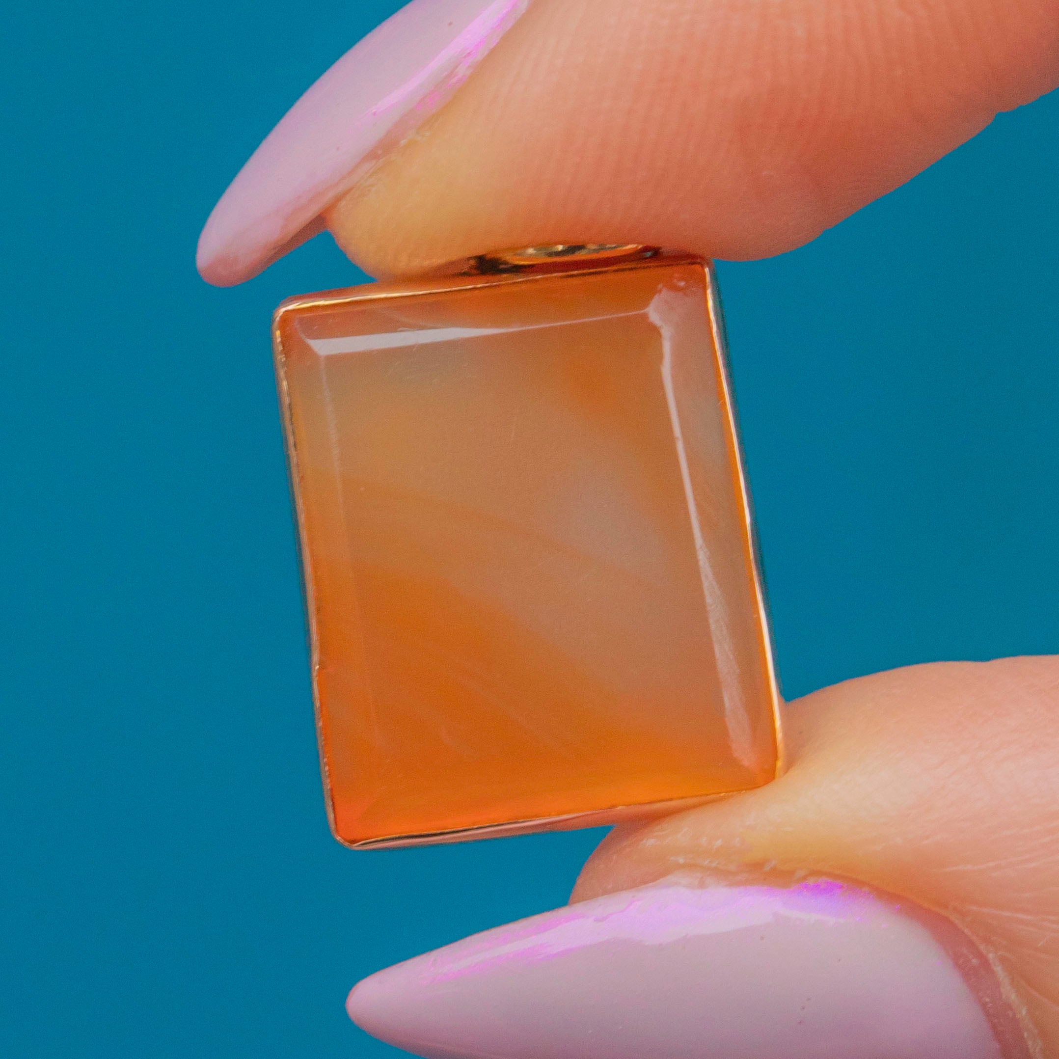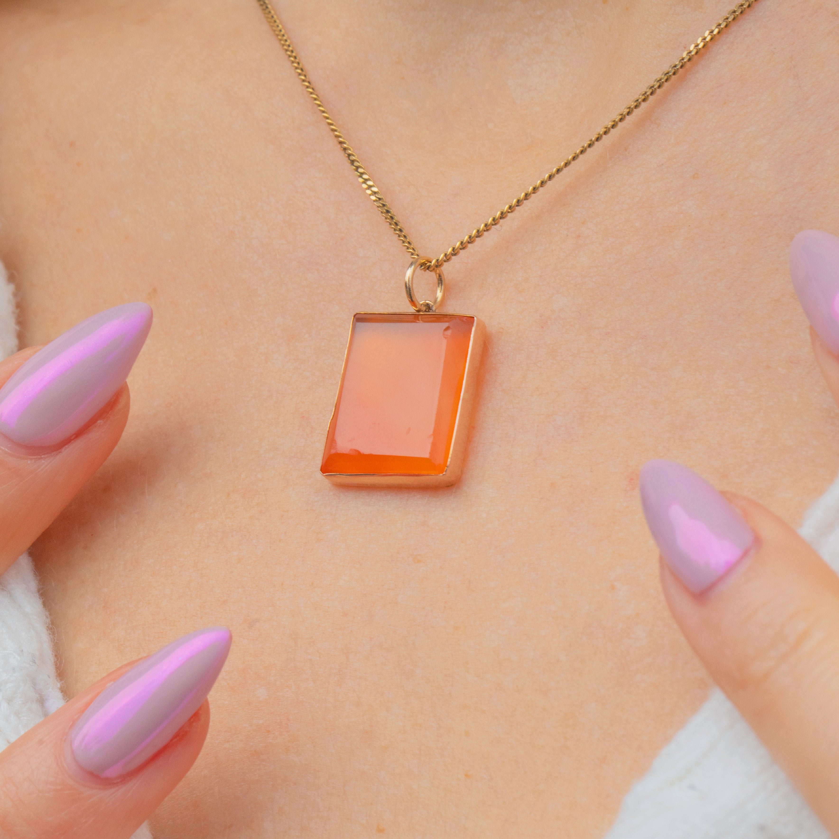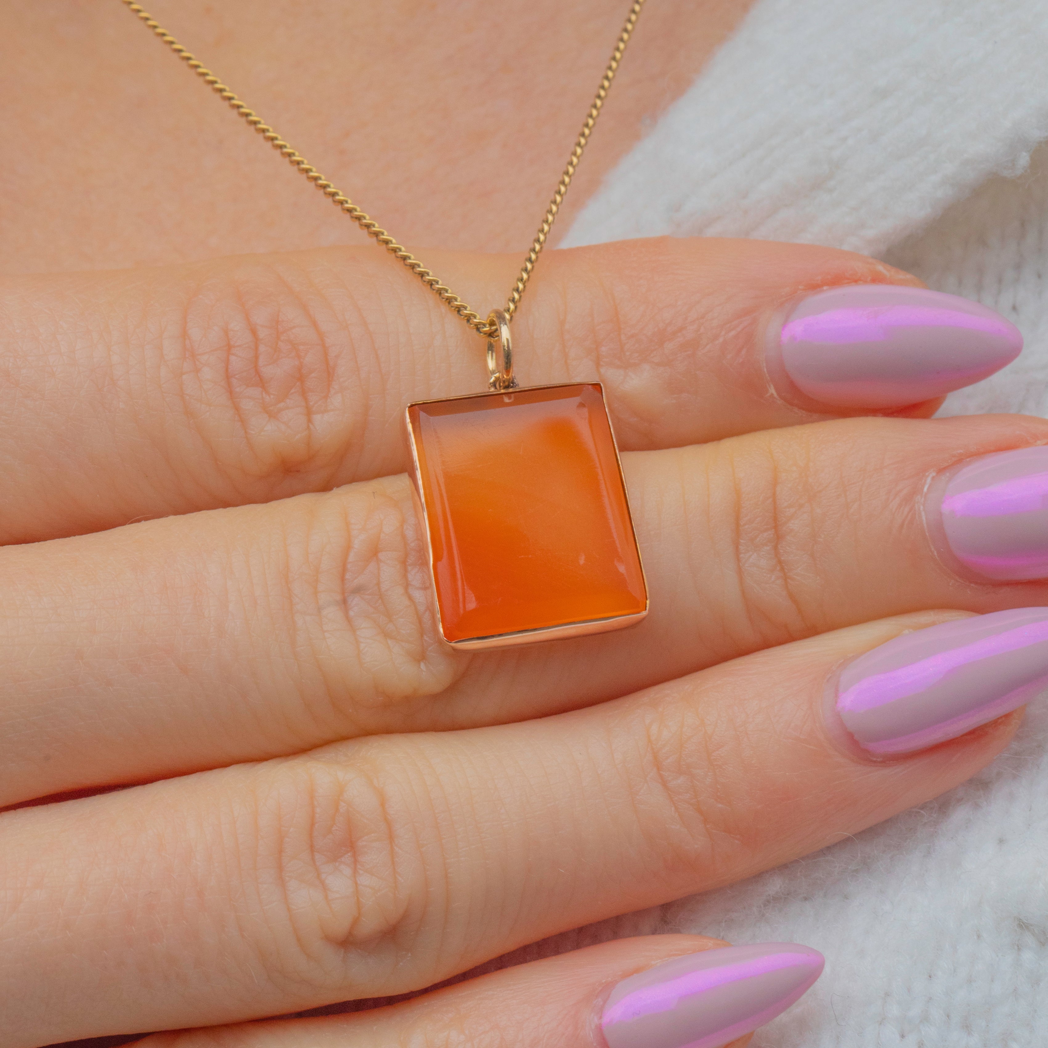 A beautiful Antique Victorian pendant set with a rich burnt-orange Carnelian cabochon in a simple 9ct Gold frame. The smooth, glossy surface of the Carnelian glows warmly in the light, showcasing the natural depth and translucence of this beloved gemstone.