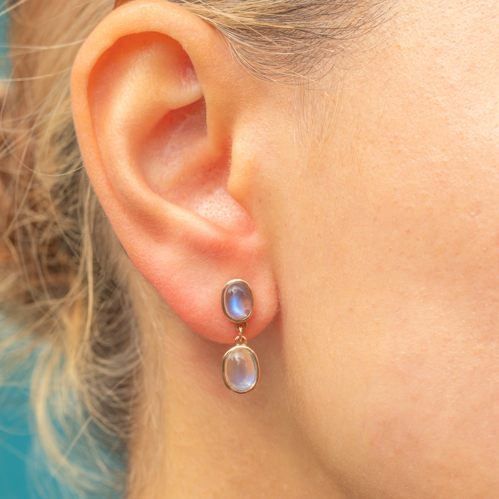 The Moonstones, boasting 2.00ct combined, shimmer with a gorgeous blue adularescence and are hugged by sumptuous 9ct Gold bezels. Each drop suspends elegantly from its long, slender hook and dances with movement; they are the perfect pair for everyday and occasion wear.