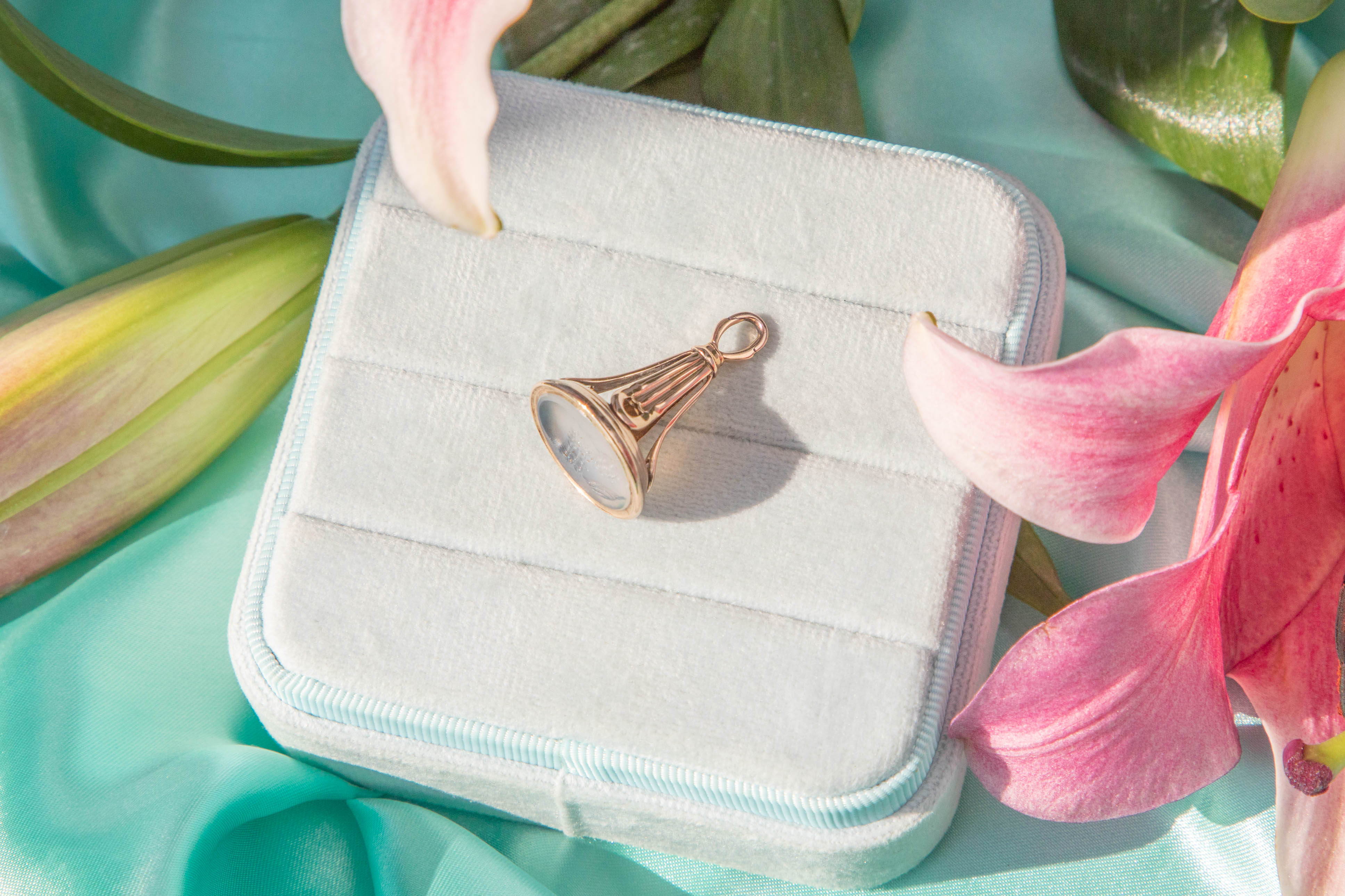 A remarkable antique 9ct Gold Chalcedony intaglio fob pendant! Her 9ct Gold open pillars are sun-kissed with rosy hues with gorgeous ornate detailing throughout, allowing the light to beam through them and hit her milky Chalcedony.