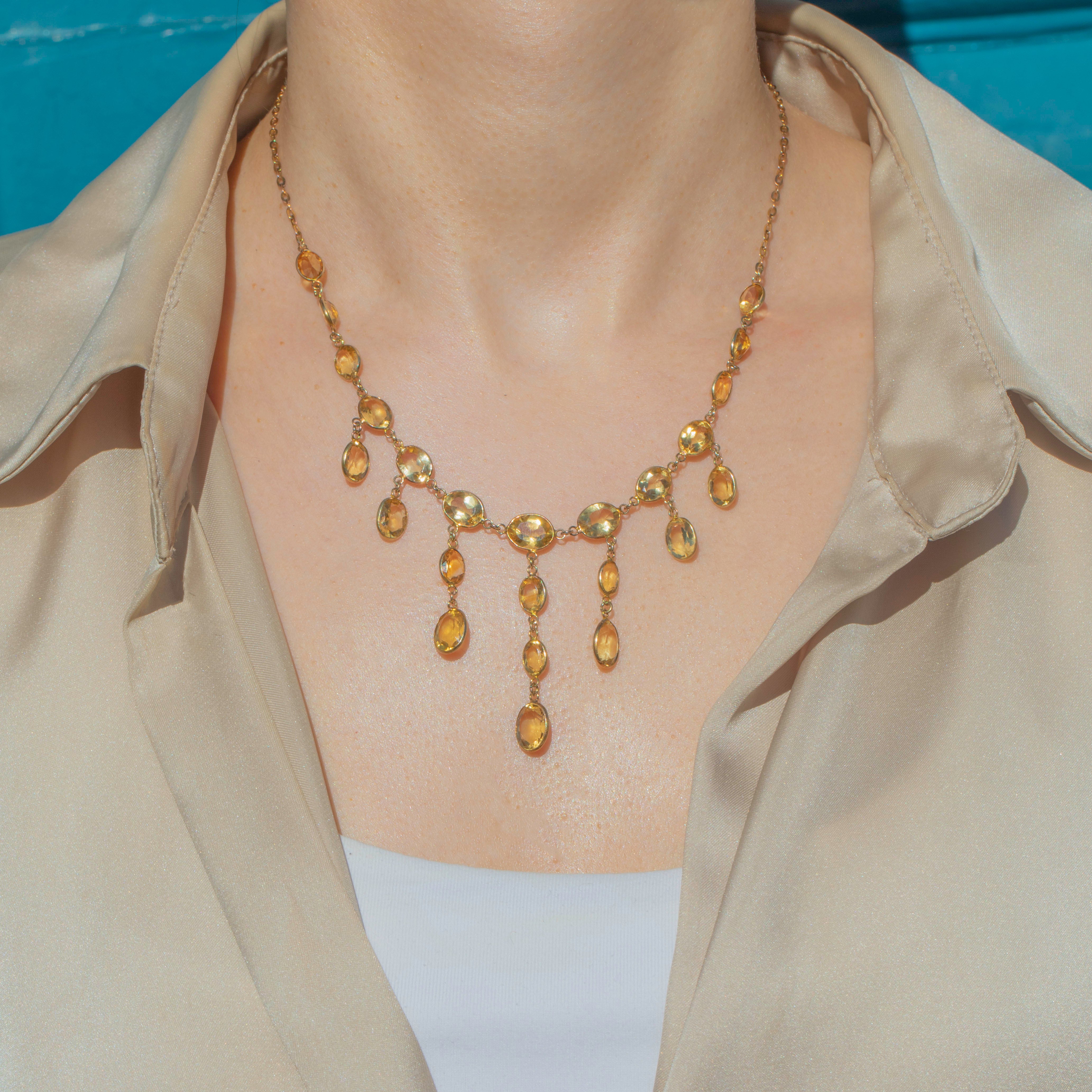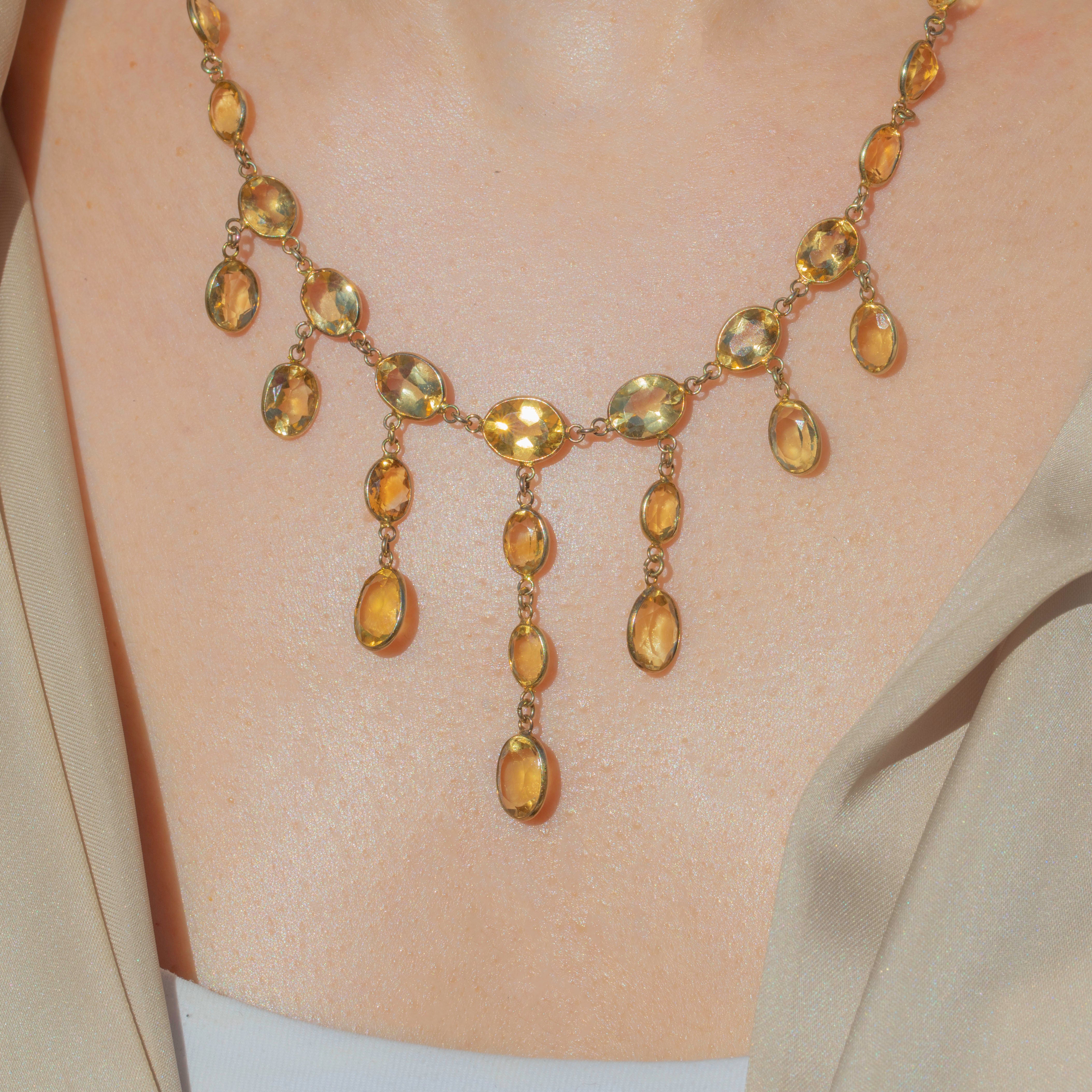 EXCELLENT: This antique 9ct Gold Citrine bezel-set fringe necklace is in excellent condition. Each Citrine is securely set and retains a scintillating sparkle -with only very minor wear to the stones, commensurate with age. The Gold is bright and buttery, with only light wear to the settings, but this is all subtle and the Citrines remain securely set. All in all, she is a divine Edwardian necklace that you're certain to fall in love with!