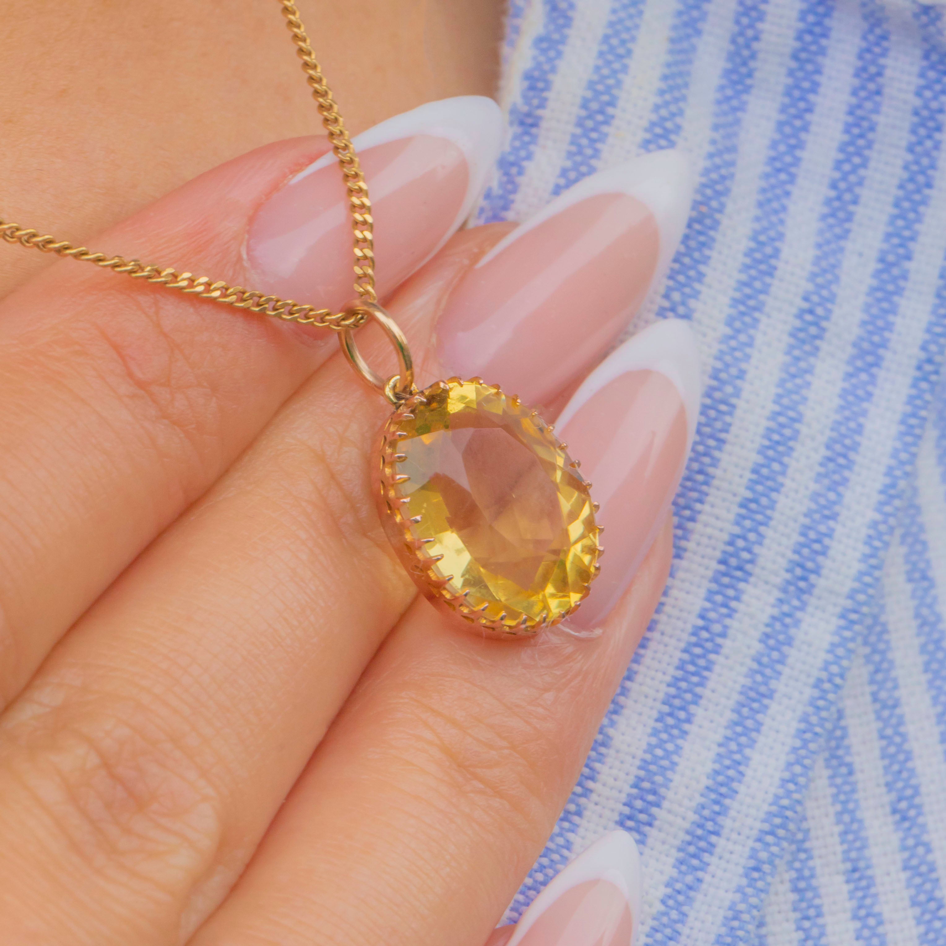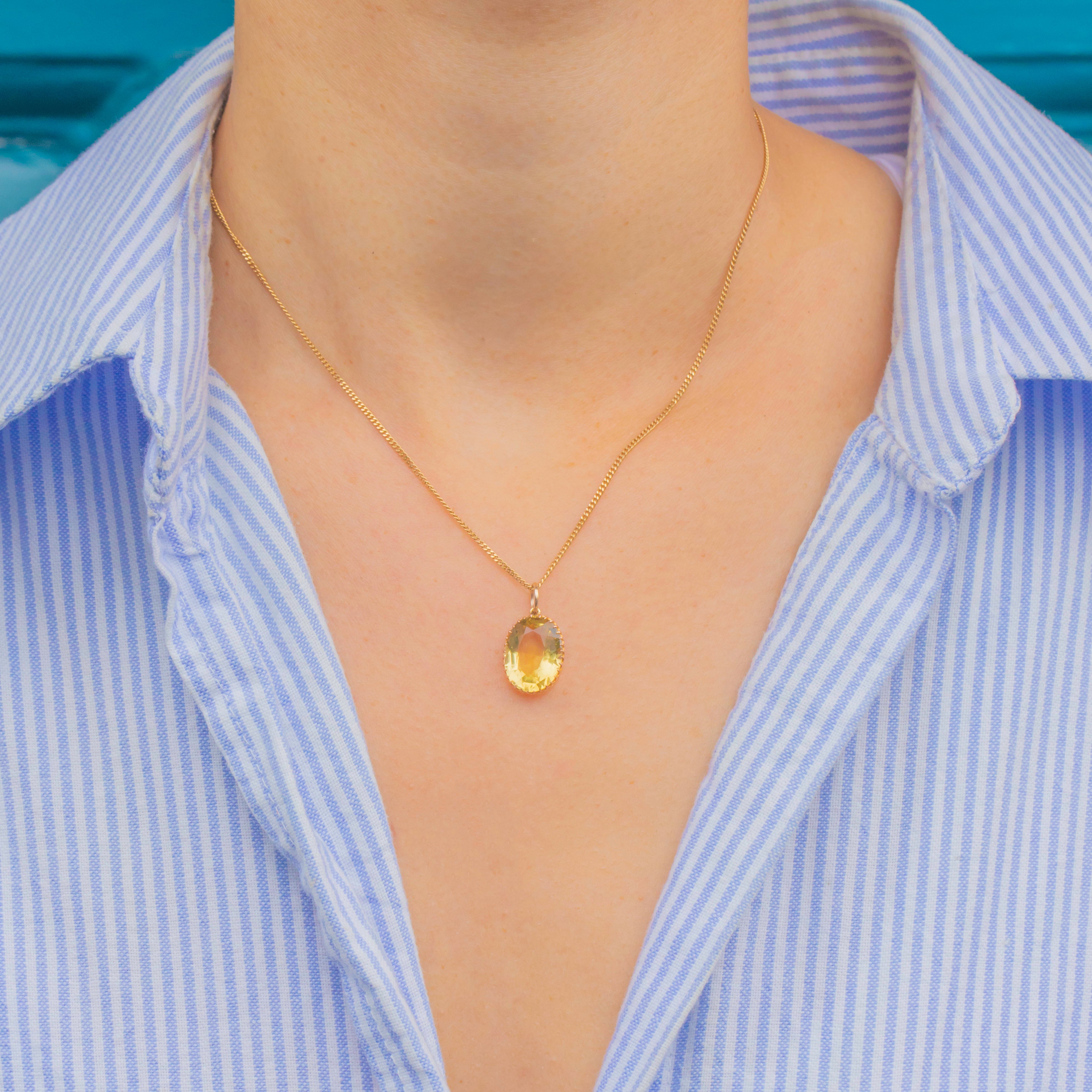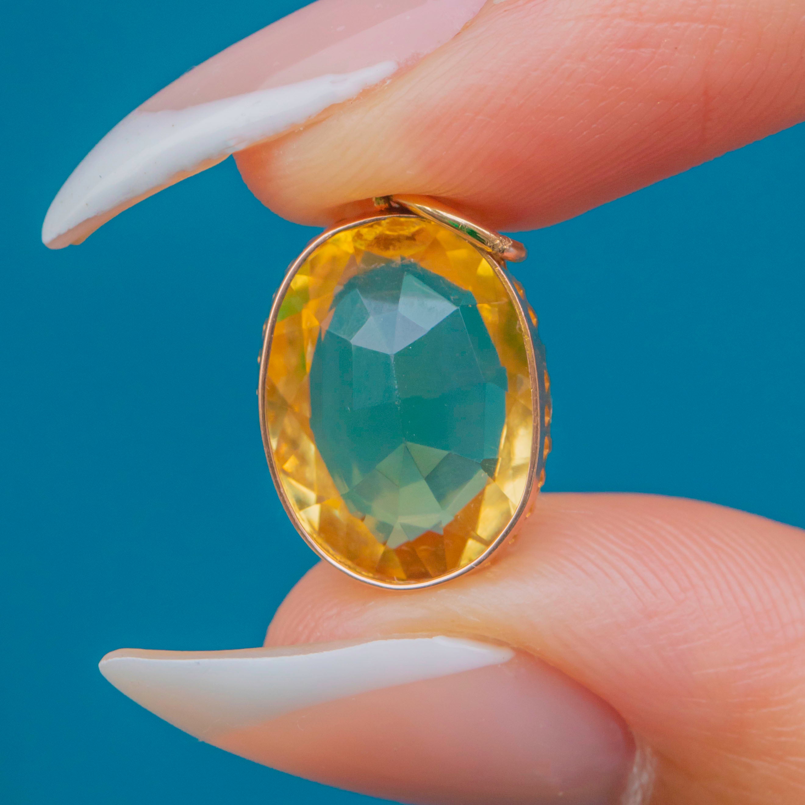 Hugging her show-stopping Citrine are claw settings, crafted from 9ct Gold, offering a buttery tone that marries perfectly with the Citrine's heartwarming hues. This Victorian Citrine pendant is just bursting with character, she is too good to resist!