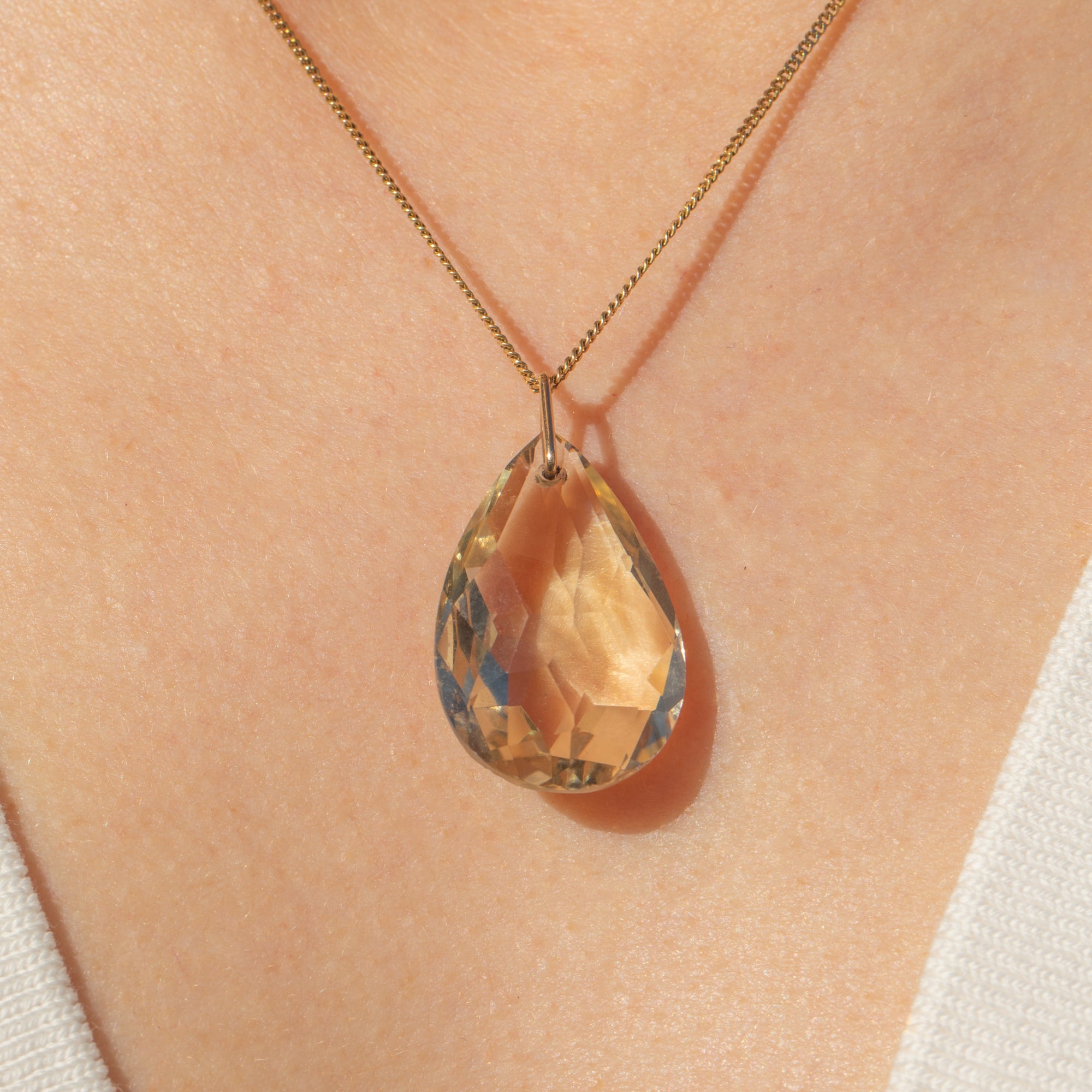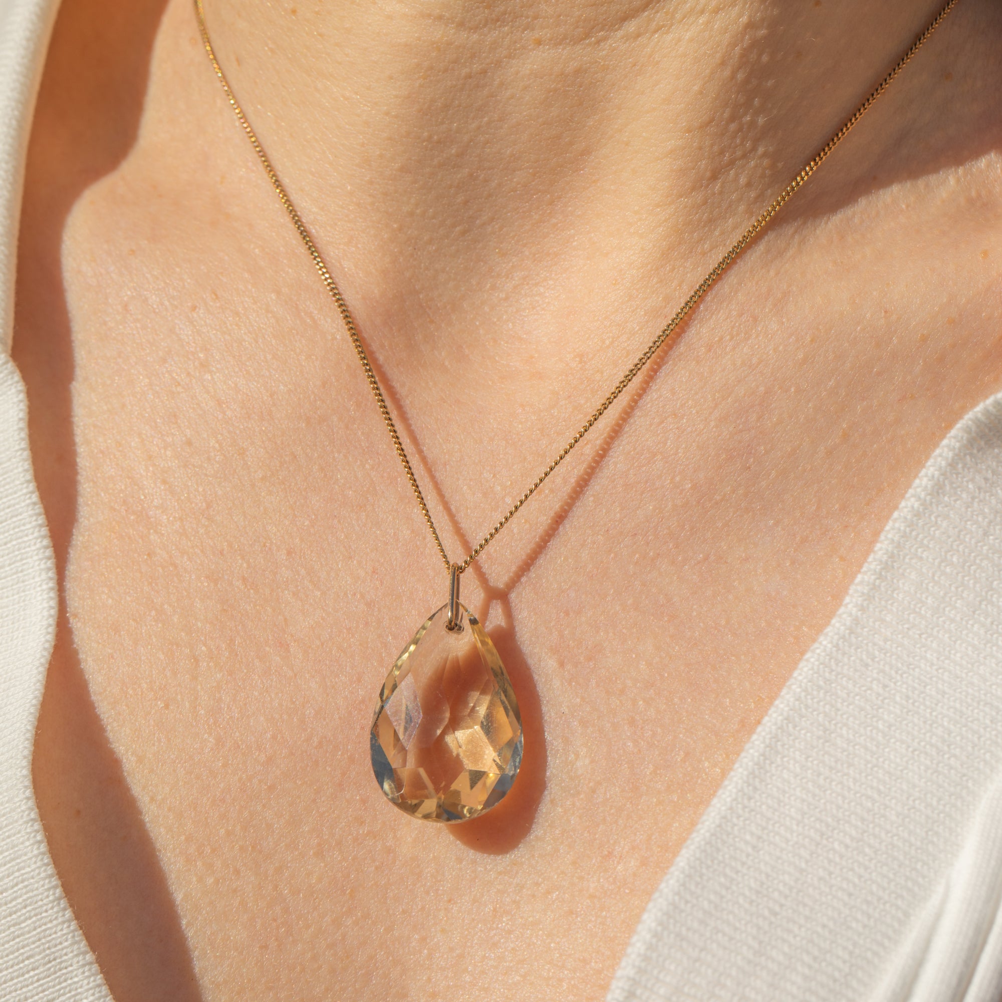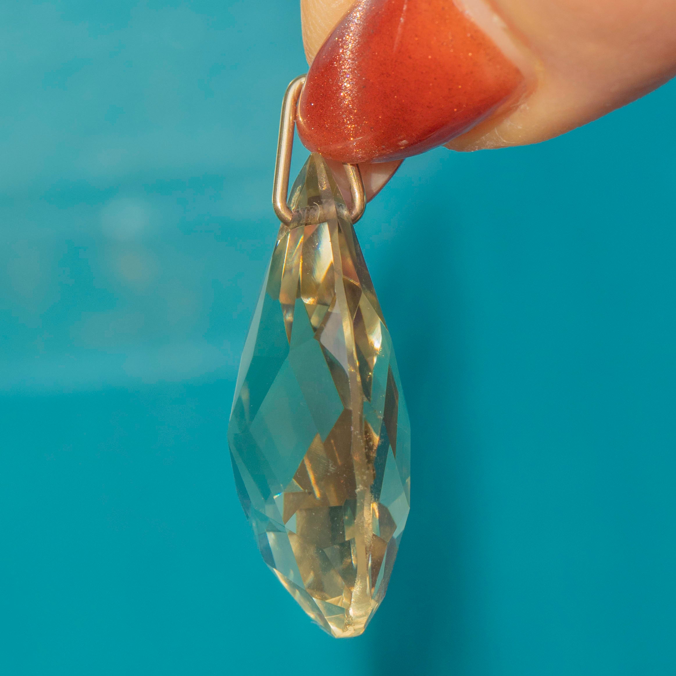This joyful antique 9ct Gold Citrine pear drop pendant will bring an irresistible glimmering accent to your décolletage! The pear-cut Citrine boasts an impressive 25.29cts and has been exquitely faceted, exuding lemony hues as they glint in the light.