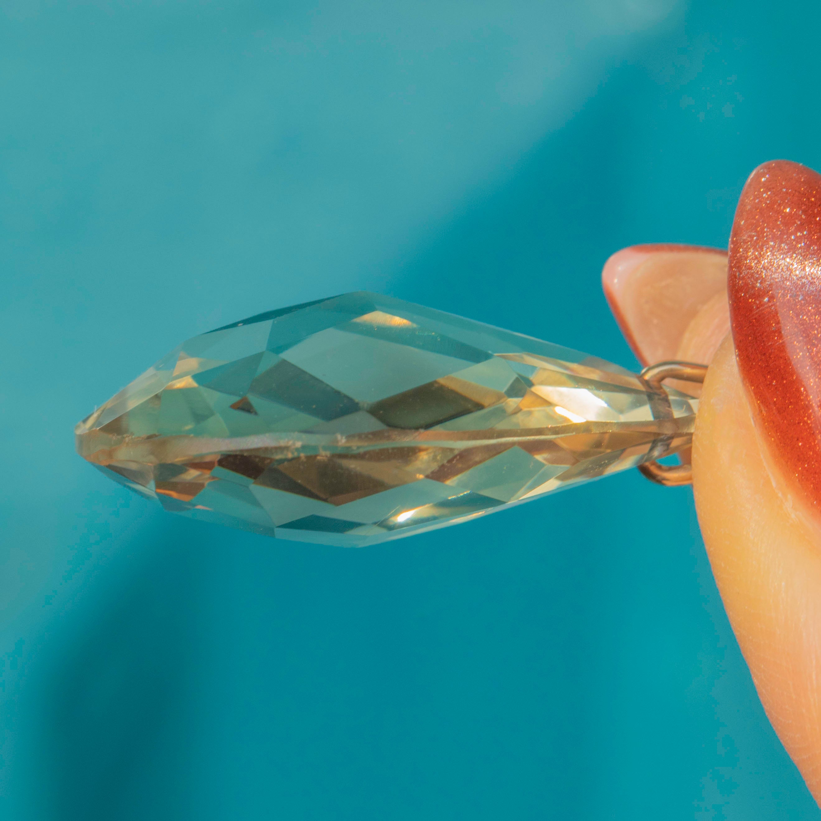 VERY GOOD. This antique 9ct Gold Citrine pear drop pendant is in very good condition. The Citrine has a delightful pale yellow hue with crisp cut facets. Under close inspection, there are some minor fleabites on the surface of the Citrine, which is to be expected from an exposed gemstone of such great age. The solid Gold bale is securely affixed to the Citrine, allowing you to confidently suspend it from a fine Gold chain!