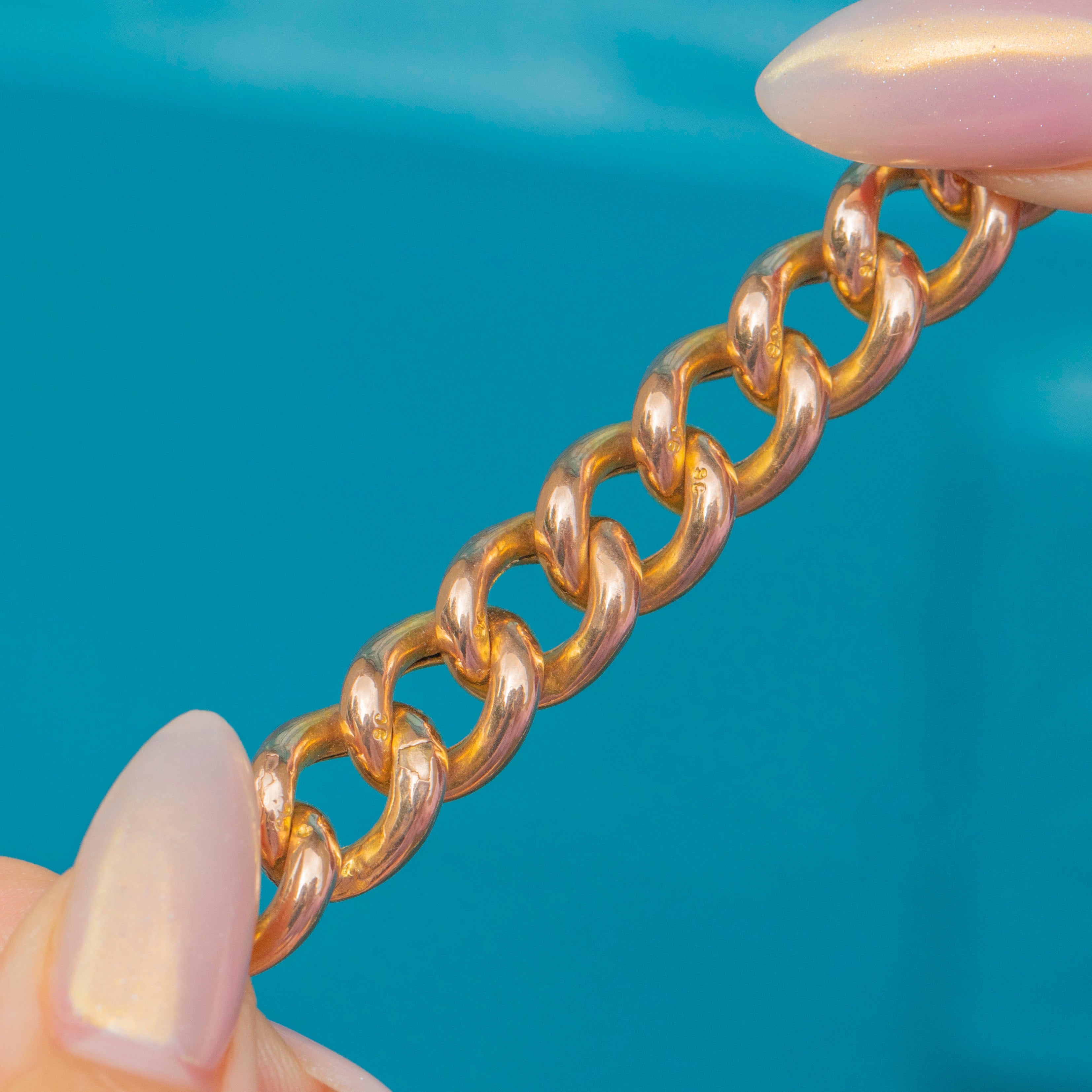 EXCELLENT: The Gold links are in beautiful condition with no dings or dents, retaining their original shape and polish. The padlock clasp is in secure working order, and the safety chain remains intact. Minimal wear overall, a superbly preserved antique bracelet.
