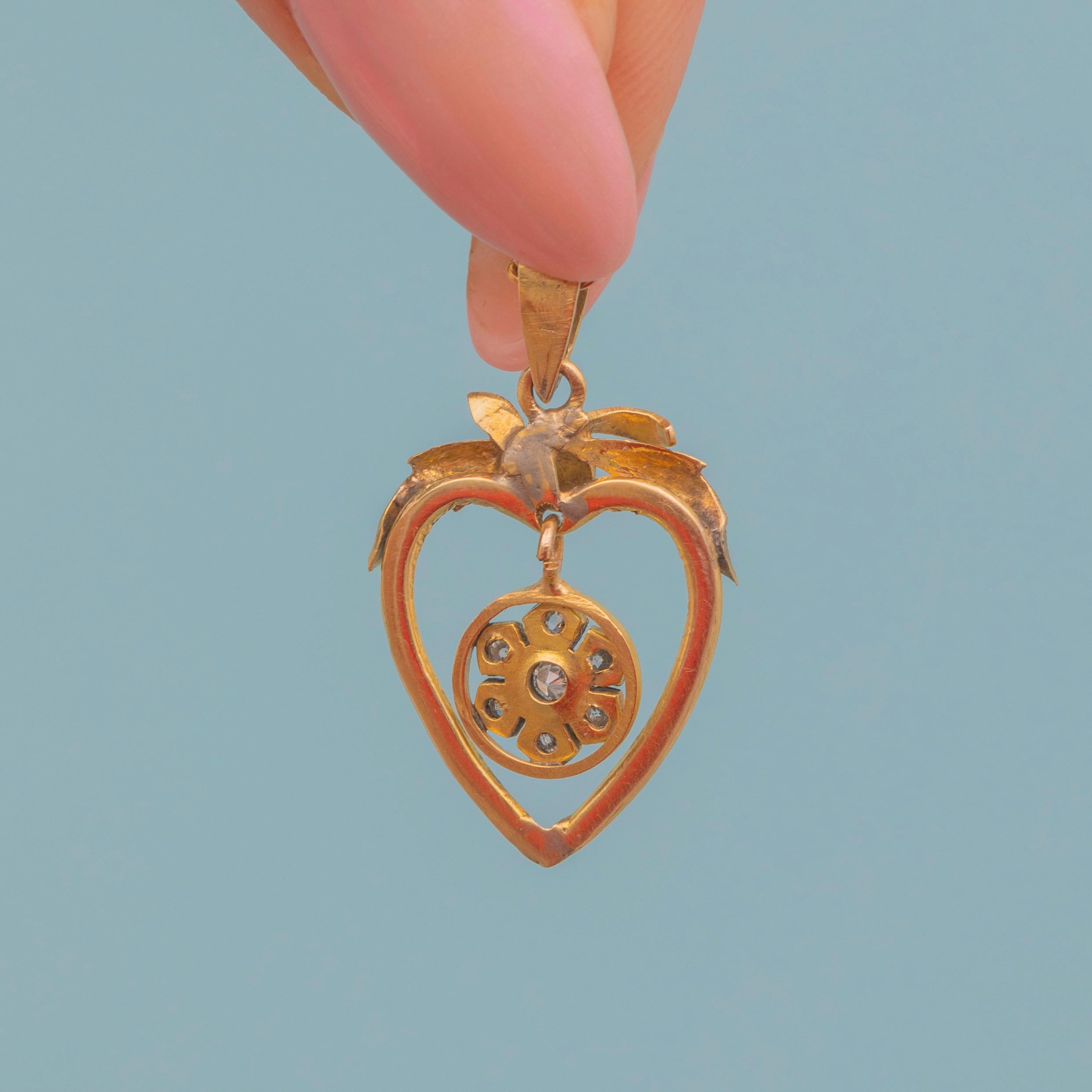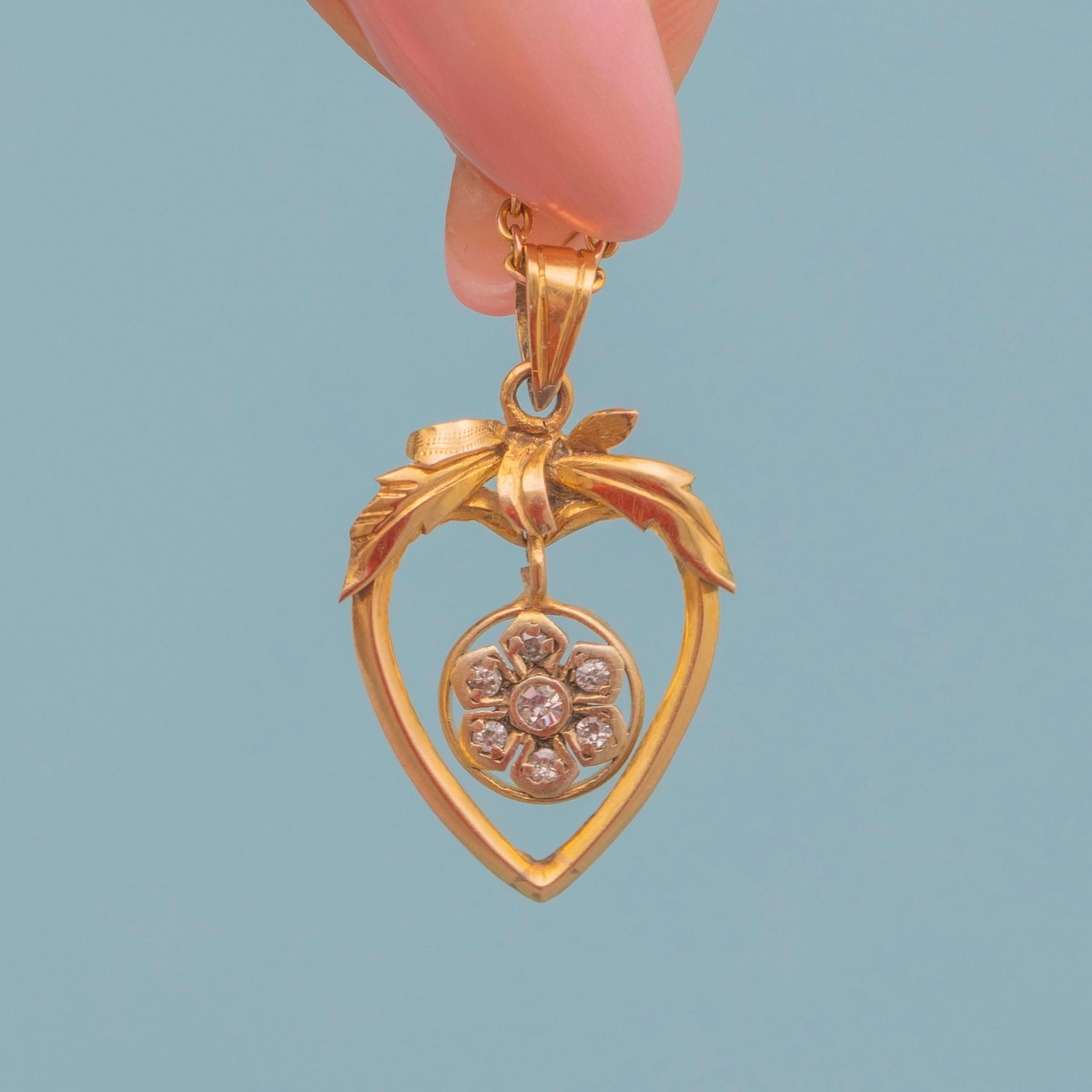 Antique 9ct Gold Diamond Flower Heart Drop Pendant, Ribbon Top